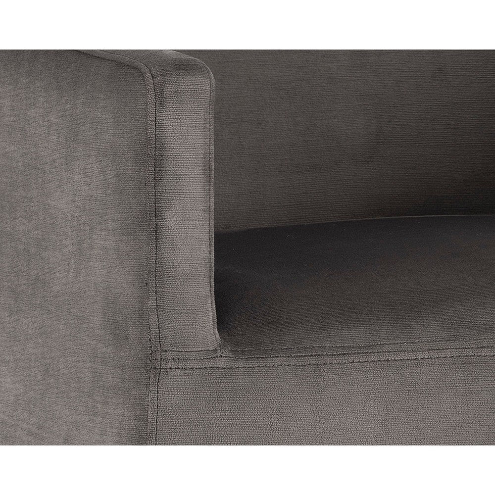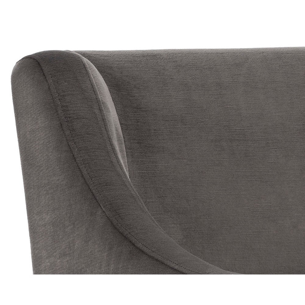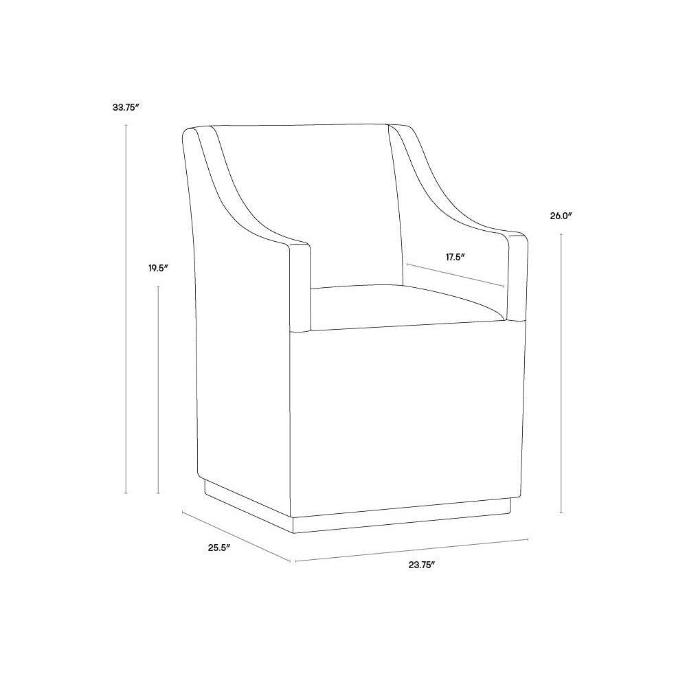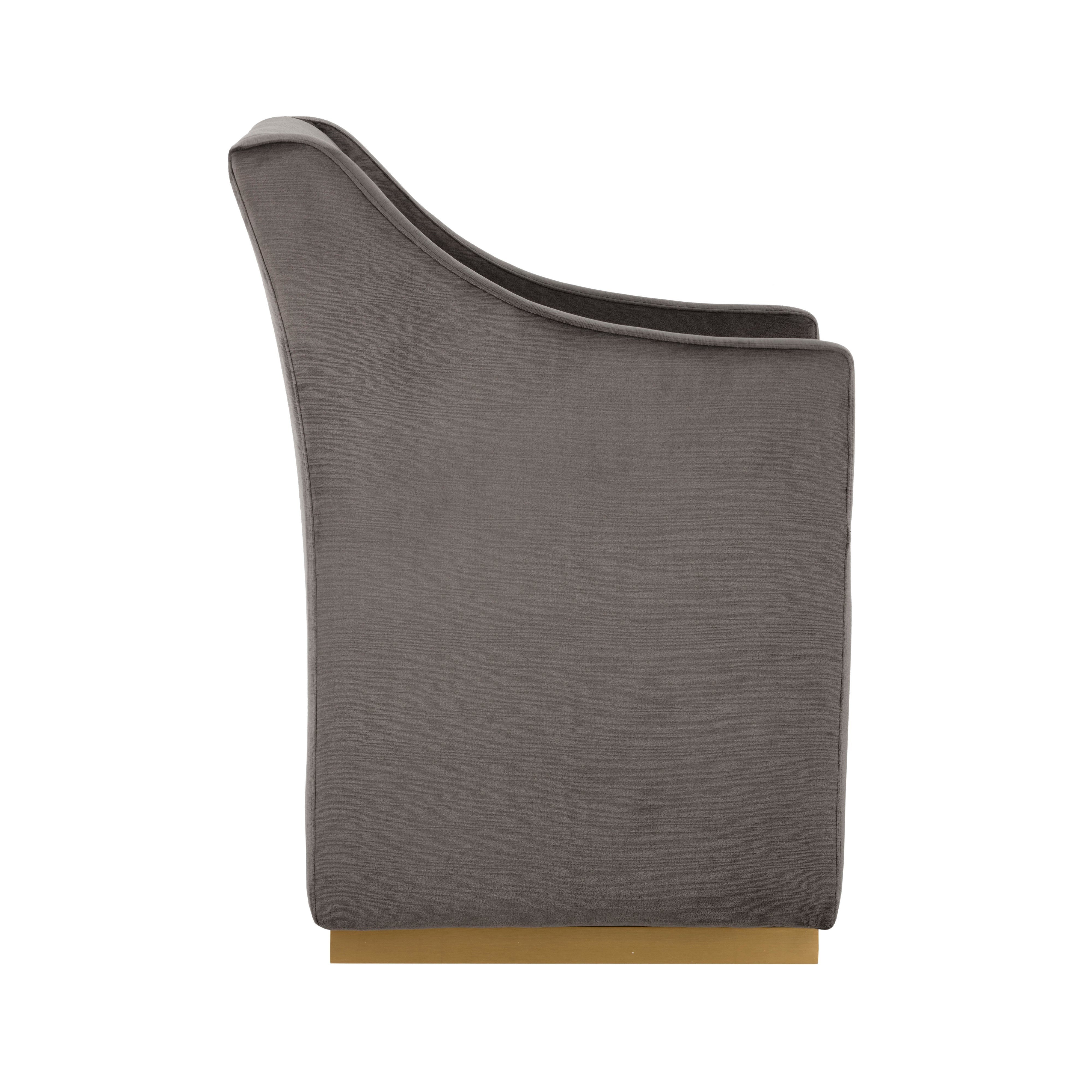 An eye-catching, ultra glamourous wheeled dining chair. Stocked in our piccolo pebble performance fabric with a brushed brass steel frame. Sophistication and comfort fit for various dining and lounge spaces. Performance fabric is moisture repellent, durable and easy to clean.