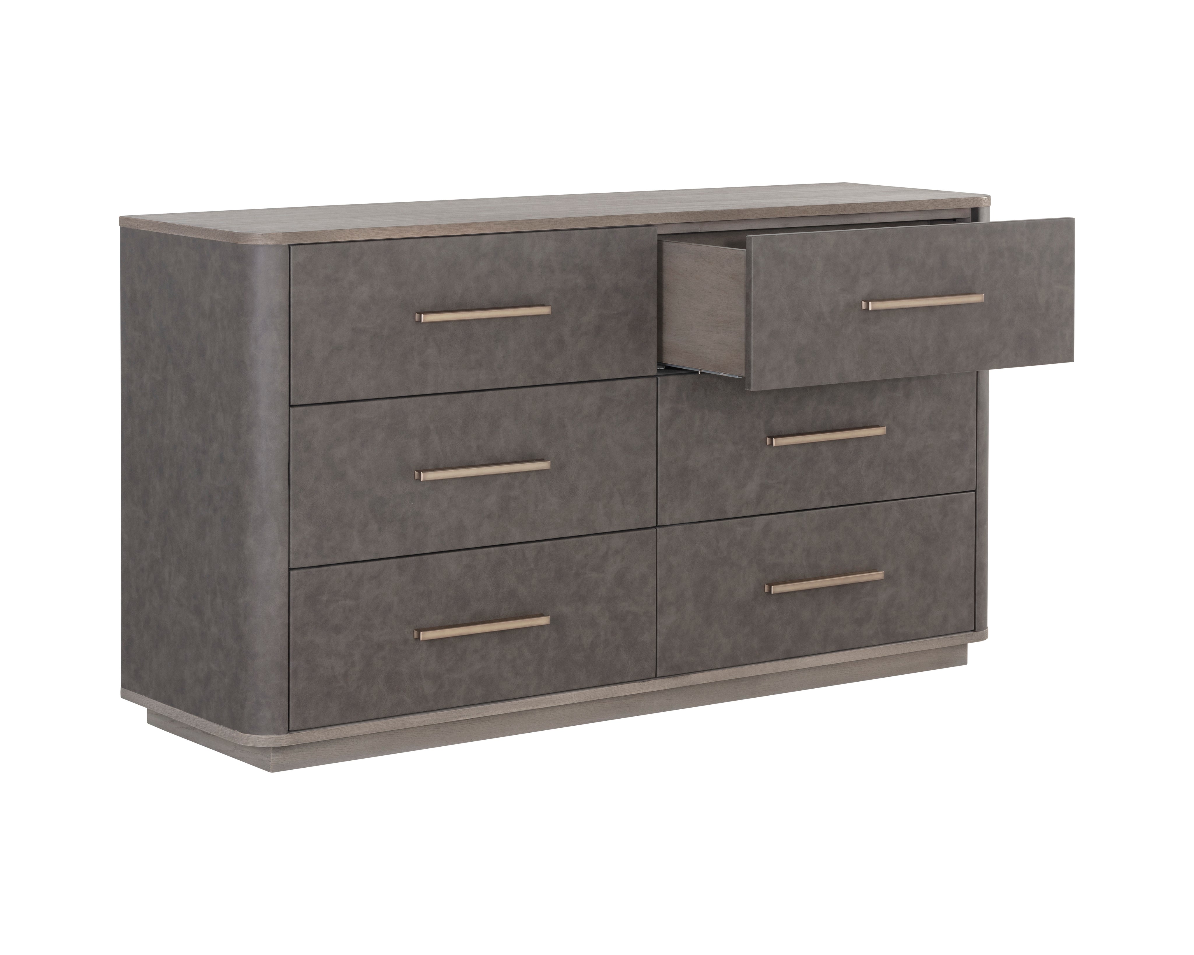 With clean lines and an alluring textured look, the Altman Dresser reflects a refined expression of shape and form. Designed with a faux leather wrapped frame and six soft closing drawers. A dark grey oak veneer wood top and brass stainless steel hardware complete the look.