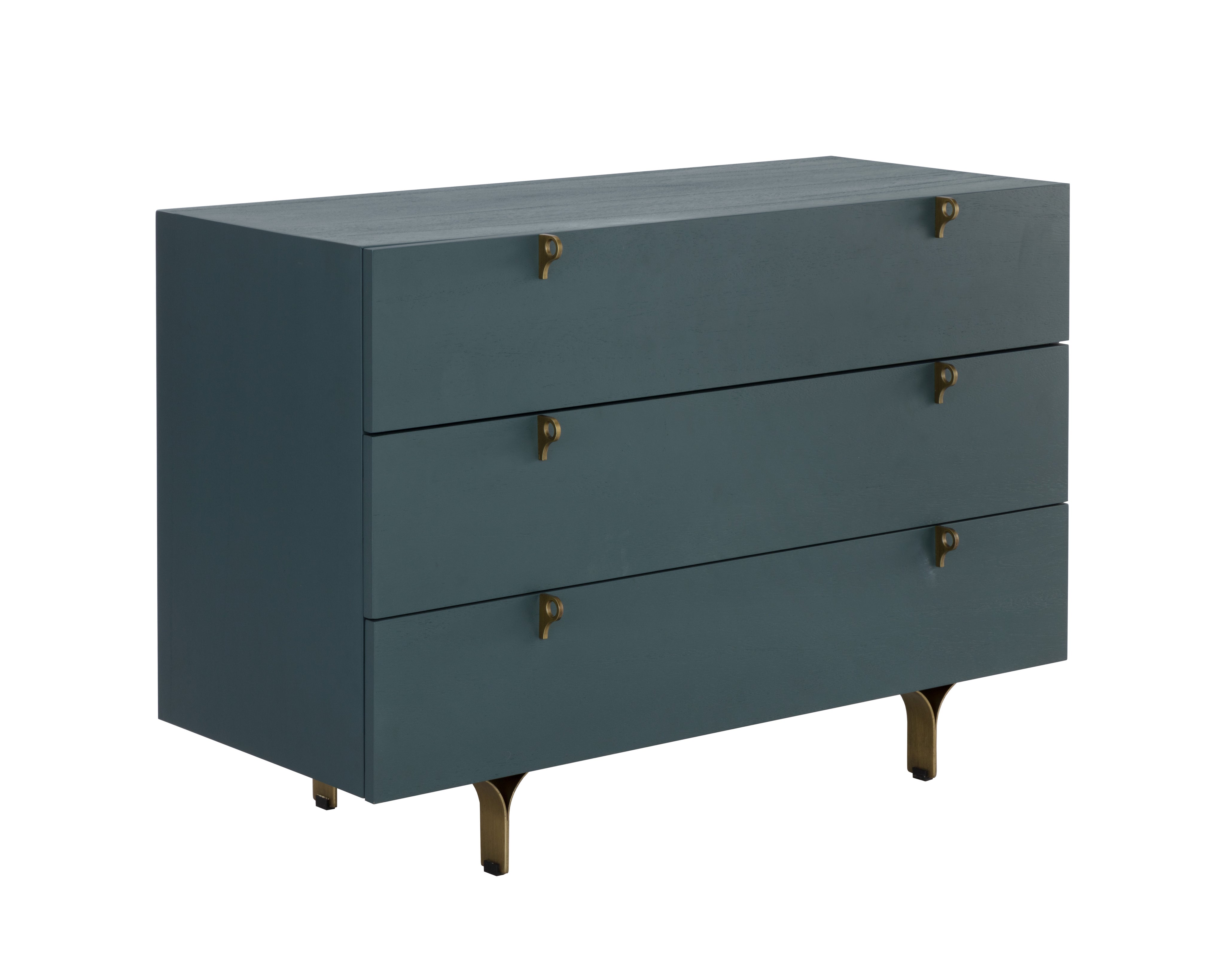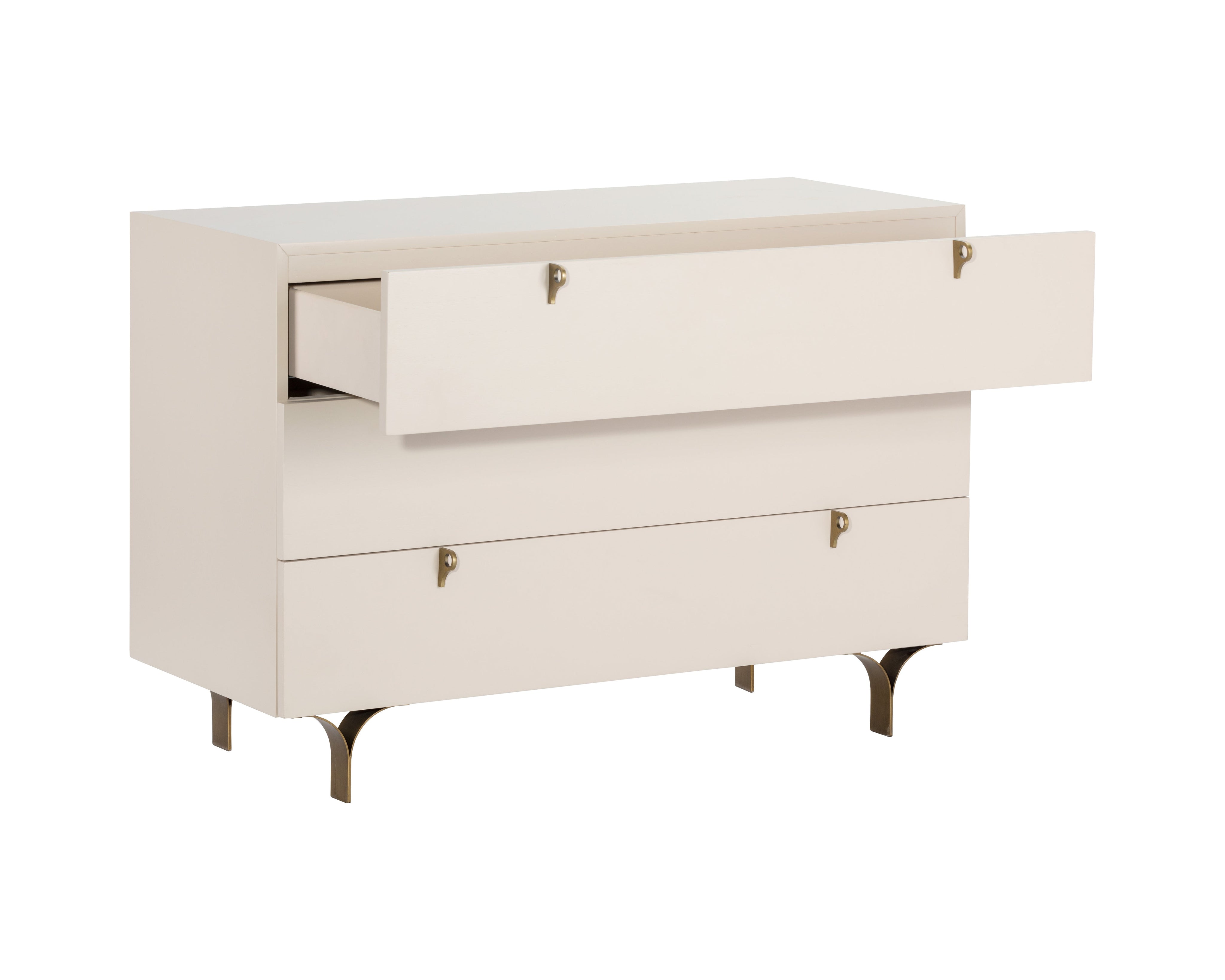 Add beauty to your bedroom oasis with this stylish dresser. Designed with three drawers crafted from rubberwood, featuring a subtle wood grain and a painted cream finish. Uniquely sculpted antique brass feet and drawer pulls complete the look. As wood is an organic, porous material, these pieces will contain natural variation of texture and may also exhibit fine indentations and cracks. Wood pieces will also display a disparity of colour and grain, and visible knots and burls that add to the character of each piece.