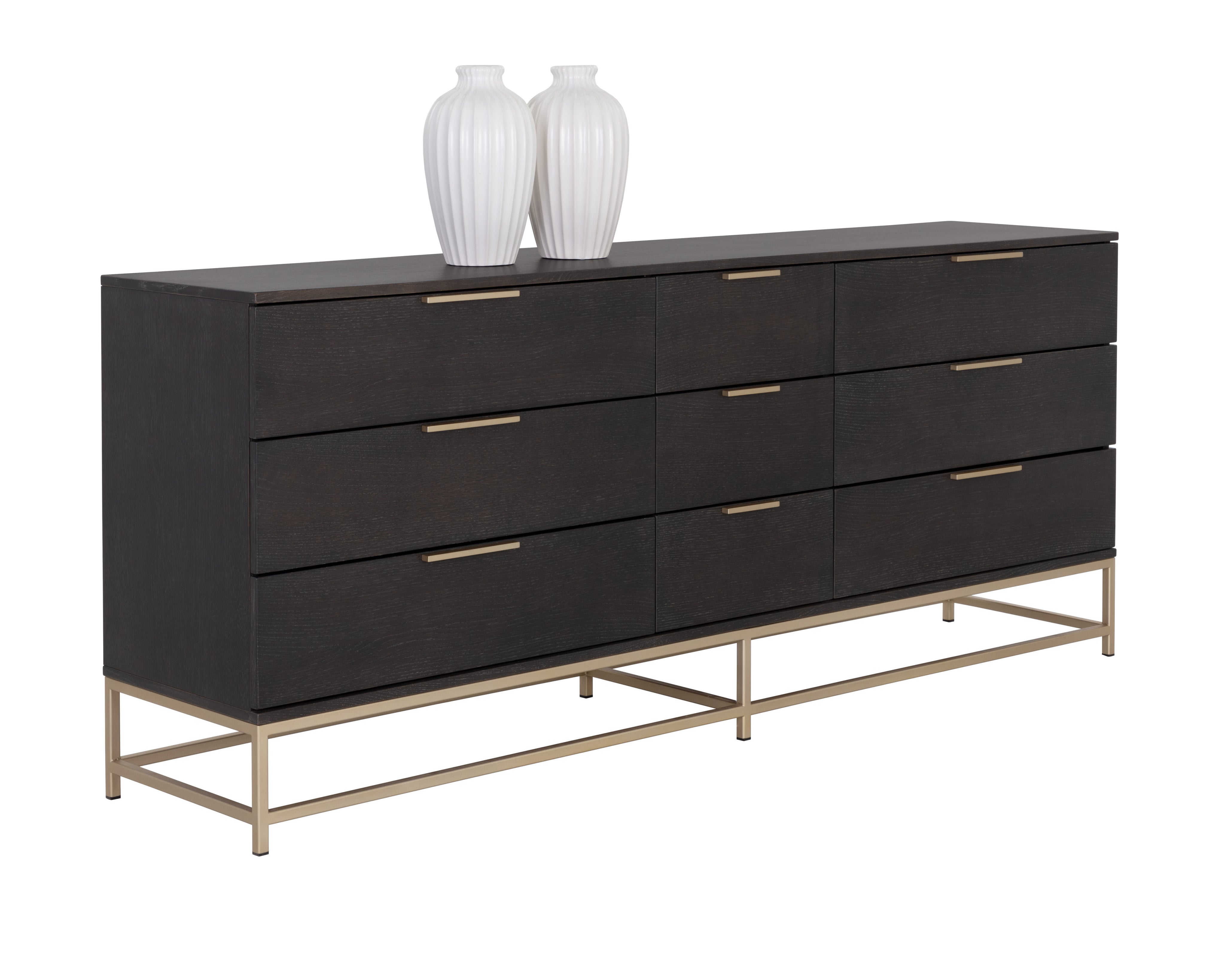 A modern dresser designed to add a beautiful touch to the bedroom. Crafted from charcoal grey oak veneer with nine soft closing drawers for ample storage. Brushed gold iron hardware completes the look. As wood is an organic, porous material, these pieces will contain natural variation of texture and may also exhibit fine indentations and cracks. Wood pieces will also display a disparity of colour and grain, and visible knots and burls that add to the character of each piece.