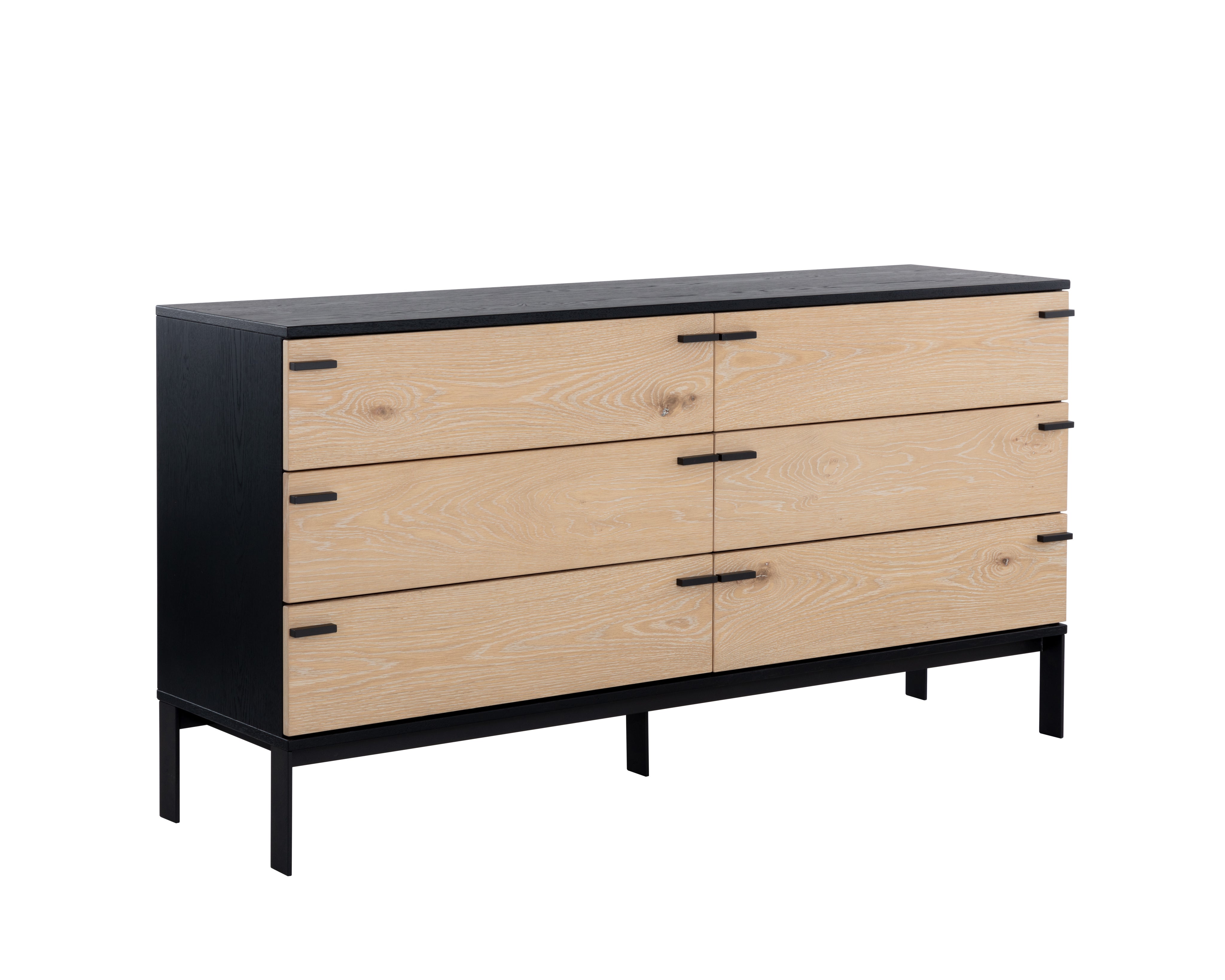 A dresser that evokes a modern industrial design, making it perfect for any bedroom space. Features a black wood frame with drawers in a brown rustic oak veneer. Completed with a matte black iron legs and aluminum handles. Anti tipping kit included. As wood is an organic, porous material, these pieces will contain natural variation of texture and may also exhibit fine indentations and cracks. Wood pieces will also display a disparity of colour and grain, and visible knots and burls that add to the character of each piece.