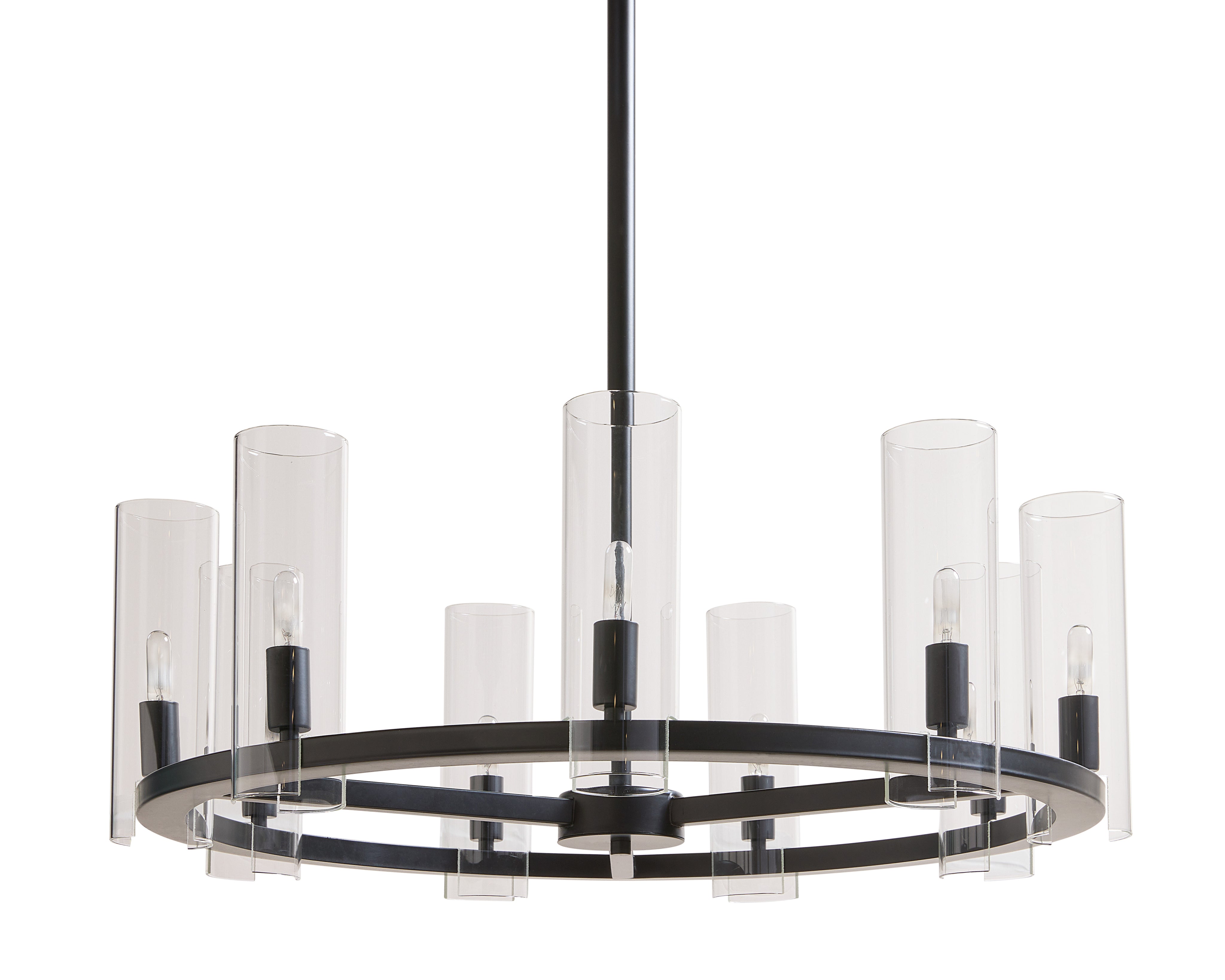 Brighten up any space with this small, sophisticated chandelier that invokes timeless elegance. Crafted with a metal wheel frame in a black metal finish and features clear glass cylinder shades.