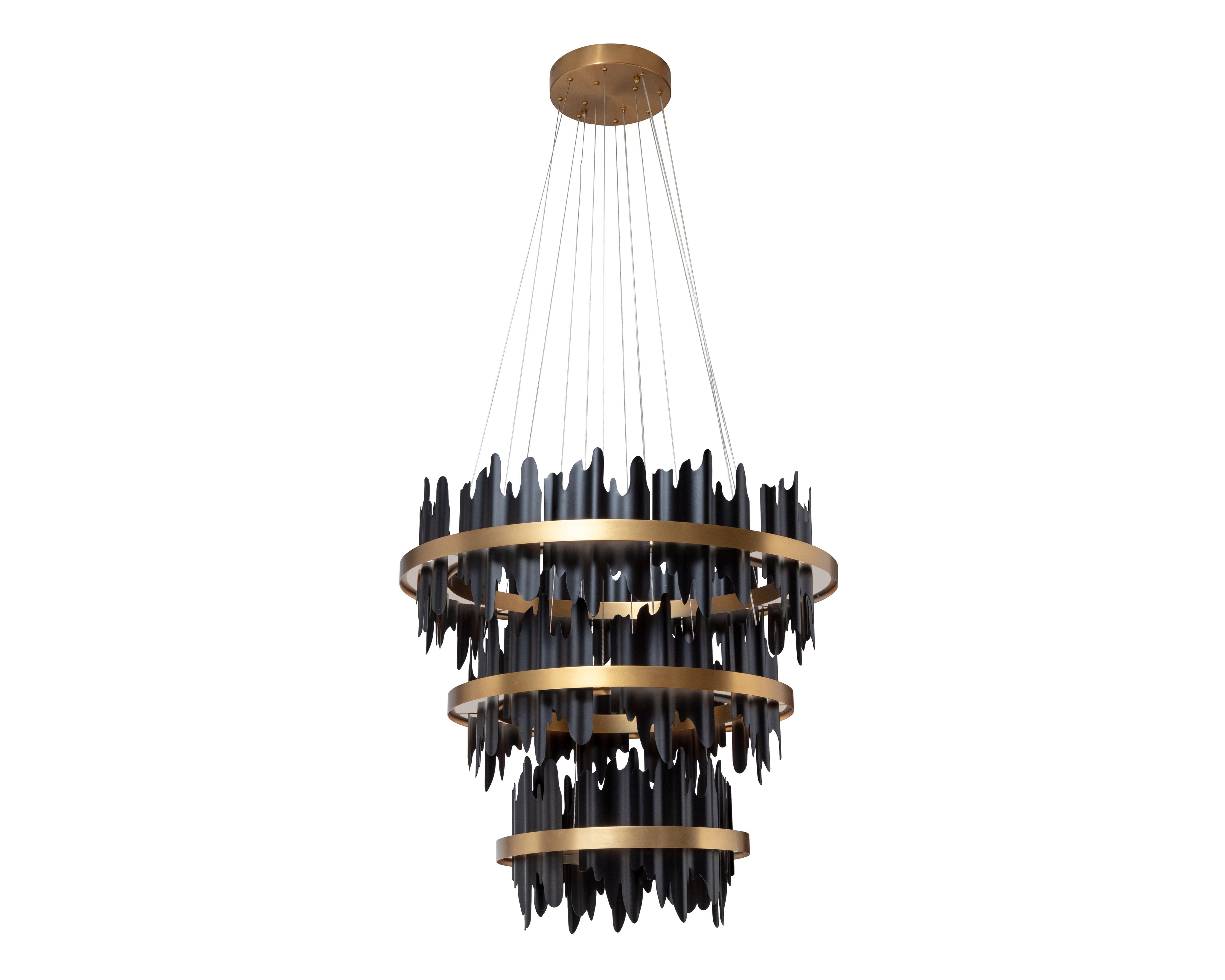 Eye-catching and intriguing, the Icarcus Chandelier brings a moody ambience to any space. Matte black metal pieces are carefully inserted within the brushed gold aluminum bands to give off a striking presence.