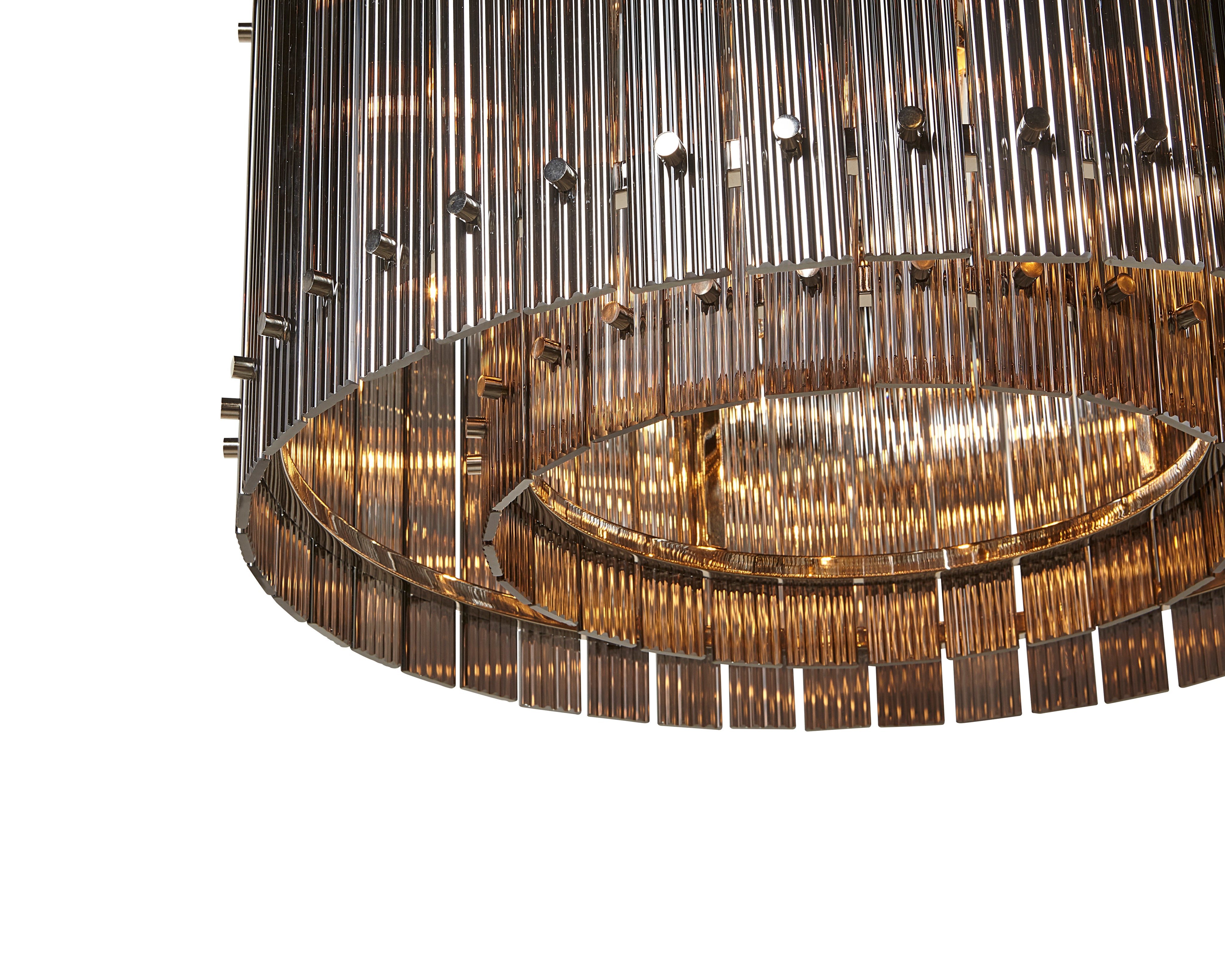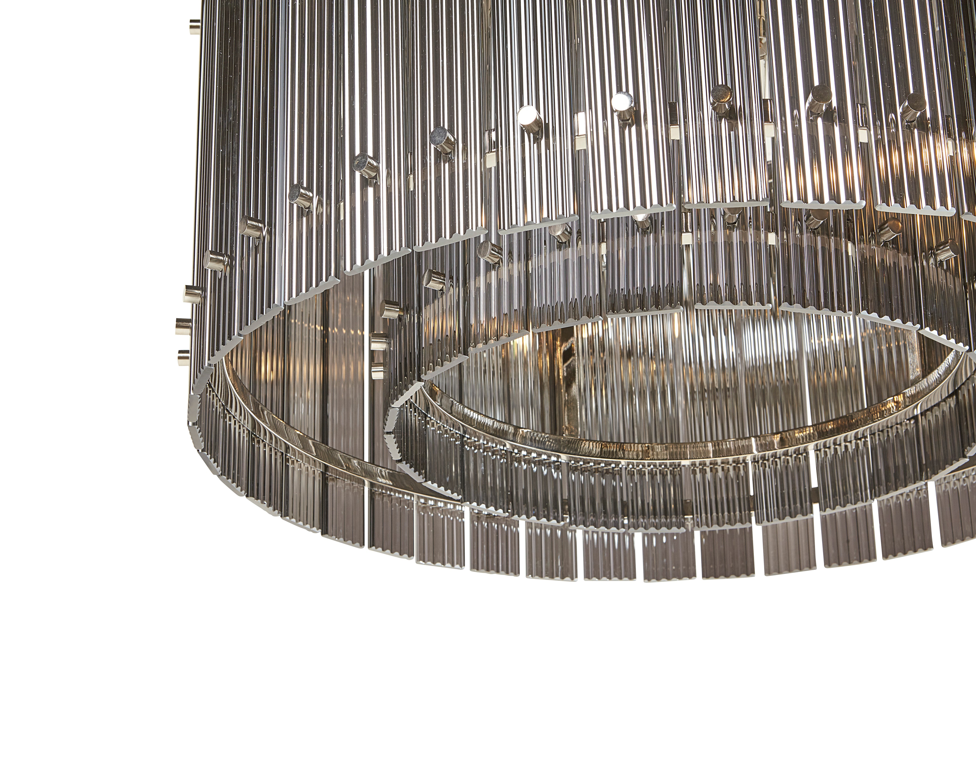 Dazzling and eye-catching, this small, modern chandelier will add a stunning display of radiance to any space. Features a smoke grey fluted glass design with a complementing metal frame in a nickel finish.