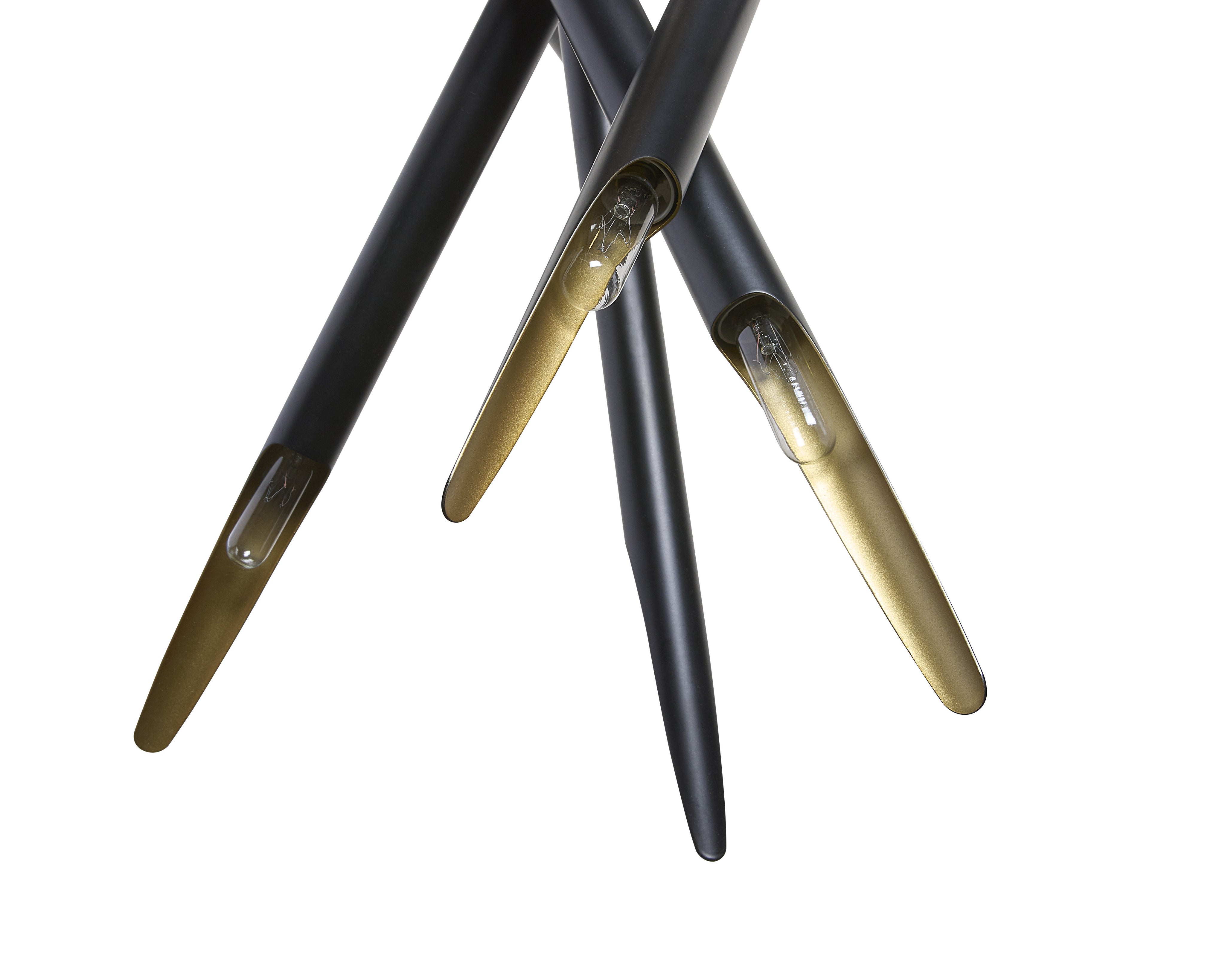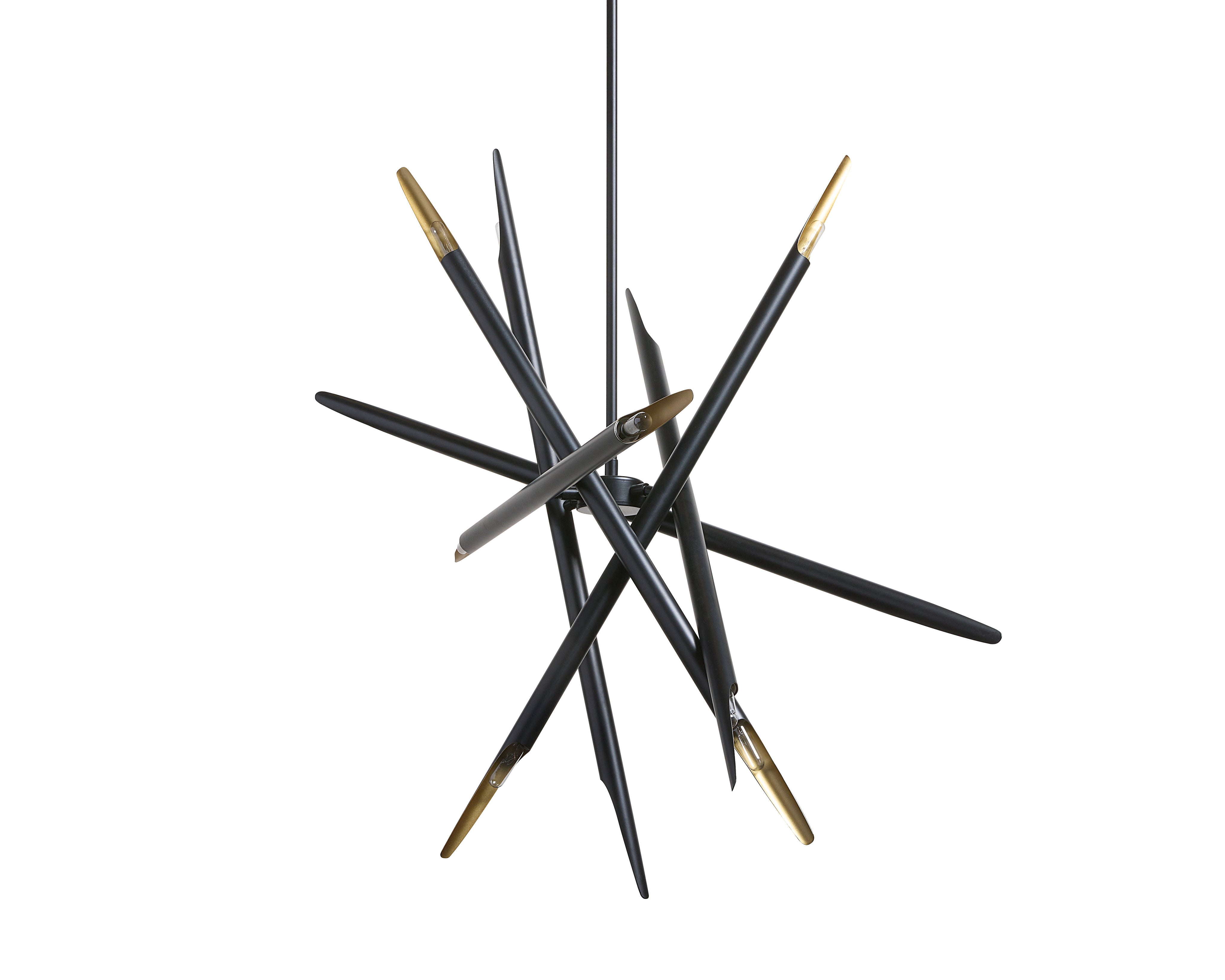 Taking inspiration from mid-century modern design, this fascinating chandelier will add a unique touch to any space. Crafted with a matte black metal exterior frame with accenting gold finish in the interior.