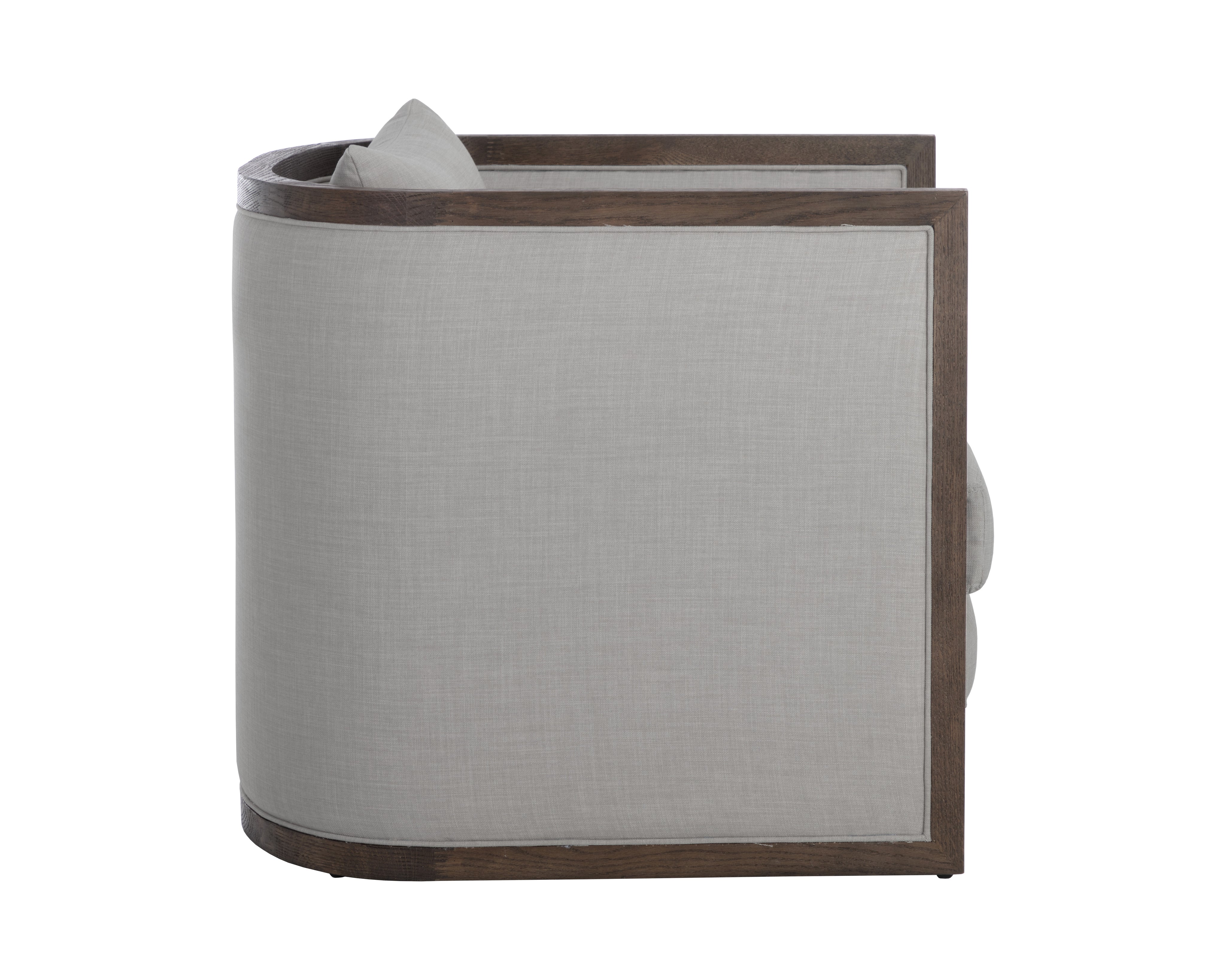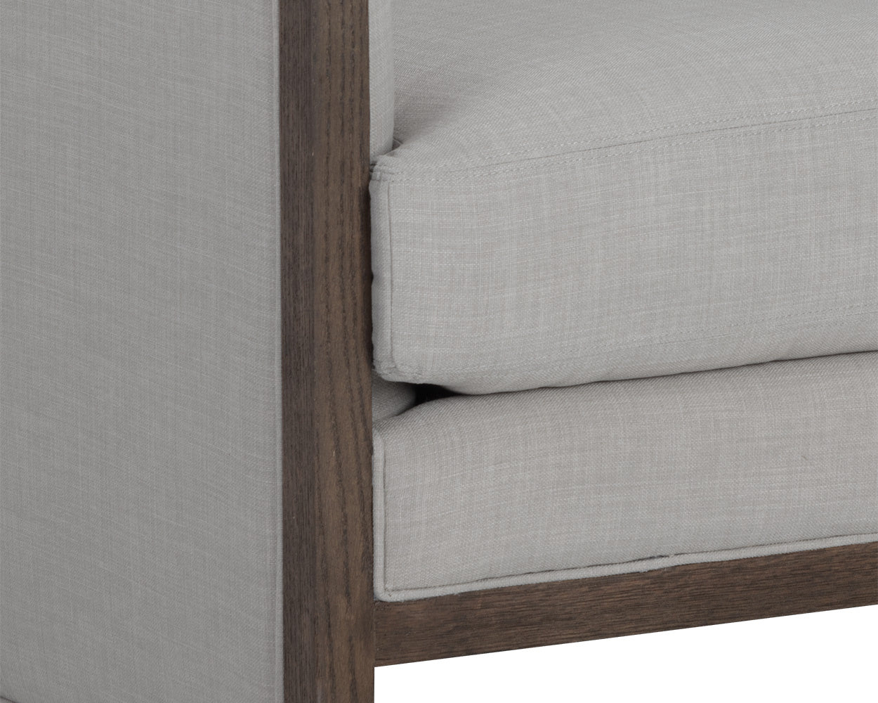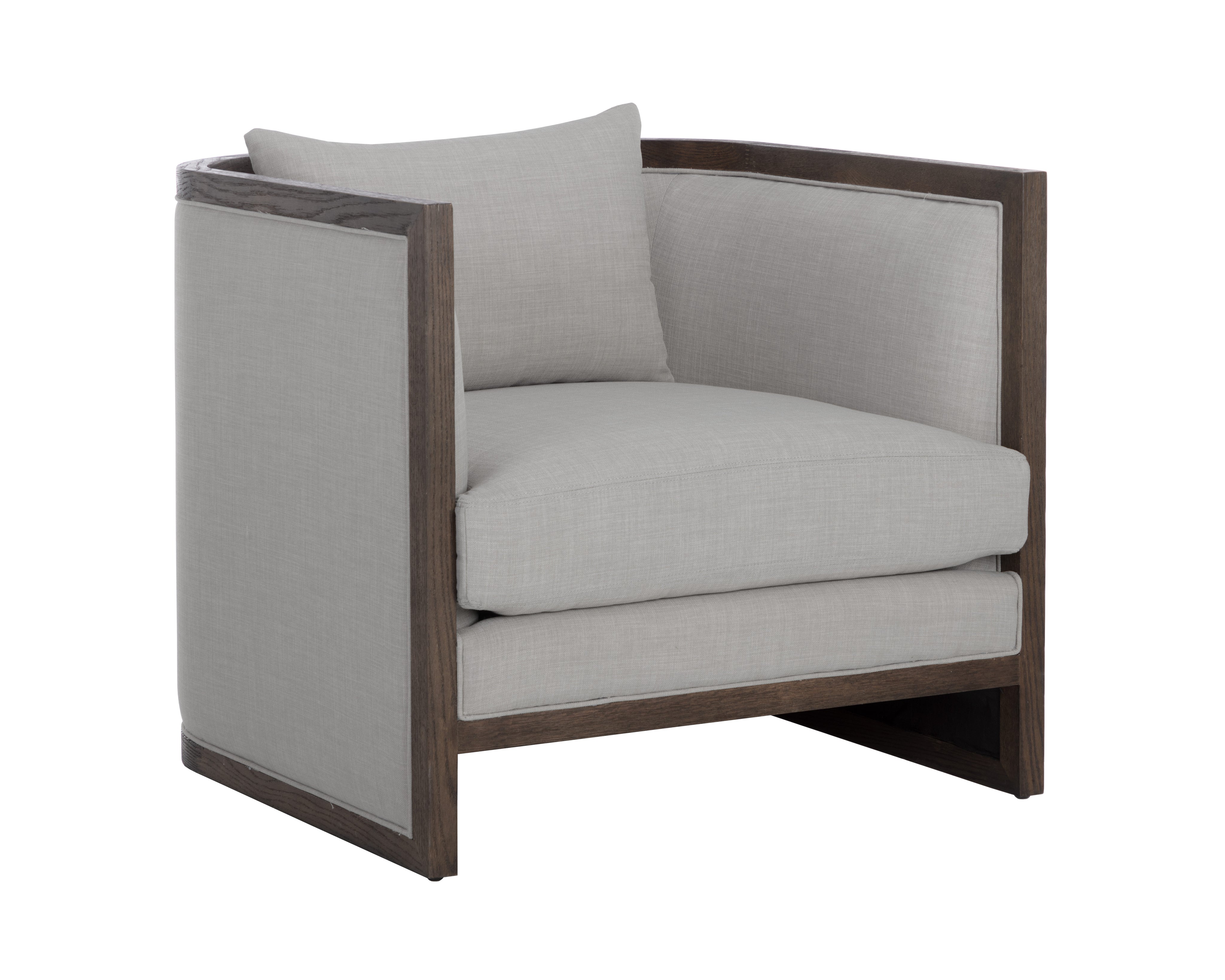 A stylish and uniform design defines this classic lounge chair that is full of charm. Upholstered in linoso light grey performance fabric with a distressed brown solid oak wood exposed frame. Performance fabric is moisture repellent, durable and easy to clean. As wood is an organic, porous material, these pieces will contain natural variation of texture and may also exhibit fine indentations and cracks. Wood pieces will also display a disparity of colour and grain, and visible knots and burls that add to the character of each piece.