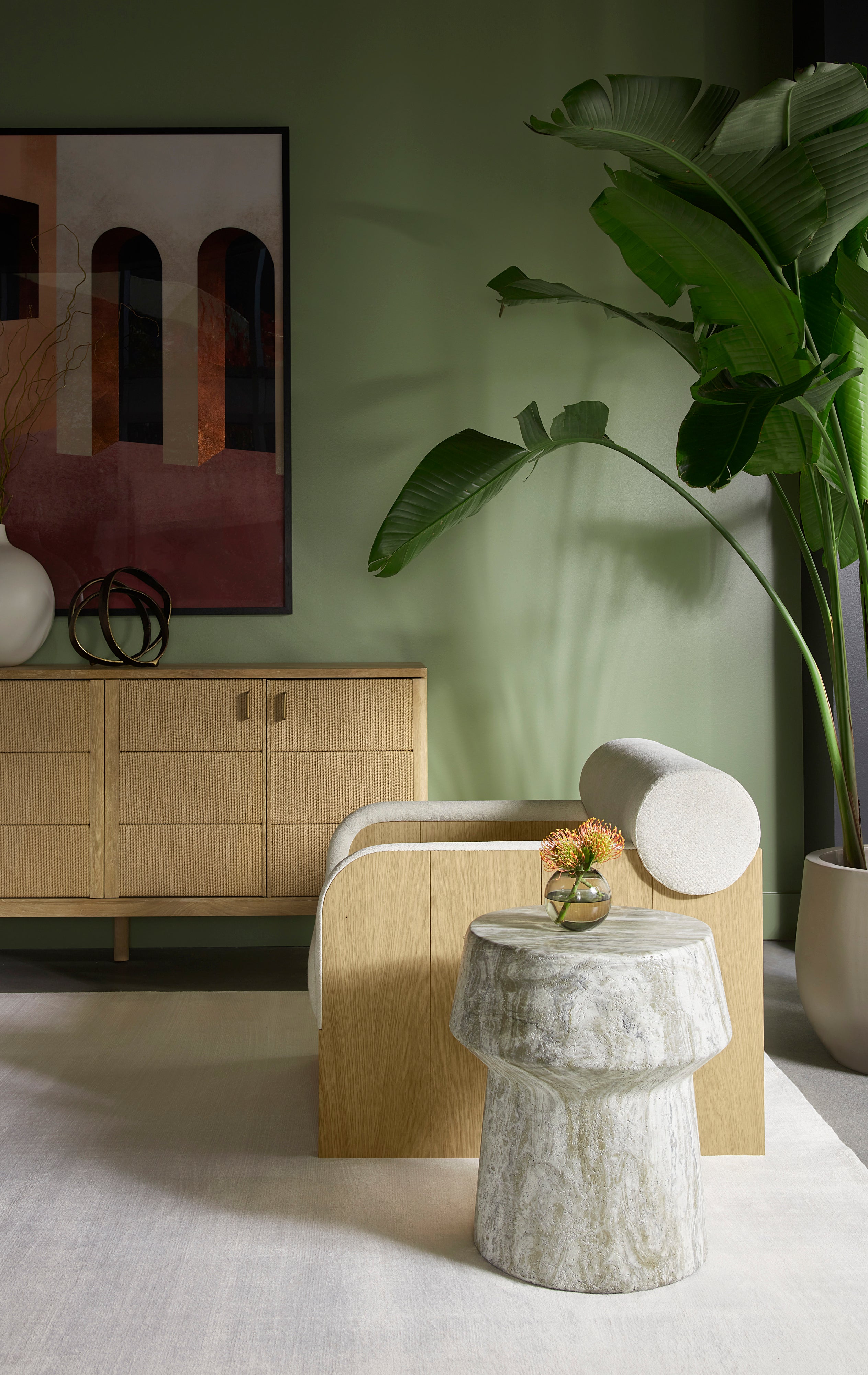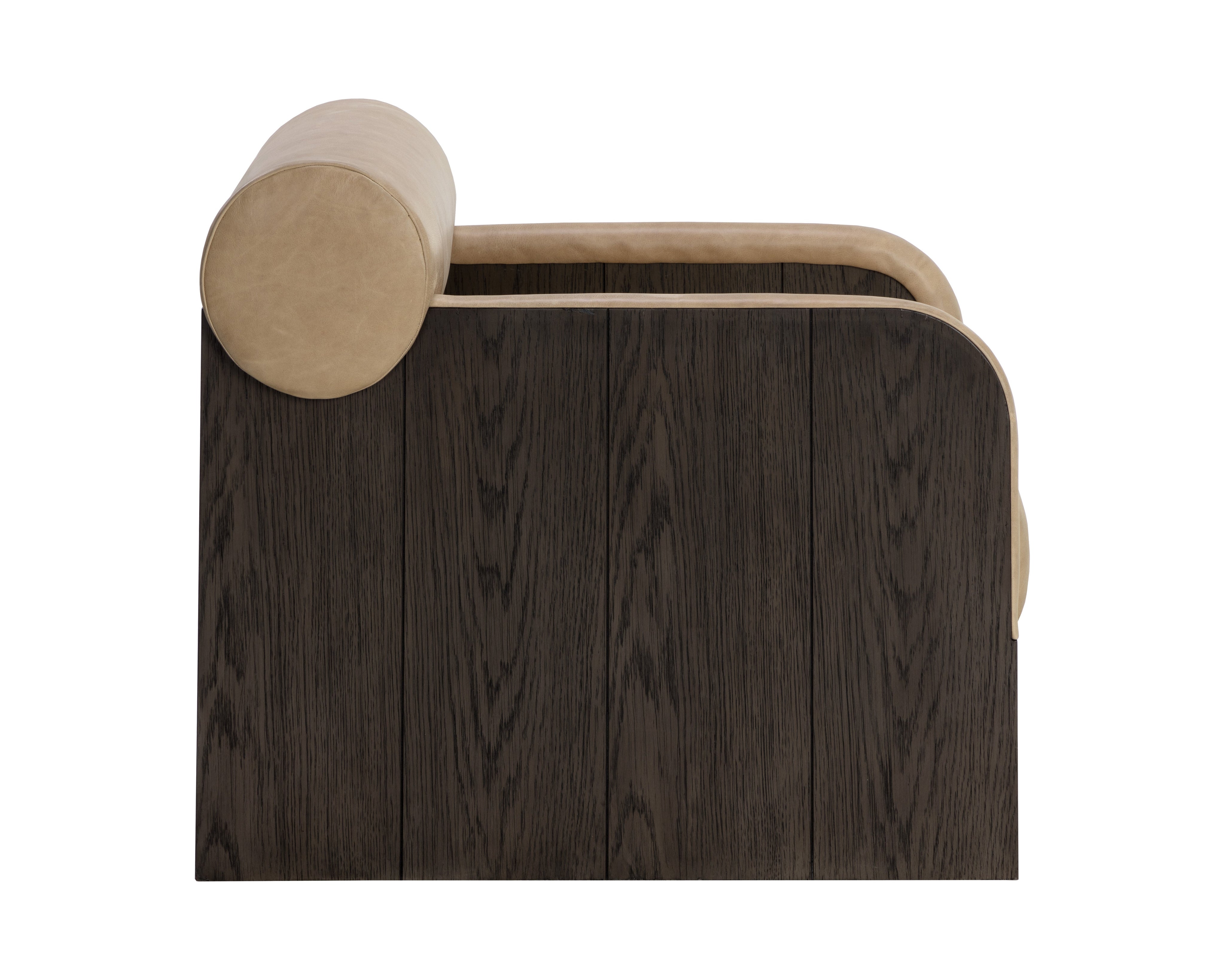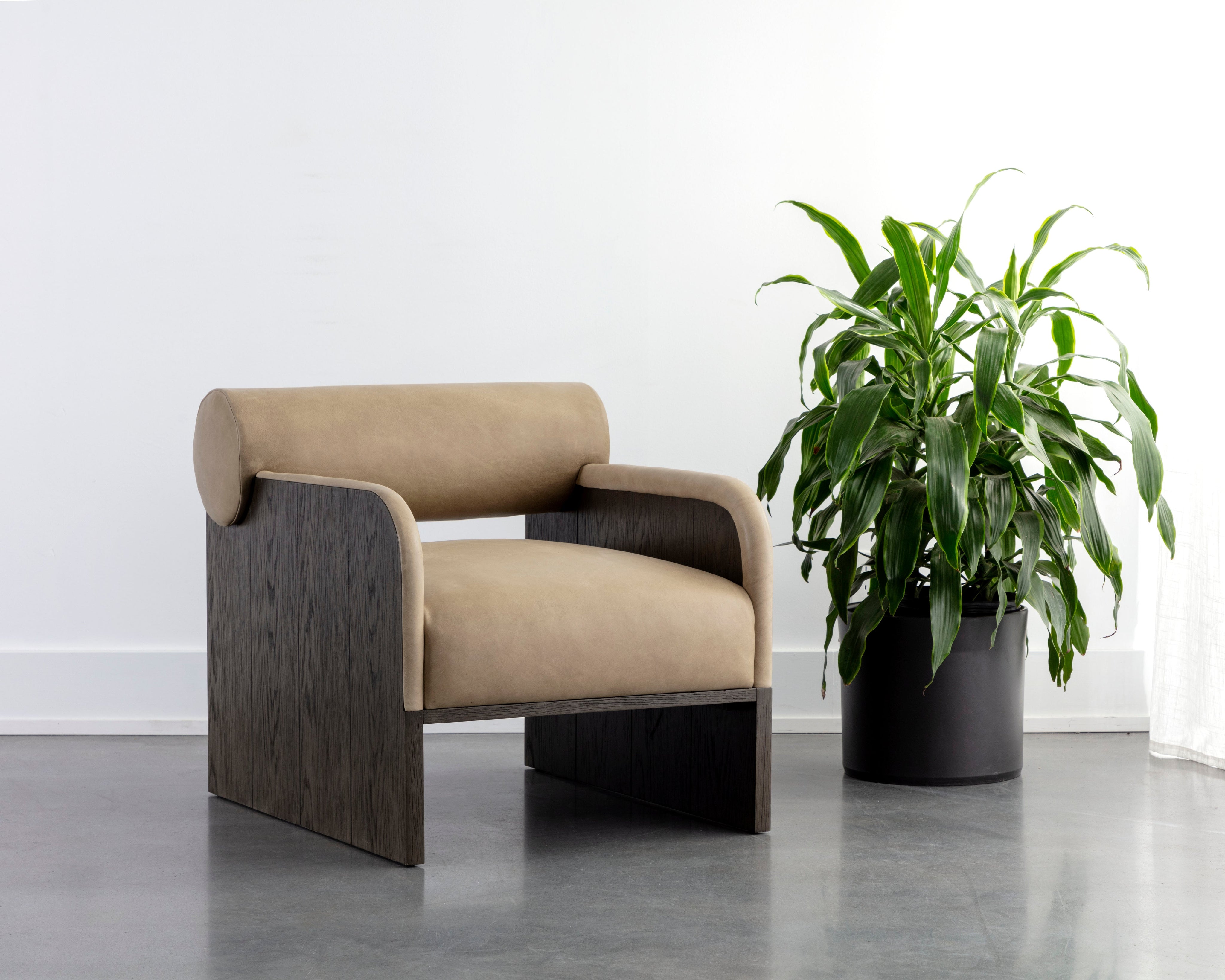 The Coburn Lounge Chair is a fresh take on contemporary comfort. A bolster back and deep seat upholstered in our soft eclipse white fabric make this piece an inviting addition to any space. Matching fabric trim on the rounded arms adds extra charm to the overall look. Completed with a rustic oak wood veneer legs carefully selected for its distinctive wood graining. As wood is an organic, porous material, these pieces will contain natural variation of texture and may also exhibit fine indentations and cracks. Wood pieces will also display a disparity of colour and grain, and visible knots and burls that add to the character of each piece.