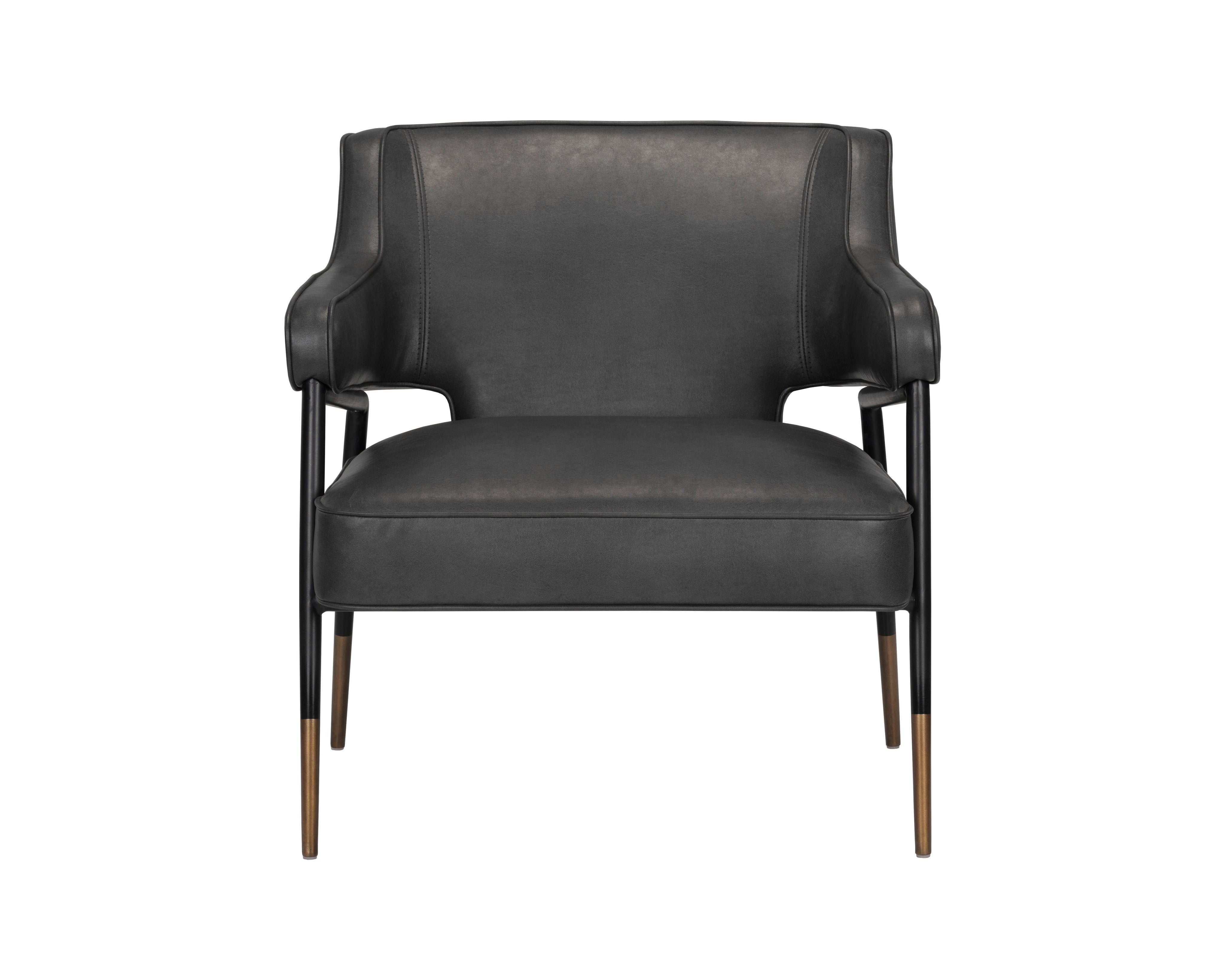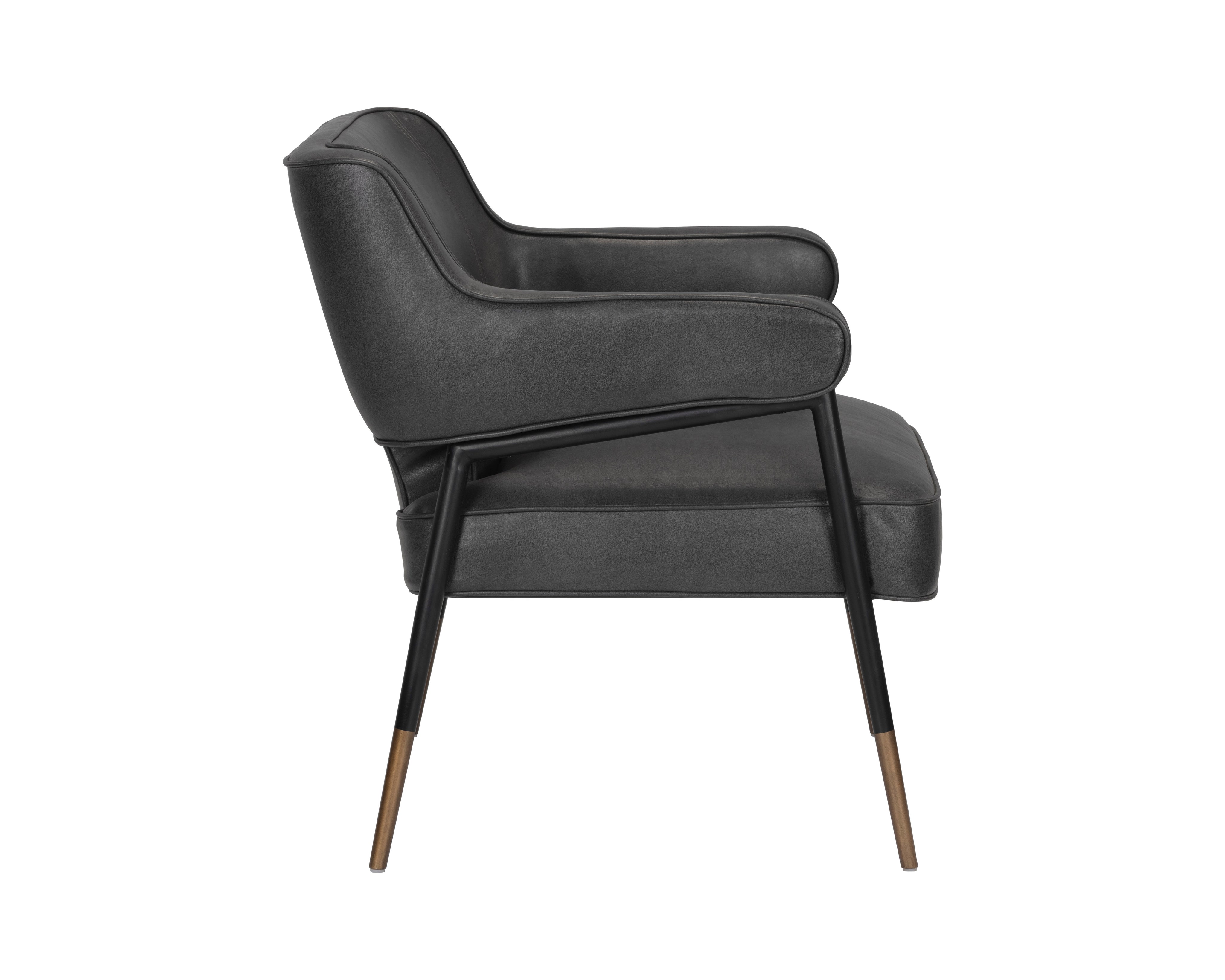 A mid-century inspired lounge chair that sits comfortably. Features a sculpted silhouette upholstered in bravo portabella faux leather. Piping, black steel legs, and gold foot caps complete the look. Handle With Care: This design has been crafted with faux leather. Faux leather is manufactured to reflect the natural characteristics of leather; as such, colour variations, markings, wrinkles, grooves, and light scratches are appreciated characteristics. No two pieces will be alike. Visit our Product Care page for more information on how to ensure the lasting beauty of this piece.