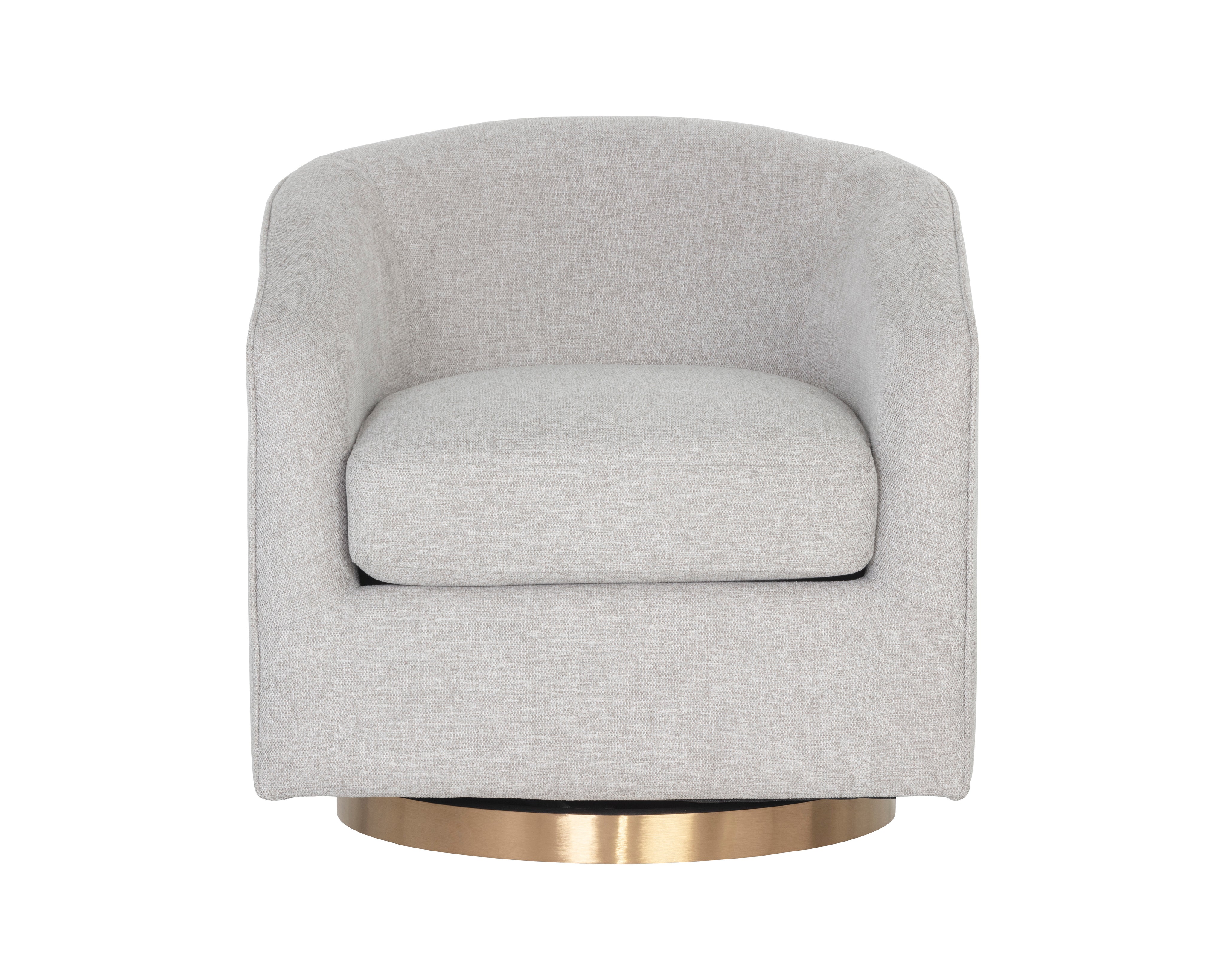 A stylish and comfortable swivel chair perfect for living, lounge and office spaces. Features a barrel back design upholstered in belfast heather grey fabric. A brushed antique brass round base with 360 degree swivel completes the design.