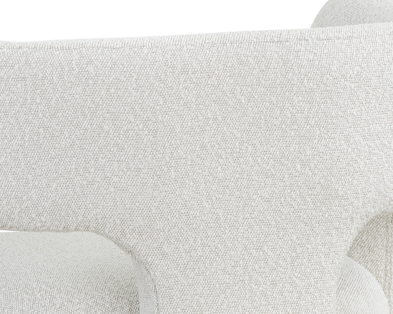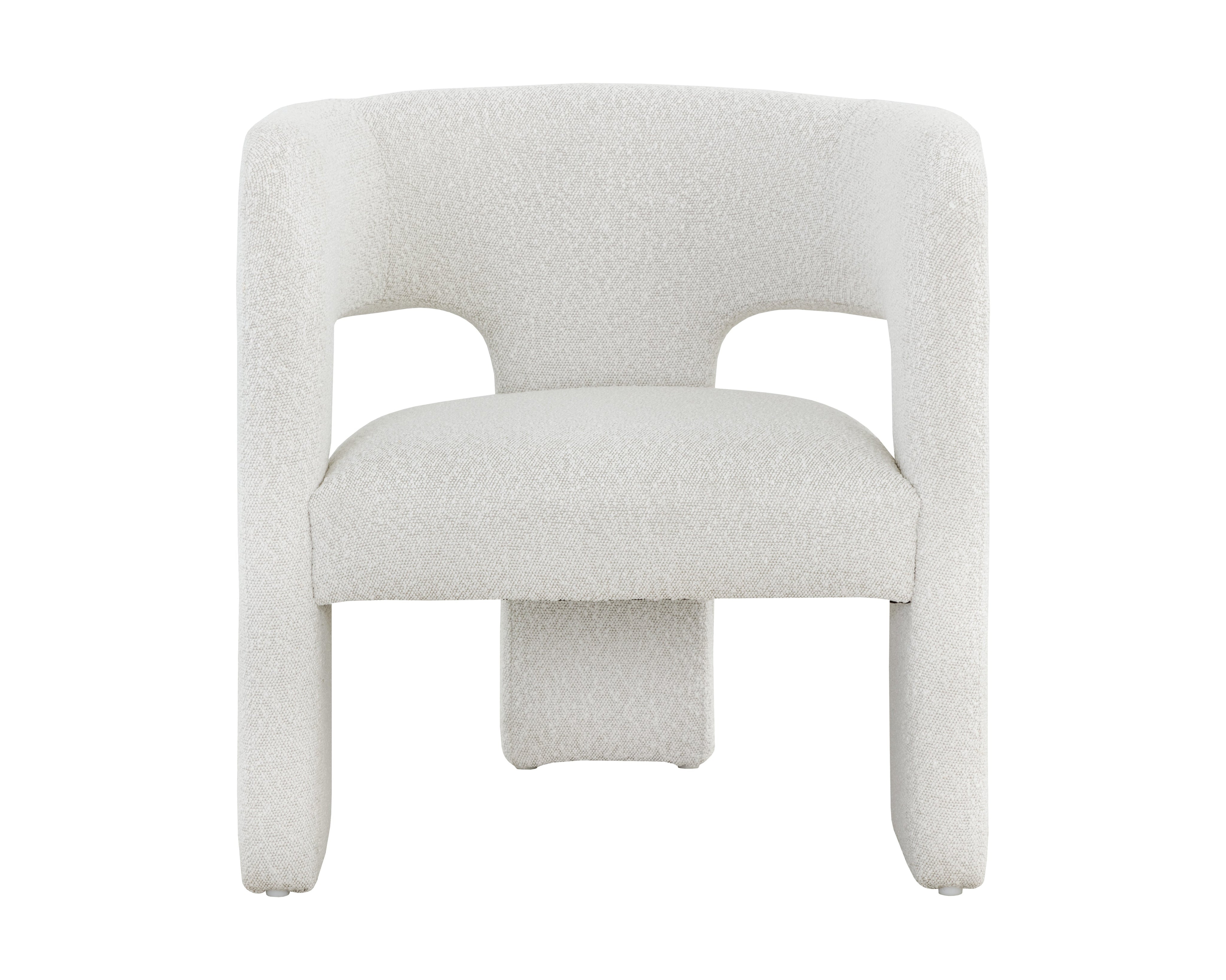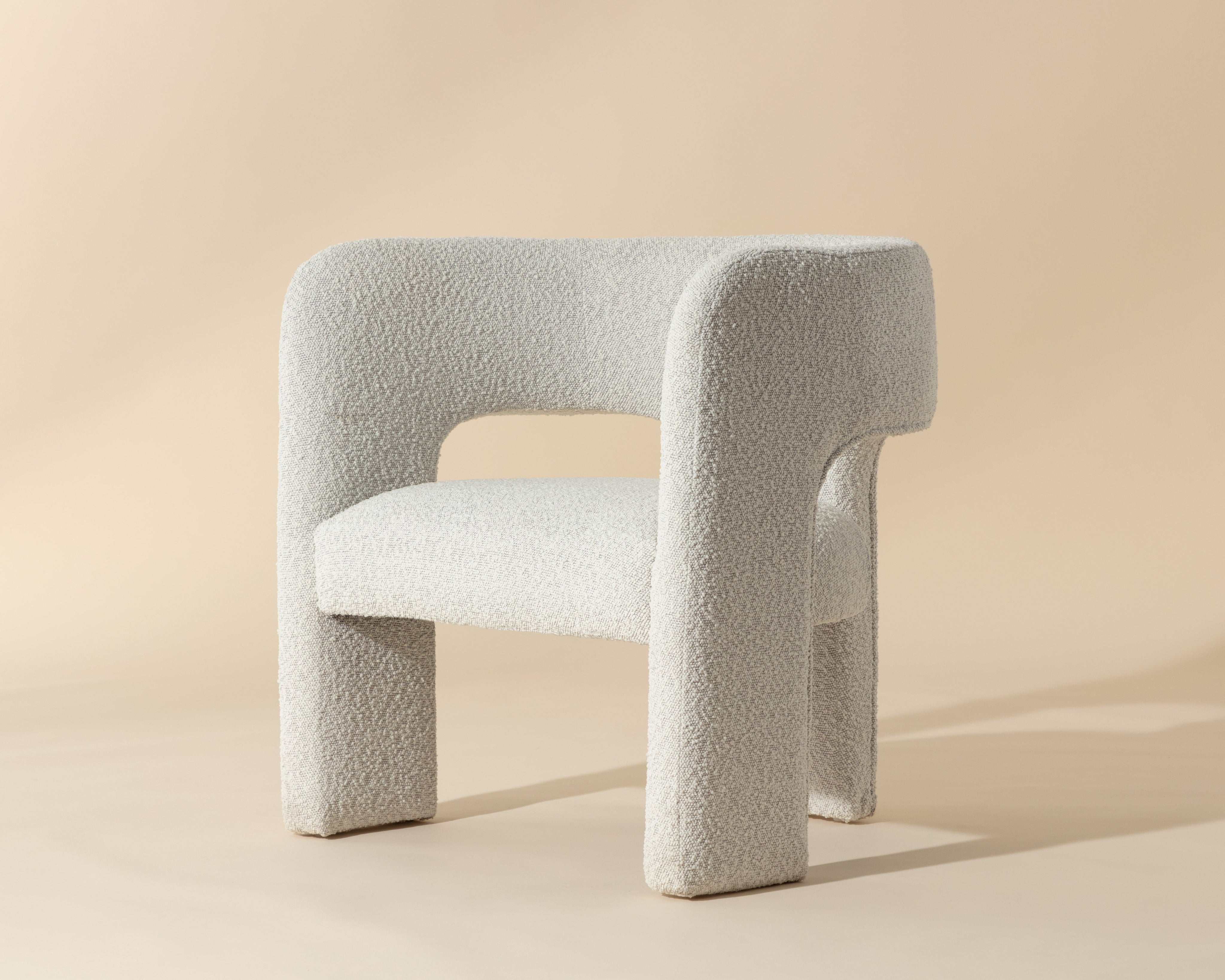 Clean lines and contoured arches add style and structure to this contemporary lounge chair. Features a curved backrest and open back for optimal comfort. Eye-catching from all angles. Fully upholstered in copenhagen white boucle fabric.