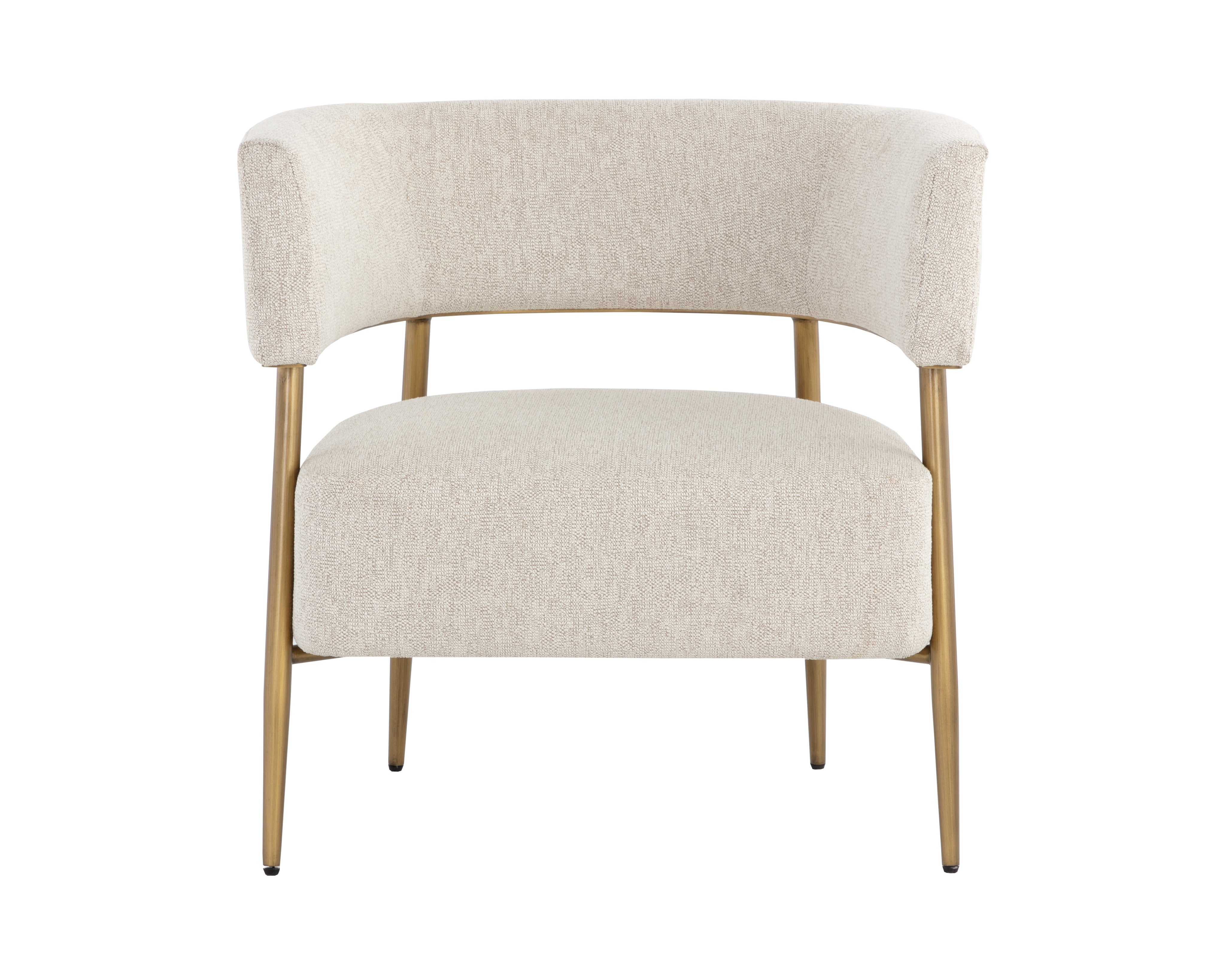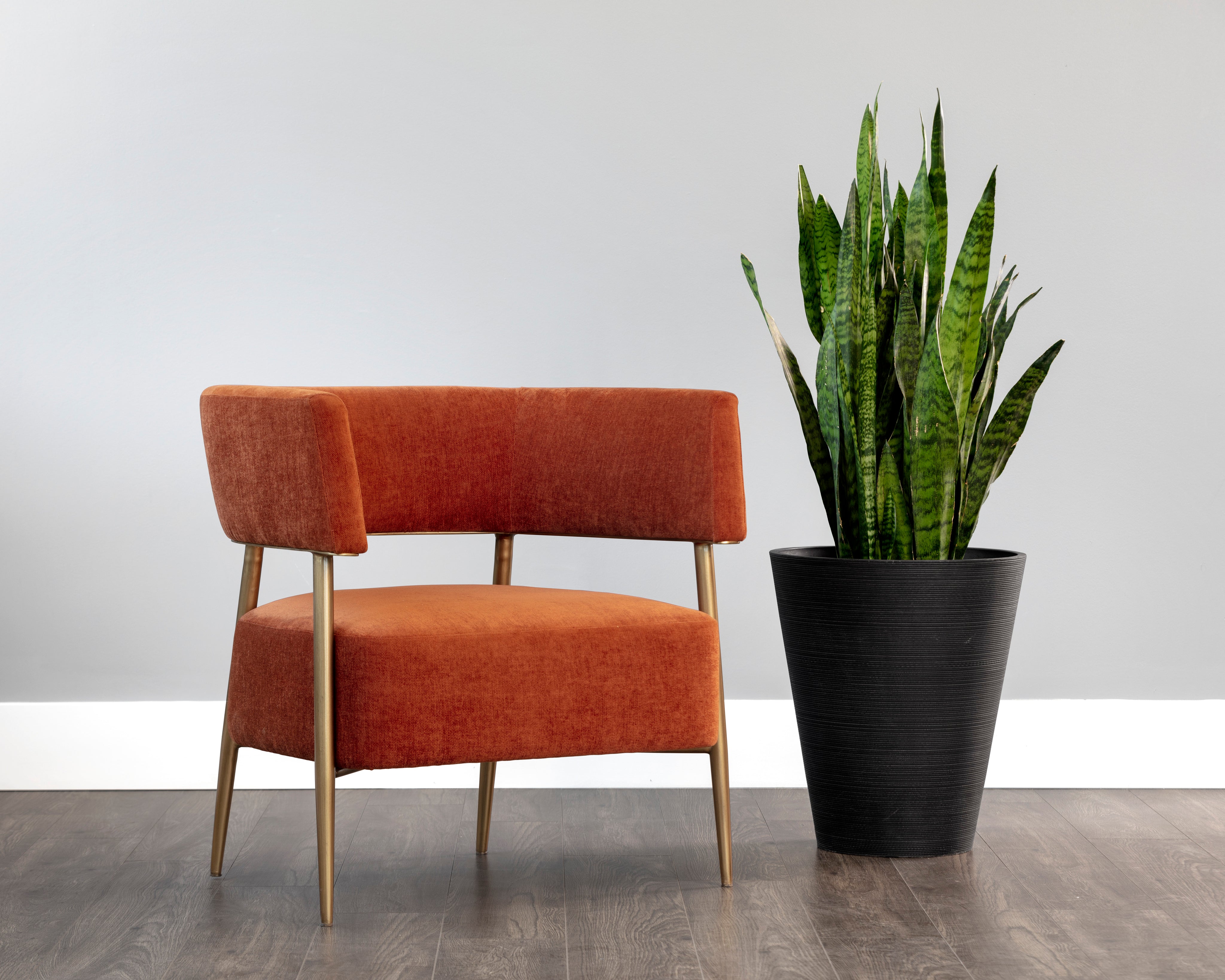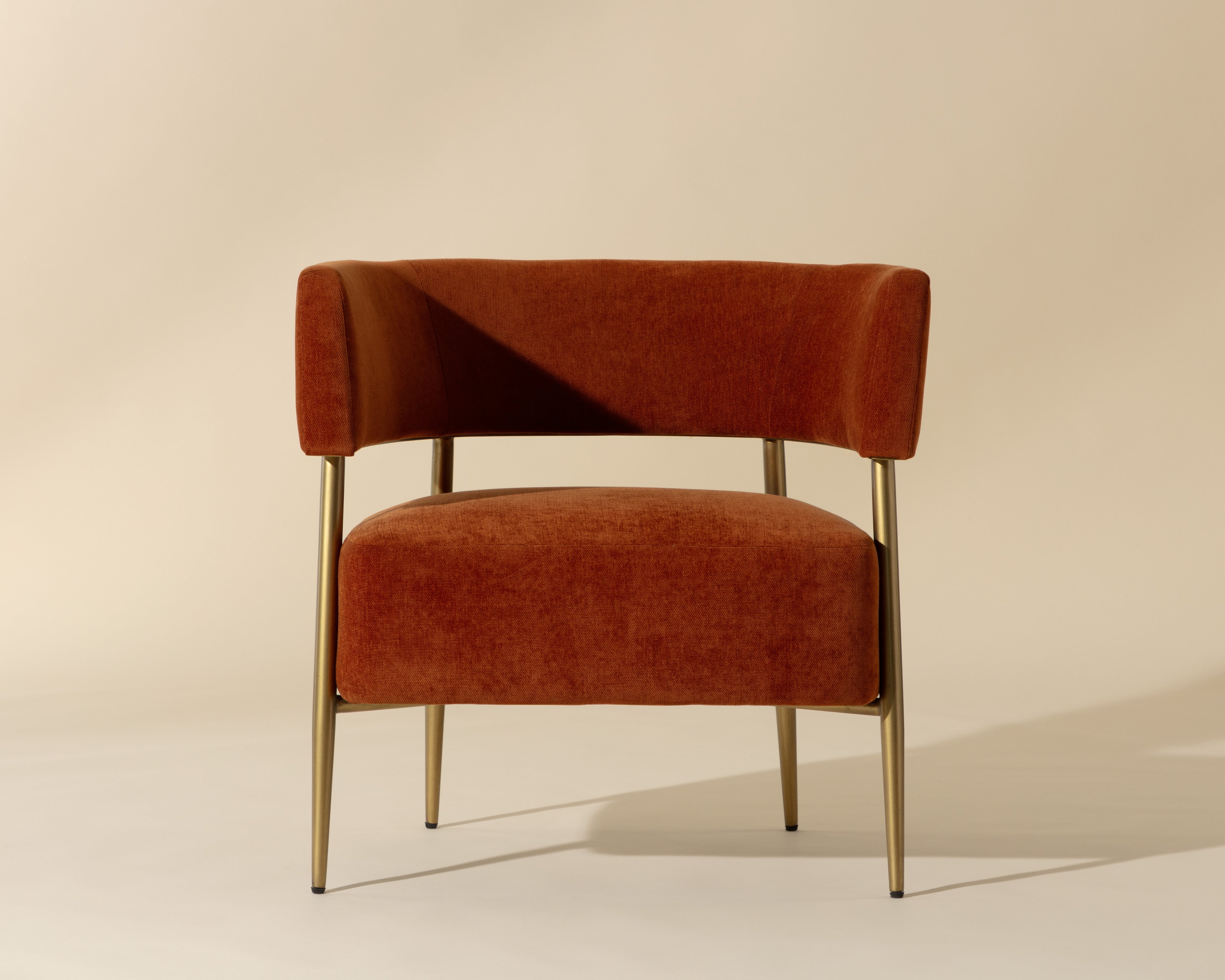 Turn heads with this contemporary lounge chair that exudes extravagance. Features a curved frame and upholstered in our danny navy and rust fabrics. Completed with antique brass legs. Also available in dove cream fabric.