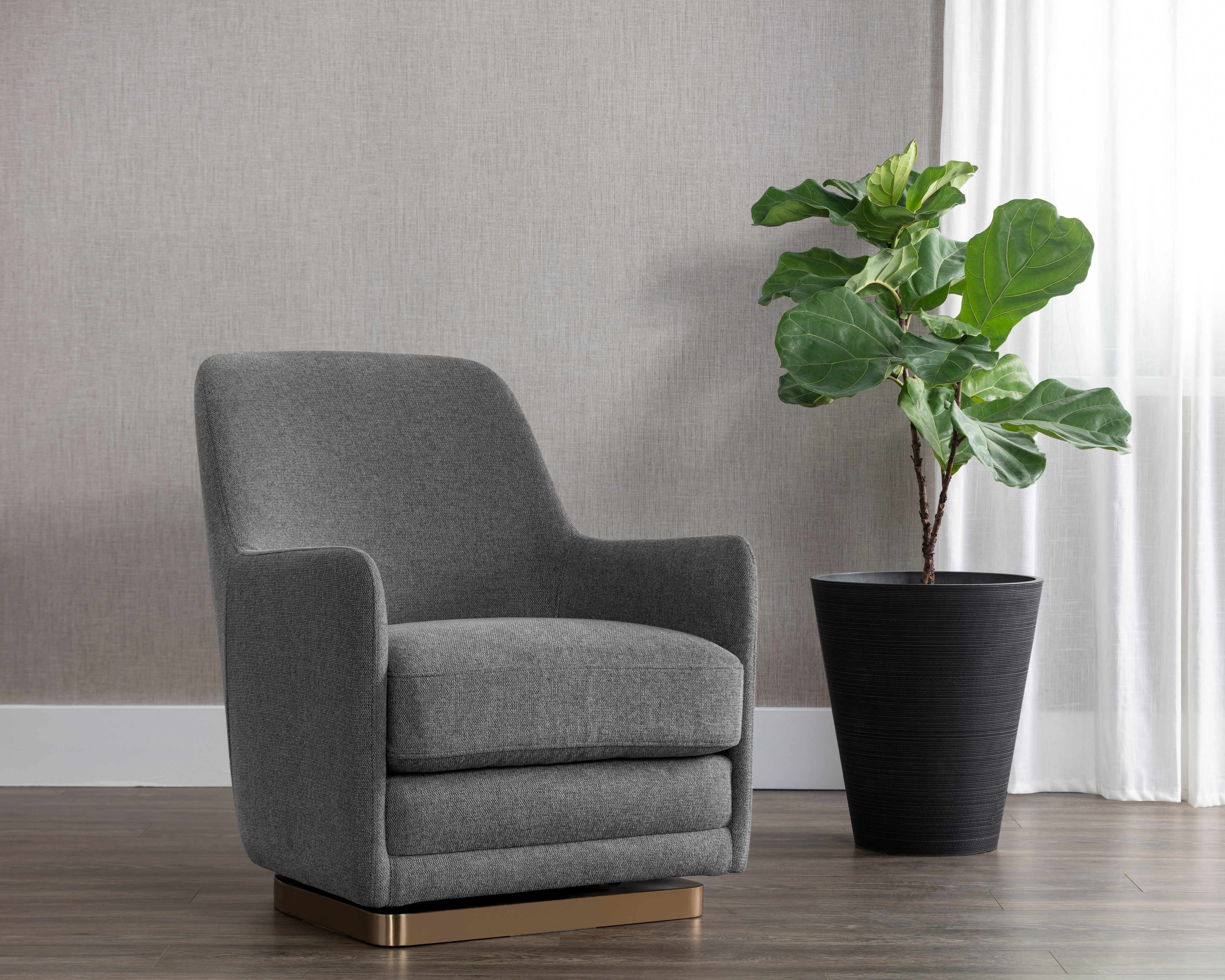 Unwind in style with this fabulous, modern swivel lounge chair that features a smooth curved frame. Stocked in belfast koala grey fabric and completed with an antique brass stainless steel base.
