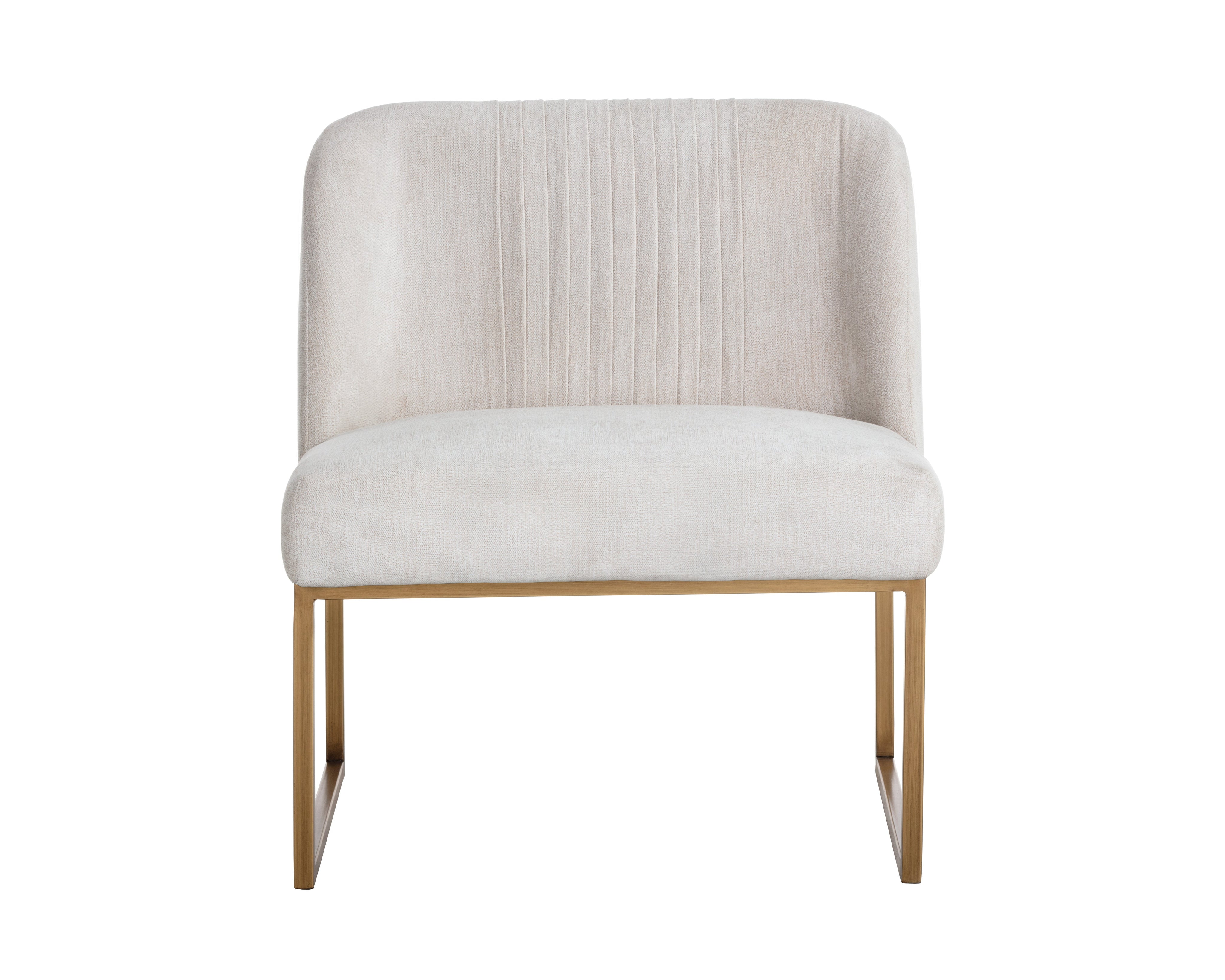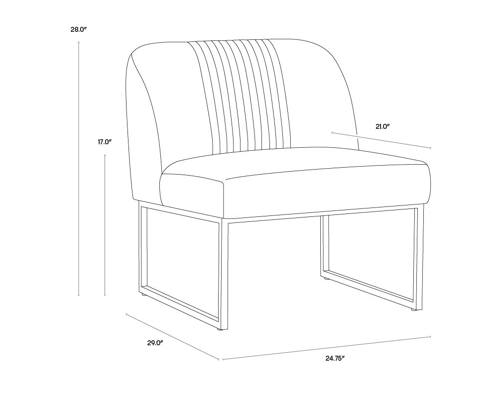 A modern dining chair that offers style and comfort. Features delicate ruching on the rounded seatback and exposed antique brass legs. Stocked in polo club muslin performance fabric. Performance fabric is moisture repellent, durable and easy to clean.