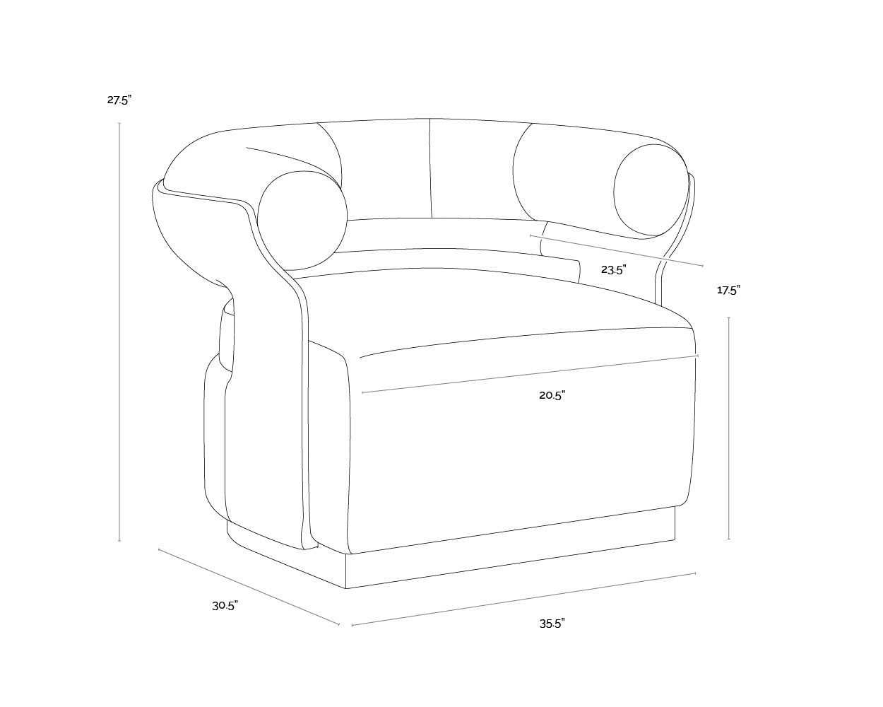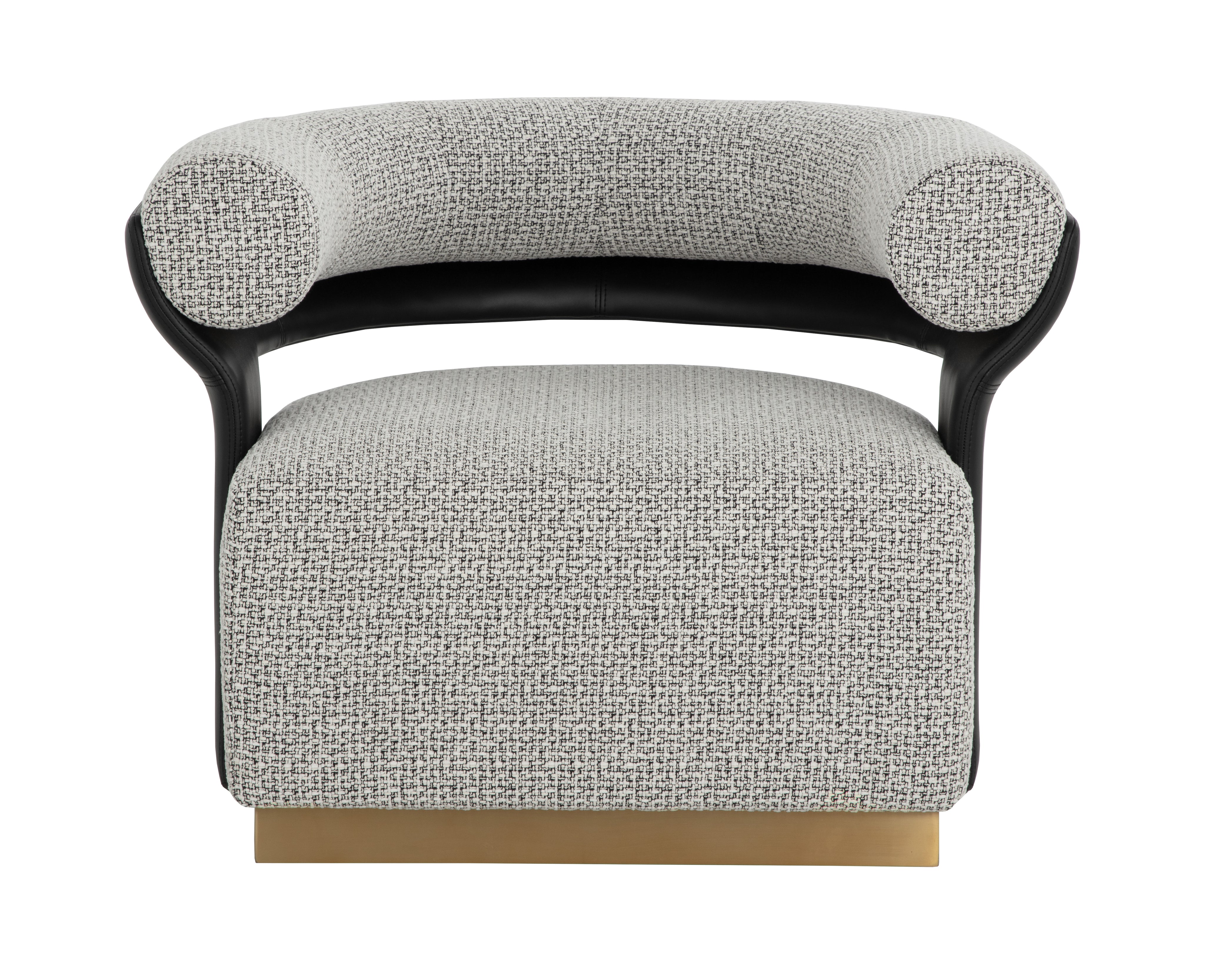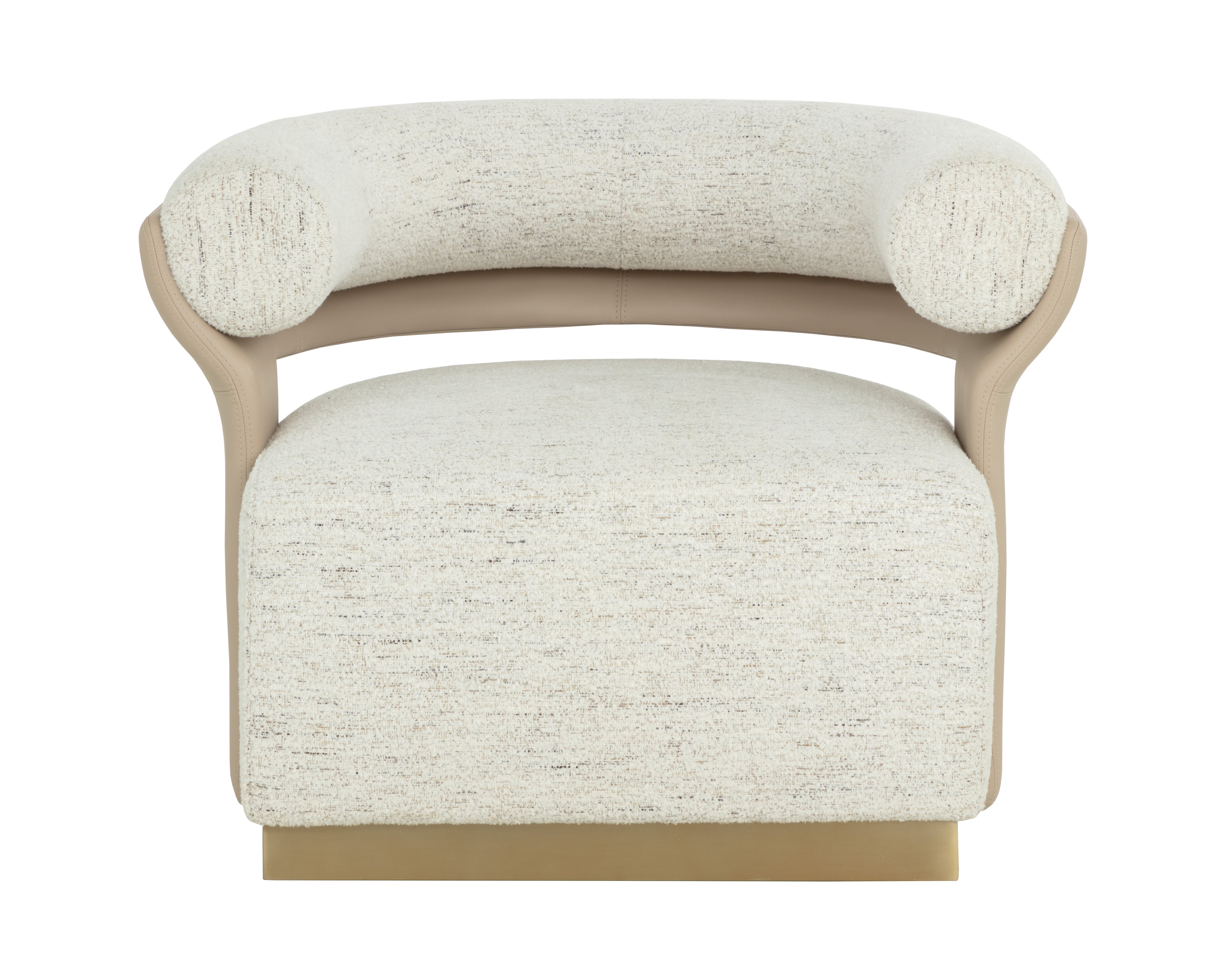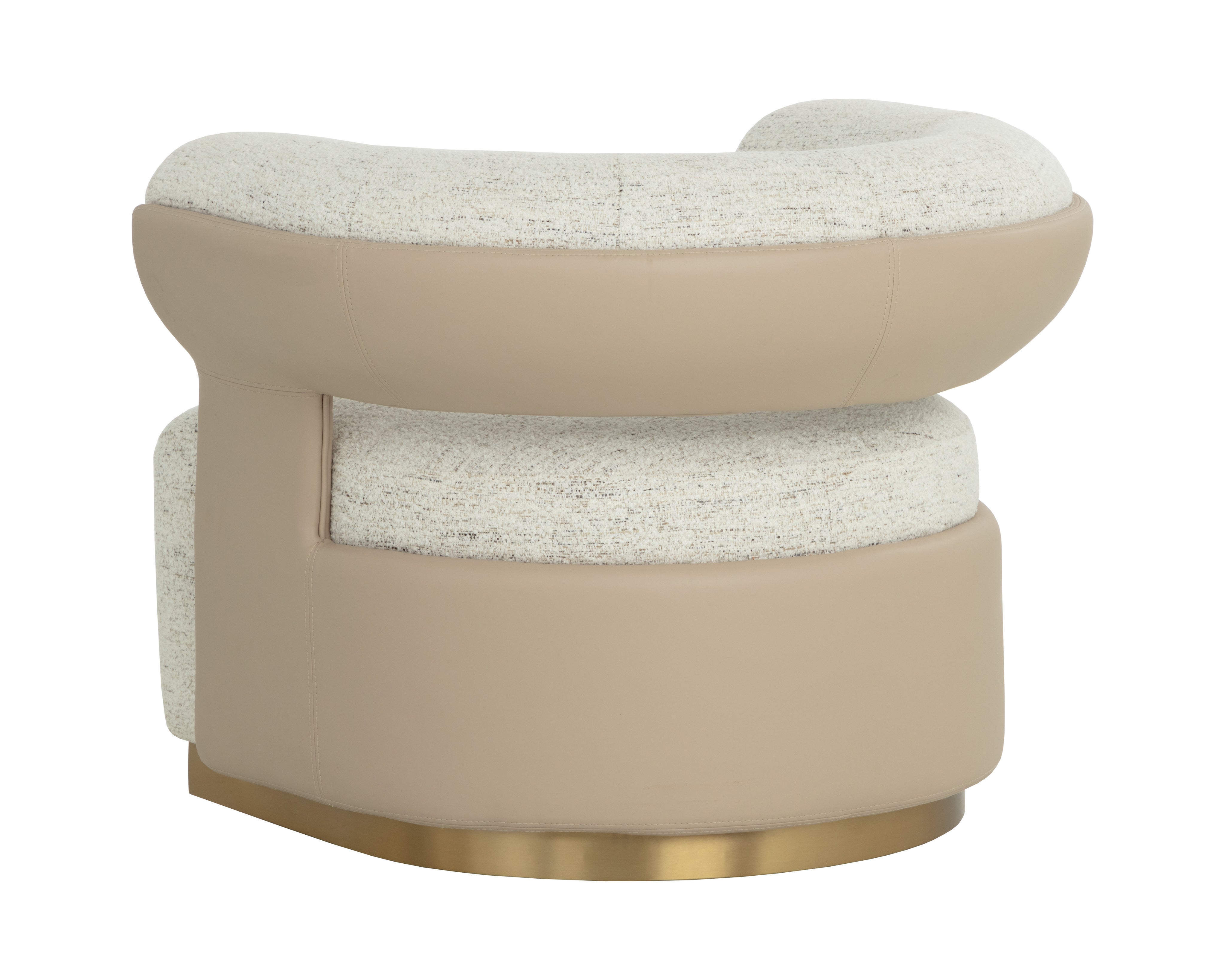 Generously curved and sculpted, the Olida Swivel Lounge Chair is a great show of contemporary style and personality. Expertly upholstered in hailey moon fabric and accented with nappa beige faux leather and a polished metal base for a demonstration of sharp and shapely ingenuity.