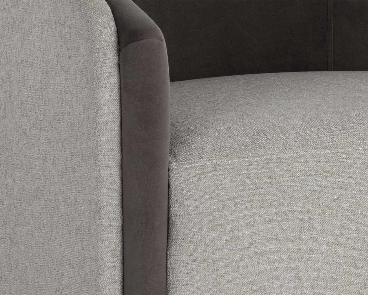 With an alluring barrel back seatback, this stunning lounge chair will add a touch of comfort to any space. Features an upholstered exterior and seat in ernst silverstone fabric, and completed with coordinating meg ash fabric on the interior seat and legs. Also available in a san remo winter cloud fabric and antonio charcoal fabric combination.
