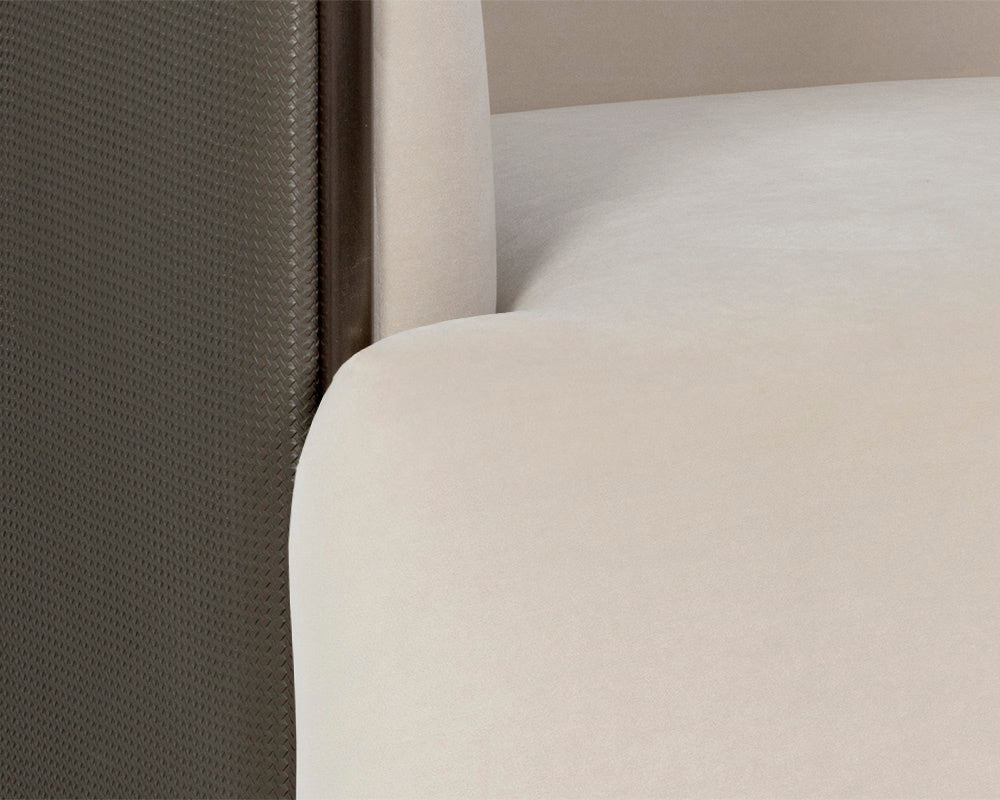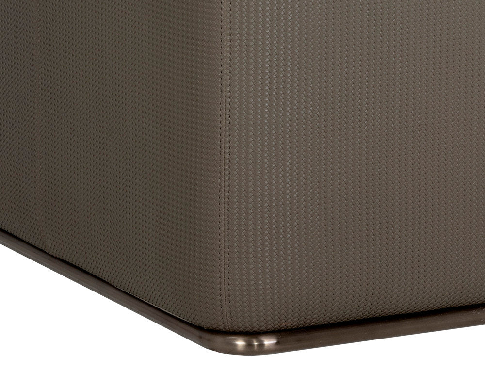 A bold form defines this modern and structured armchair that is guaranteed to turn heads. Features an interior upholstered in meg taupe fabric and an exterior in textured porcini taupe faux leather. Completed with an antique bronze stainless steel frame. Coordinating sofa also available. Handle With Care: This design has been crafted with faux leather. Faux leather is manufactured to reflect the natural characteristics of leather; as such, colour variations, markings wrinkles, grooves, and light scratches are appreciated characteristics. No two pieces will be alike. Visit our Product Care page for more information on how to ensure the lasting beauty of this piece.