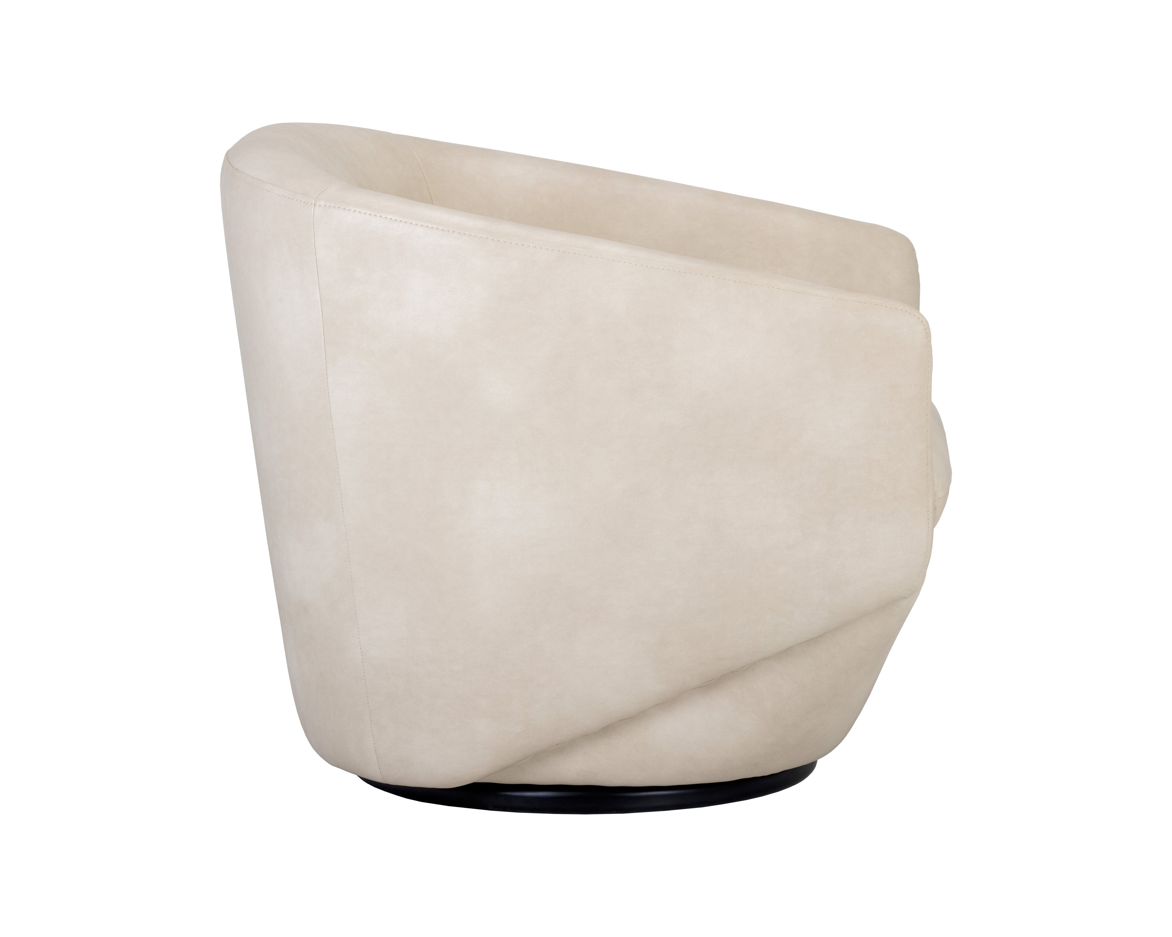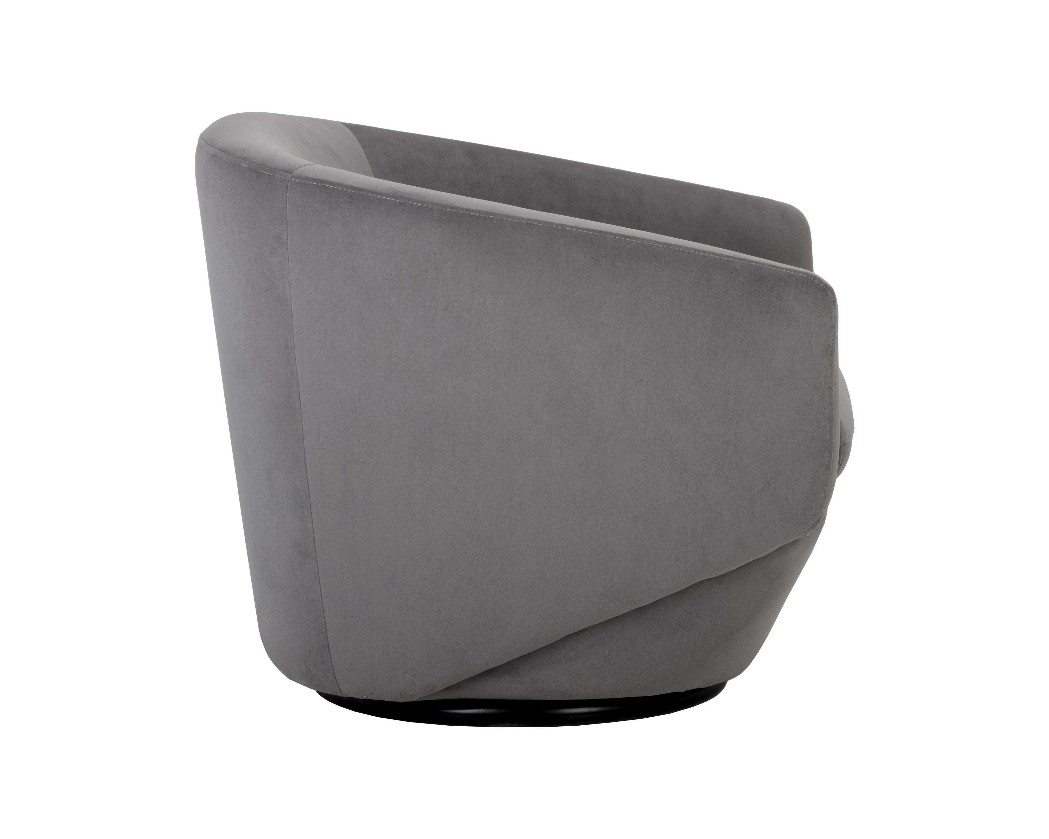 A modern swivel lounge chair designed with an angular base and a comfortable seat. Available in antonio charcoal performance fabric with a black beech wood base. Performance fabric is moisture repellent, durable and easy to clean. As wood is an organic, porous material, these pieces will contain natural variation of texture and may also exhibit fine indentations and cracks. Wood pieces will also display a disparity of colour and grain, and visible knots and burls that add to the character of each piece.