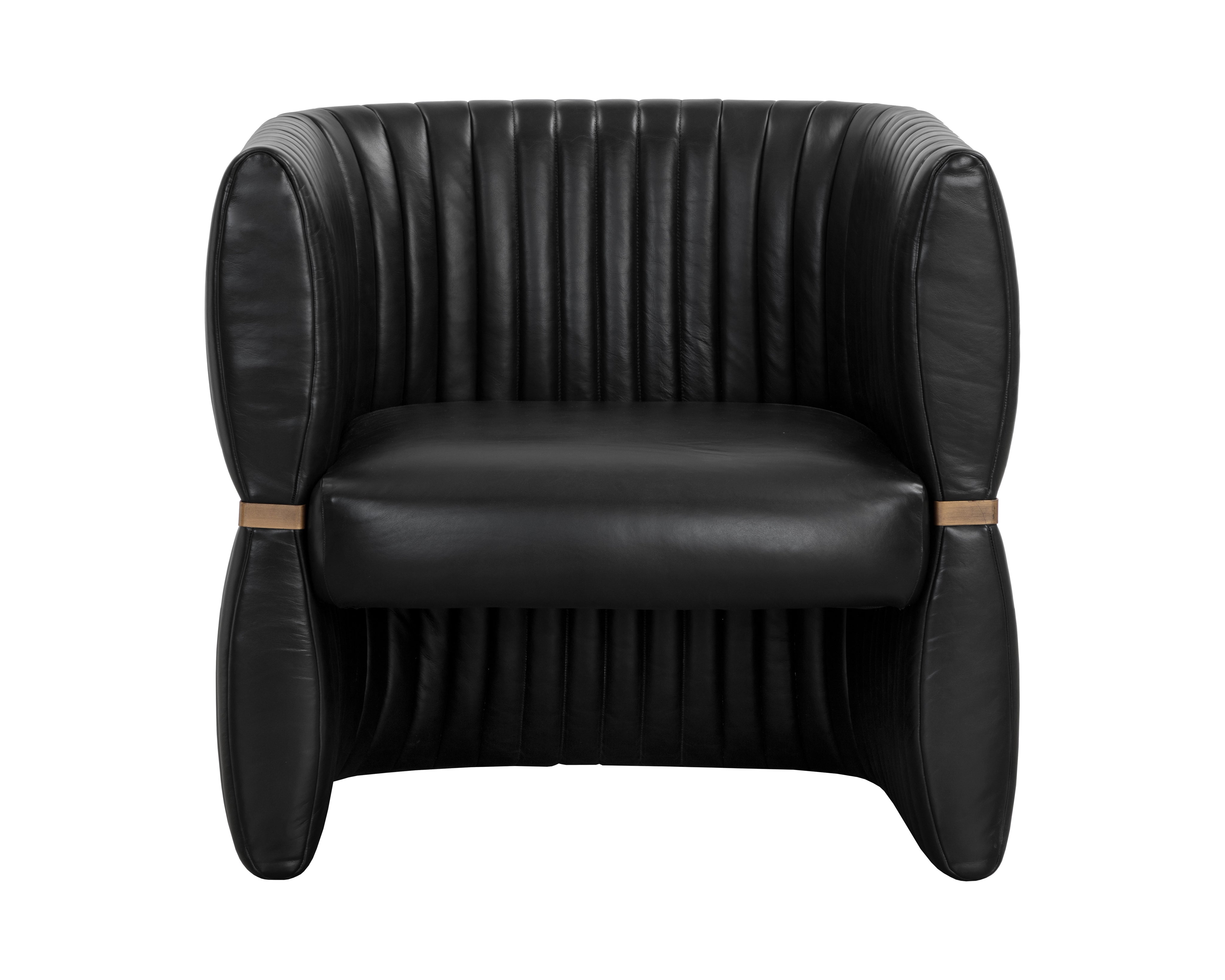 The Tryor Lounge Chair is defined by its contemporary style and enhanced proportions. Fully upholstered in our smooth sahara sand top grain leather for a luxurious feel. An antique brass iron metal accent wraps around the chair to accentuate its channel design.
