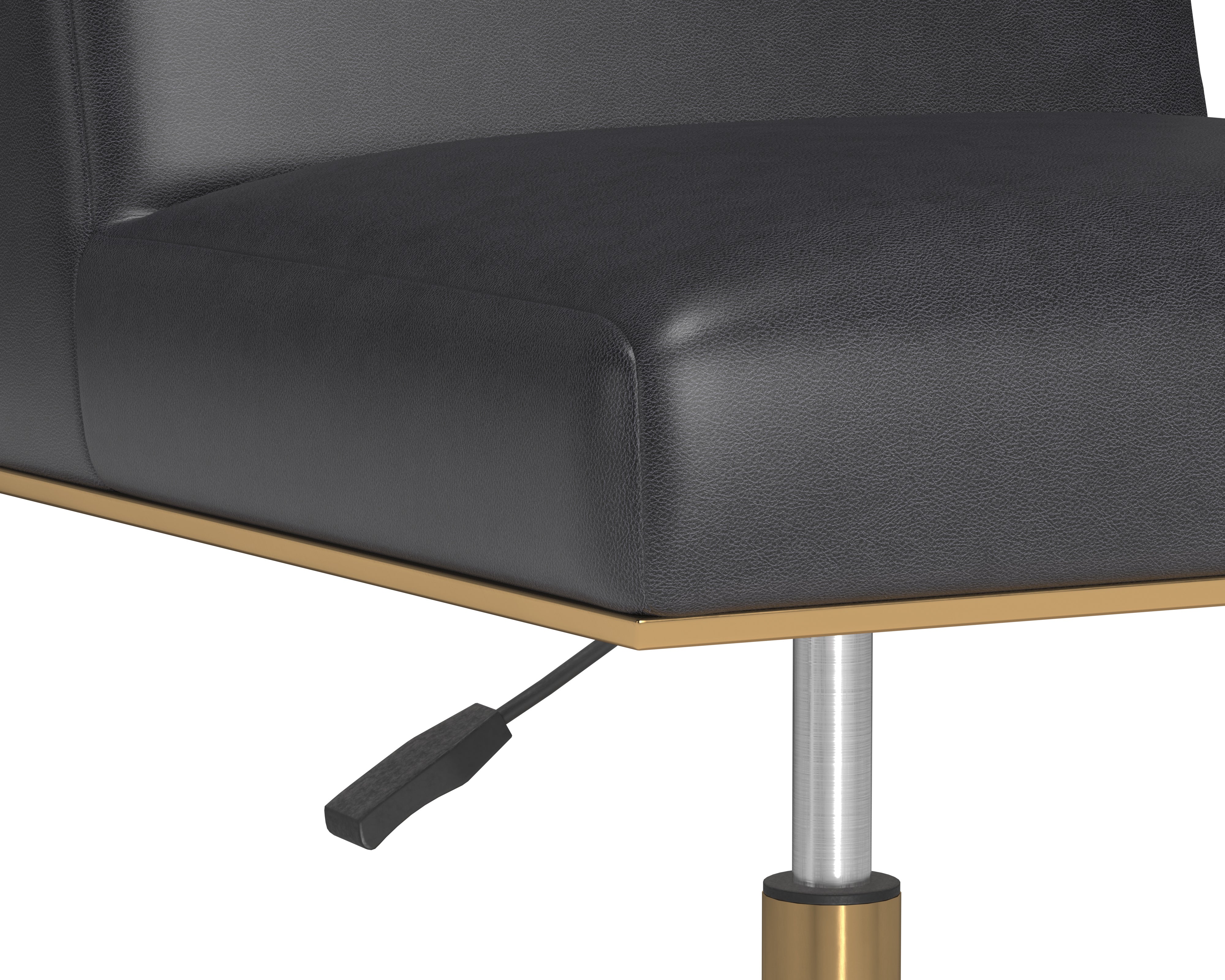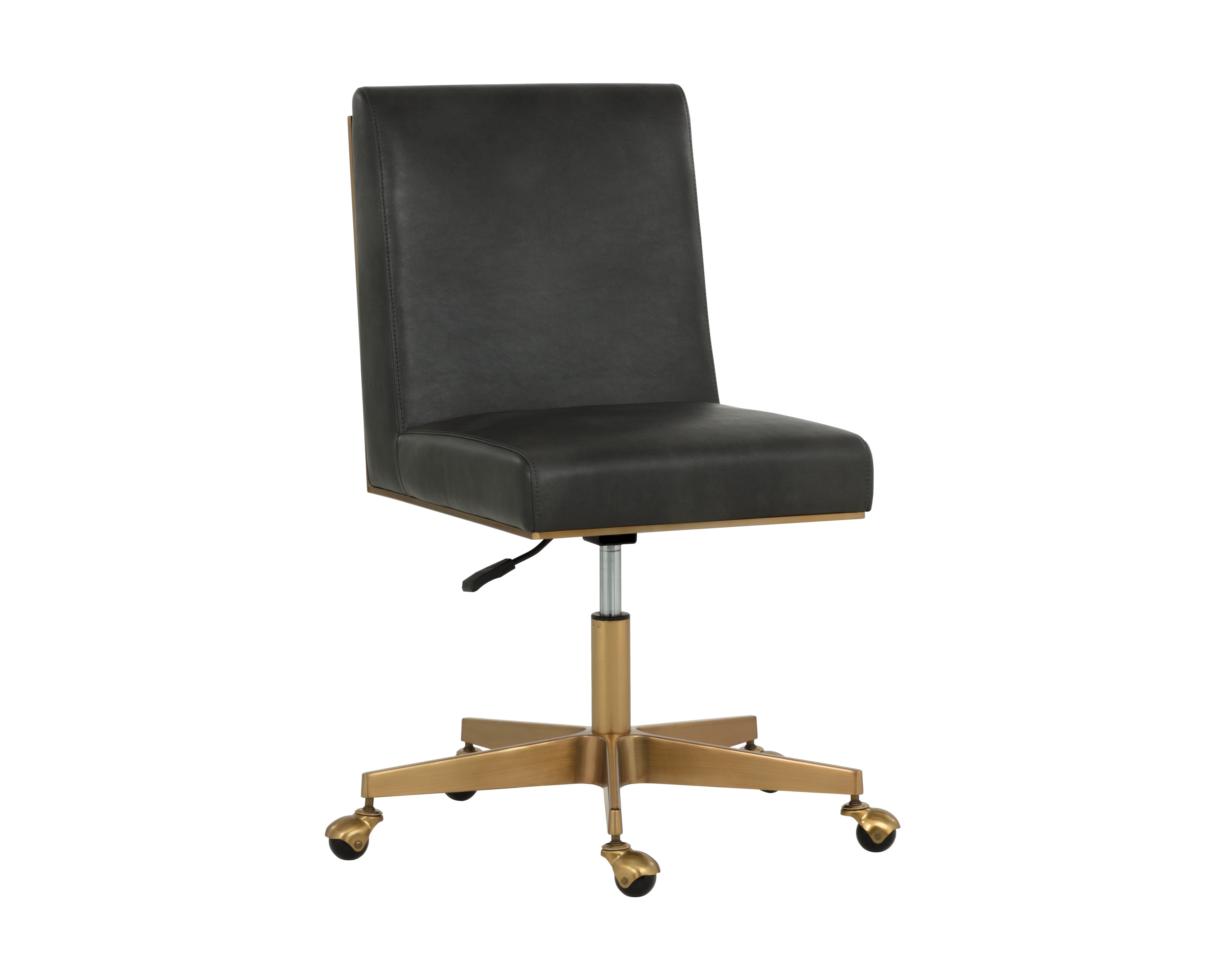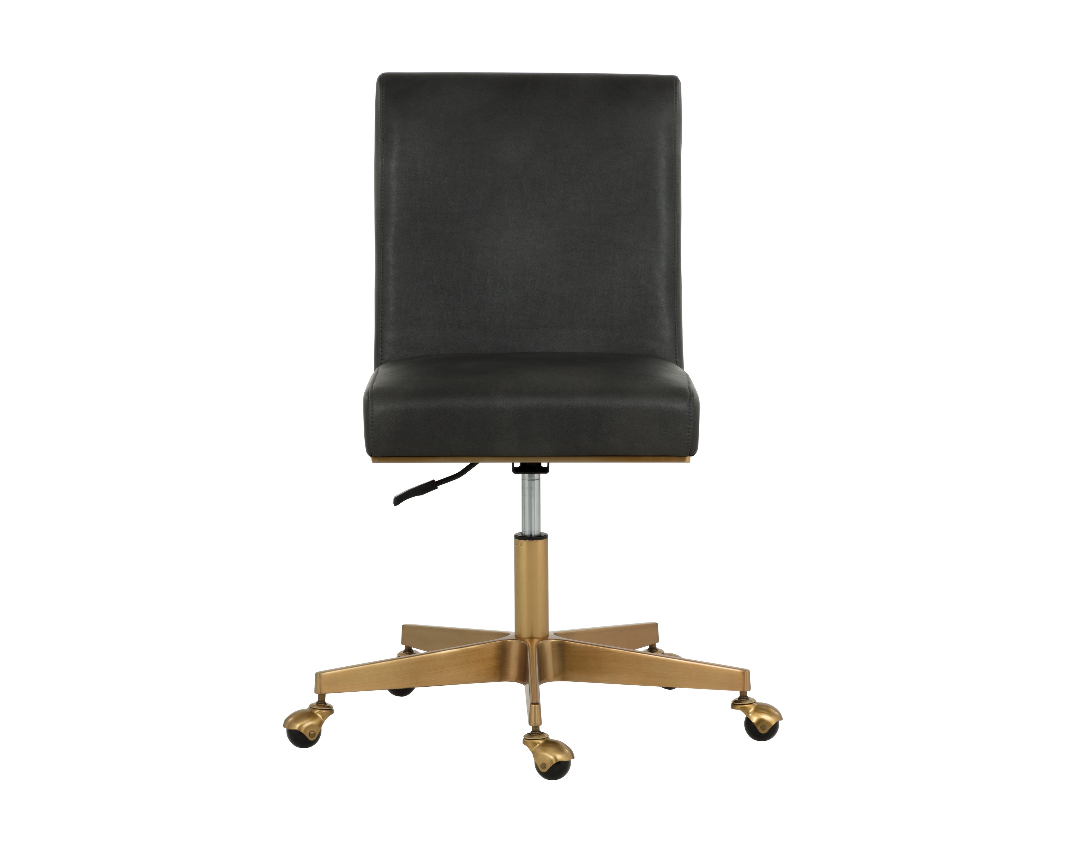 Stunning from all angles, this office chair features a streamlined silhouette for an effortlessly modern design. Stocked in bravo portabella faux leather. Completed with a brushed brass powder-coated stainless steel base with added castors for mobility. Handle With Care: This design has been crafted with faux leather. Faux leather is manufactured to reflect the natural characteristics of leather; as such, colour variations, markings, wrinkles, grooves, and light scratches are appreciated characteristics. No two pieces will be alike. Visit our Product Care page for more information on how to ensure the lasting beauty of this piece.