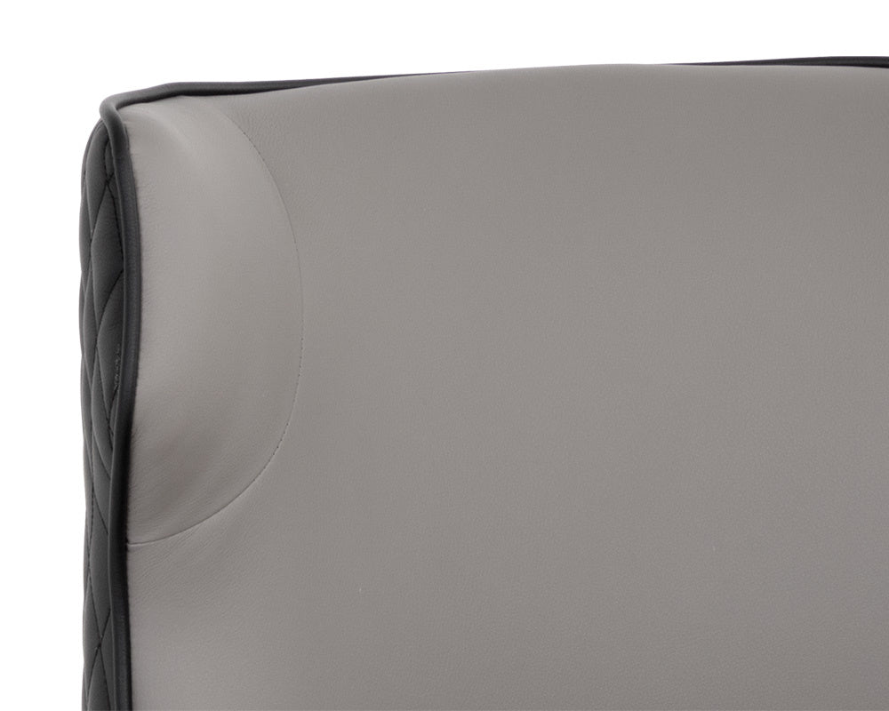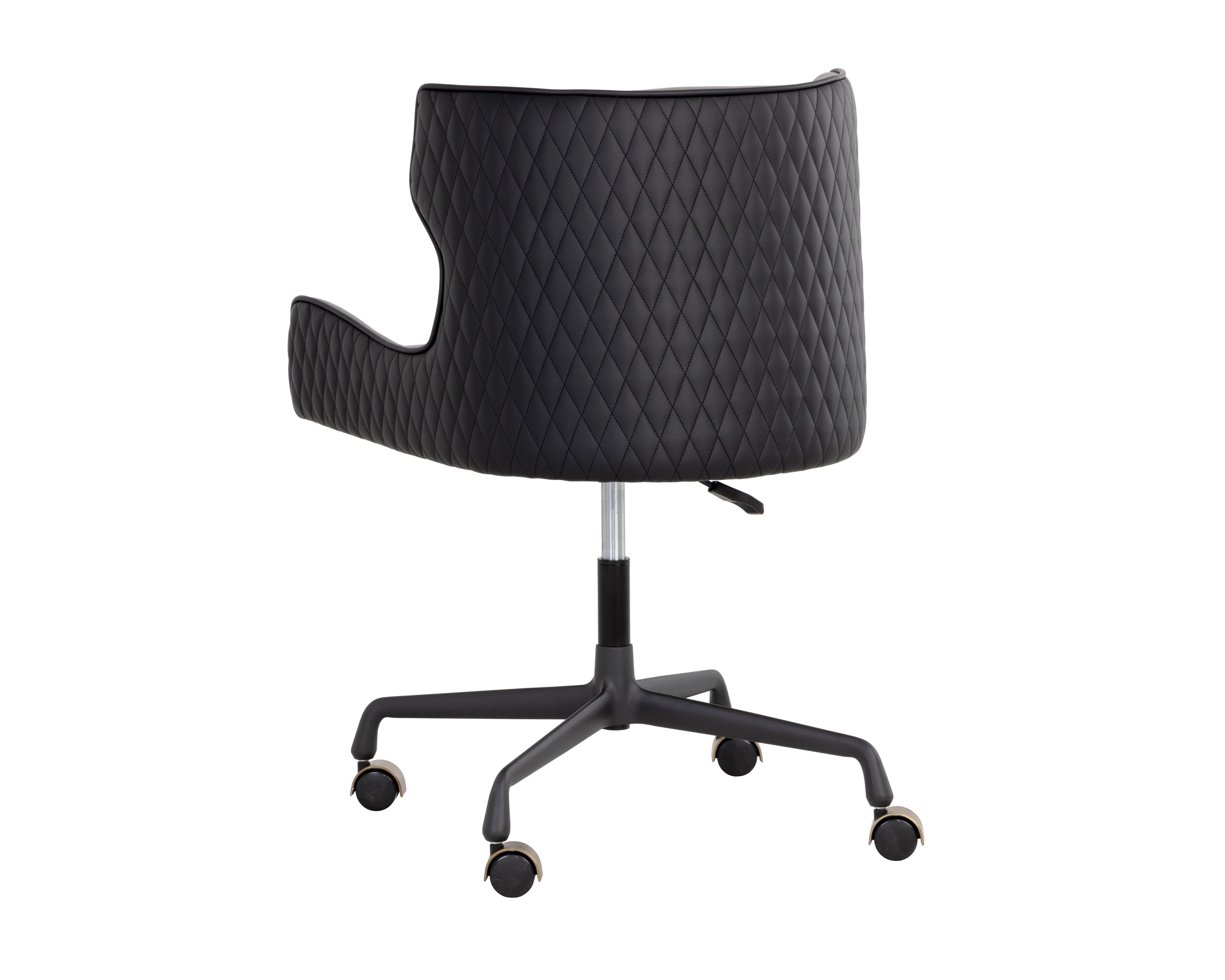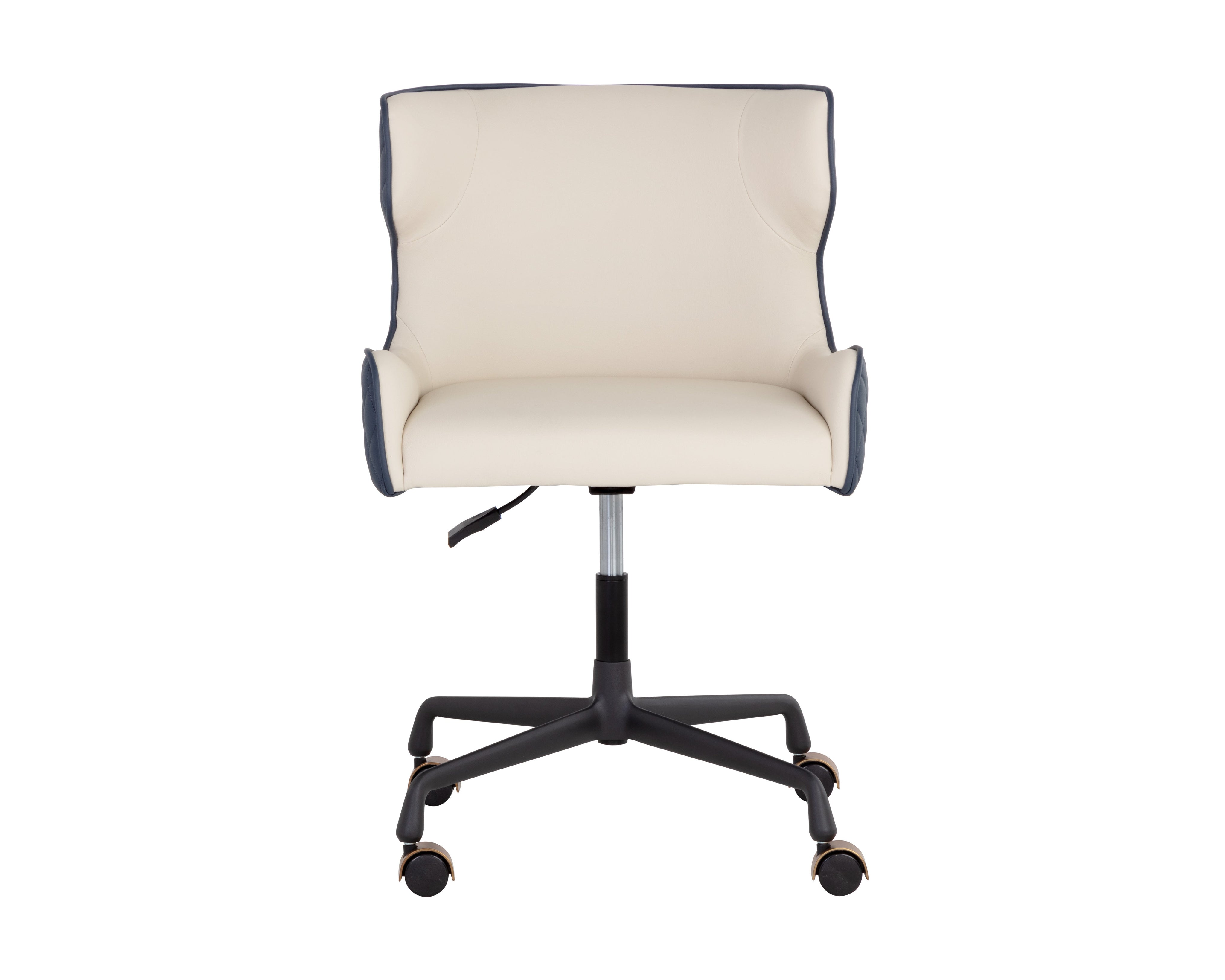 A classic office chair featuring a substantial seat upholstered in contrasting dillon cream and thunder faux leather. Diamond stitching on the seatback adds a hint of elegance while a black powder-coated metal base completes the look. Handle With Care: This design has been crafted with faux leather. Faux leather is manufactured to reflect the natural characteristics of leather; as such, colour variations, markings, wrinkles, grooves, and light scratches are appreciated characteristics. No two pieces will be alike. Visit our Product Care page for more information on how to ensure the lasting beauty of this piece.