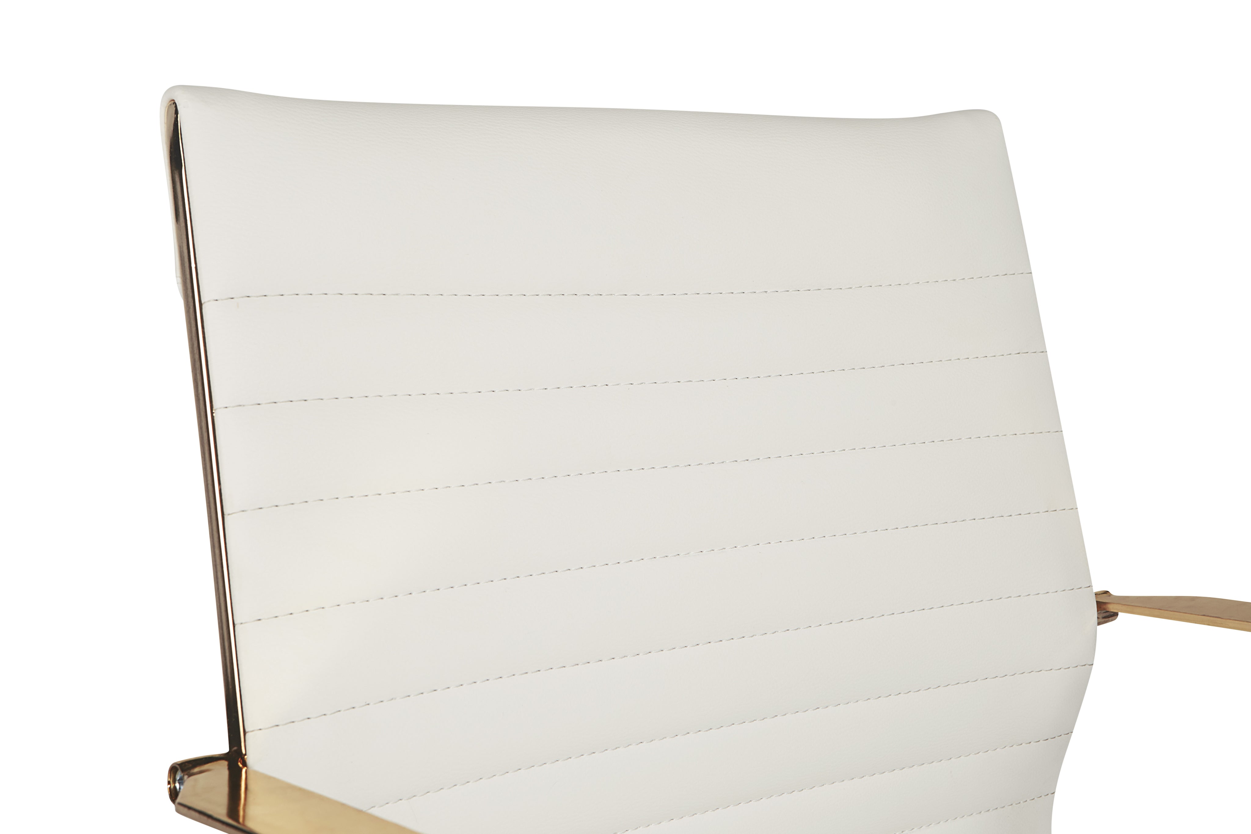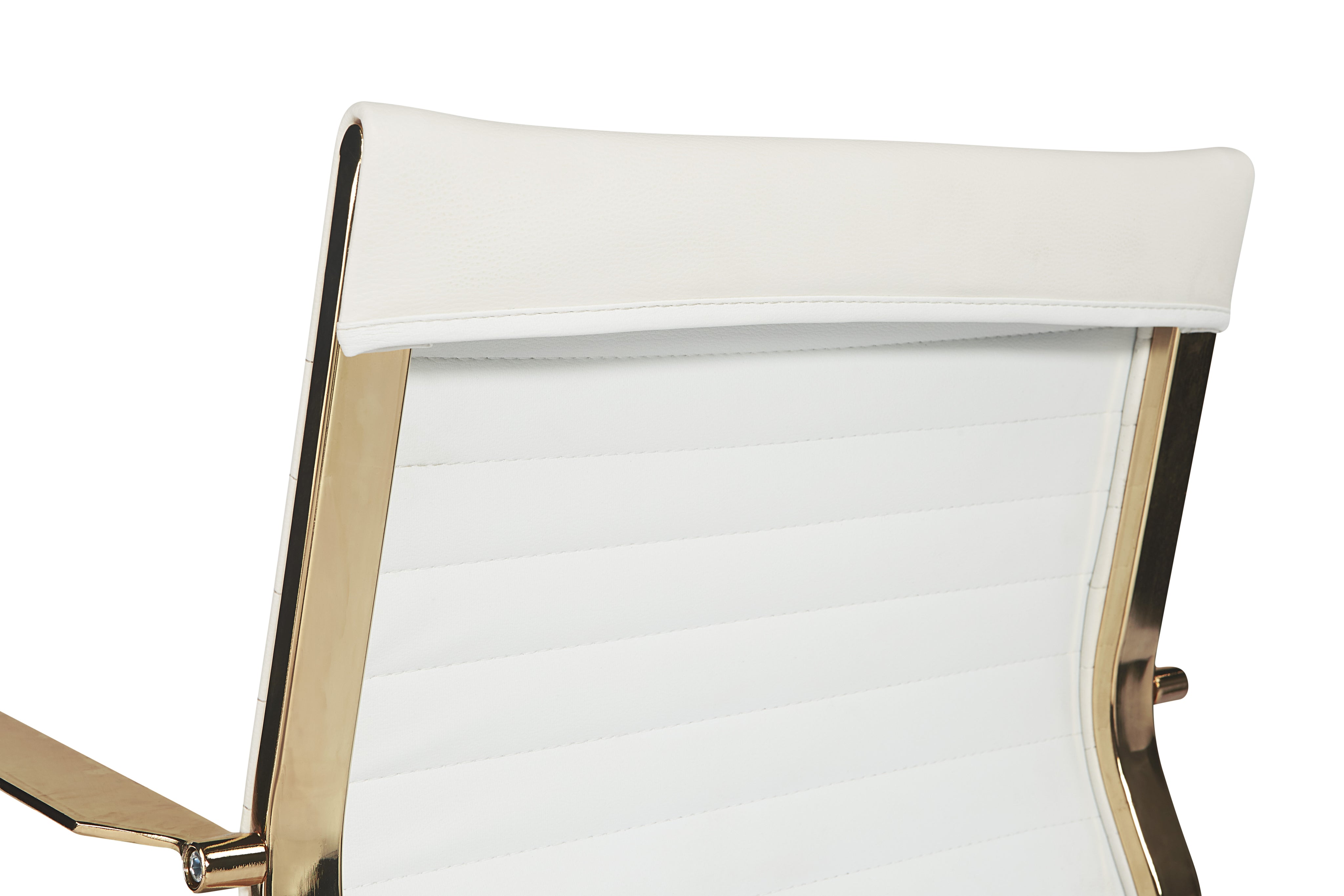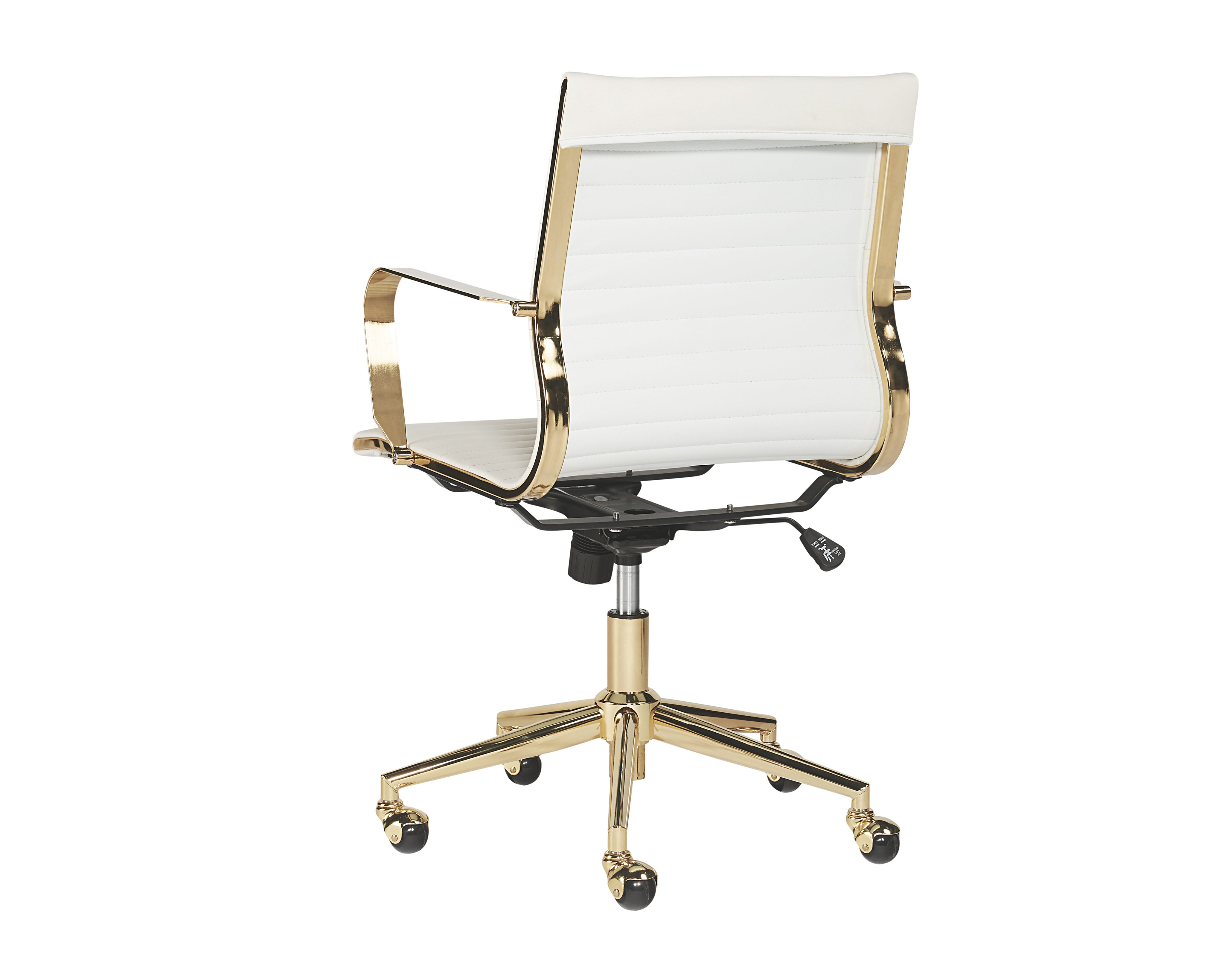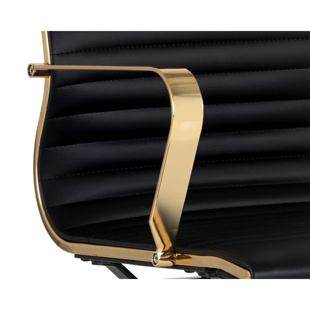 This office chair offers glamorous femininity. Features horizontal channel tufting on the seatback with a stunning polished gold steel frame and castors for mobility. Stocked in black faux leather. Handle With Care: This design has been crafted with faux leather. Faux leather is manufactured to reflect the natural characteristics of leather; as such, colour variations, markings, wrinkles, grooves, and light scratches are appreciated characteristics. No two pieces will be alike. Visit our Product Care page for more information on how to ensure the lasting beauty of this piece.