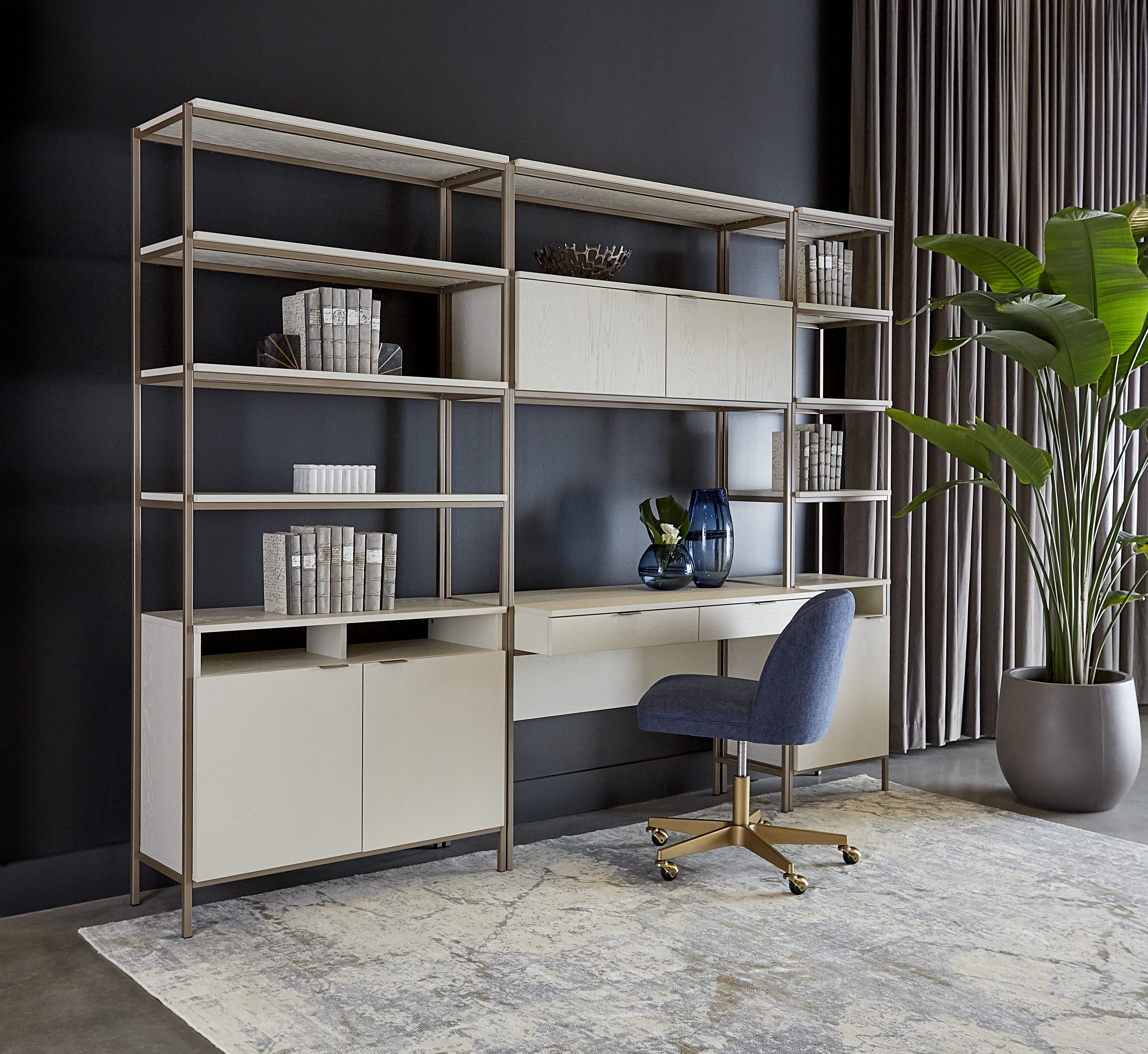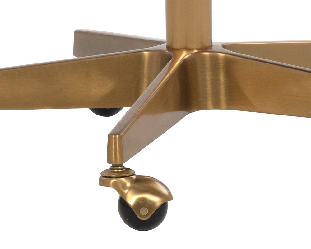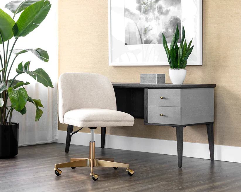 With a modern and minimalist design, this office chair is a marvelous addition to any workspace. Stocked in belfast oatmeal fabric with an adjustable seat. Completed with a gold steel base with added castors for mobility.