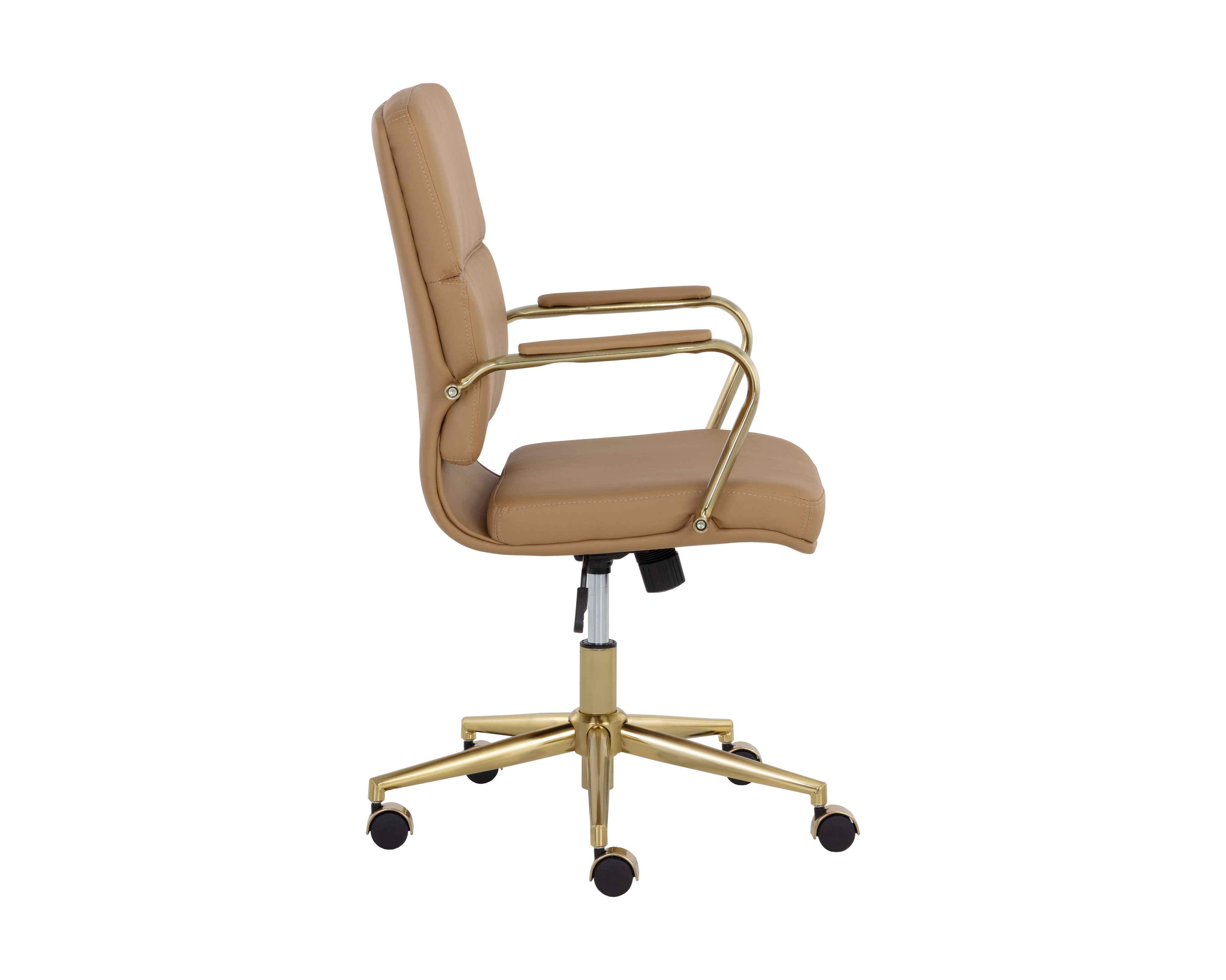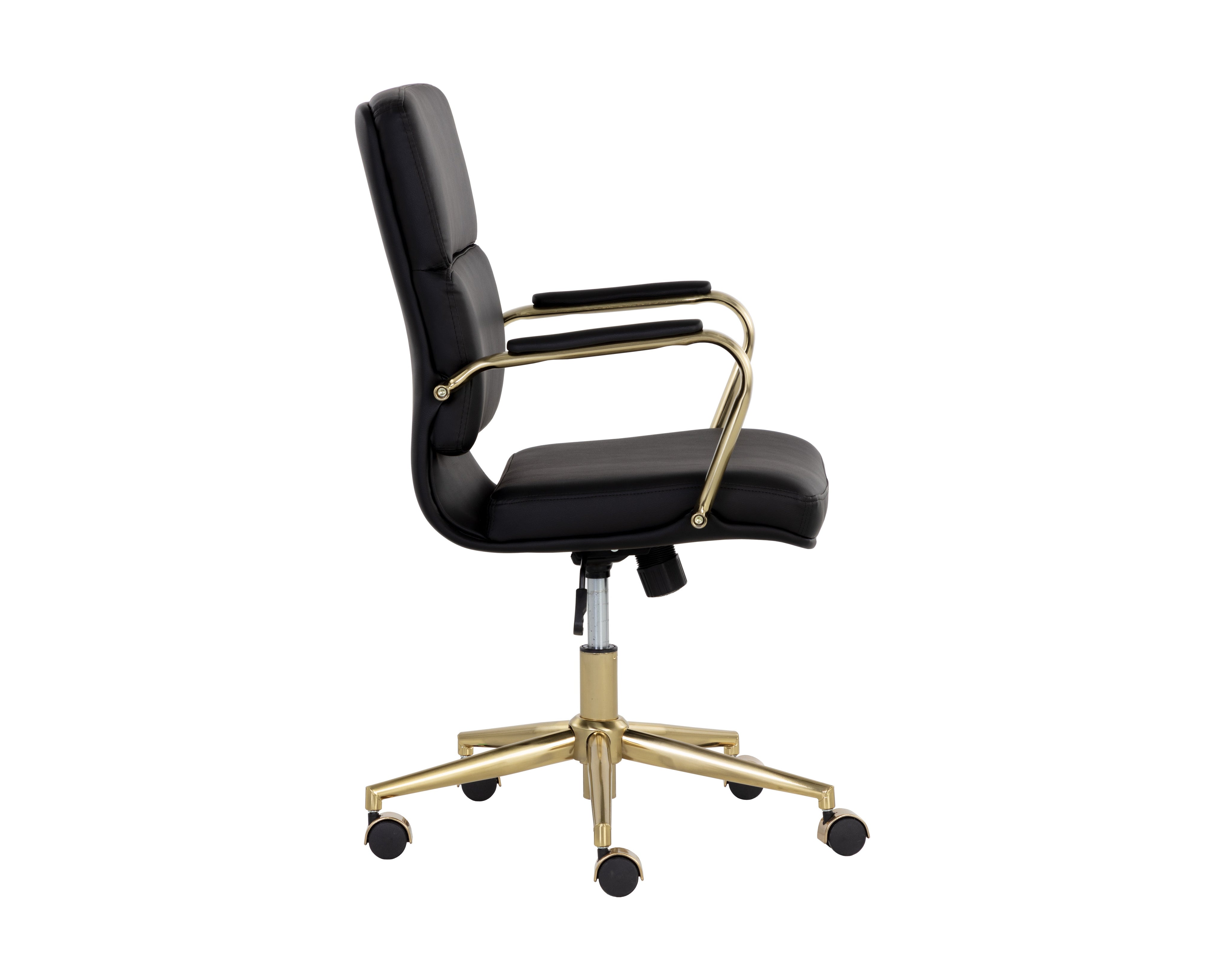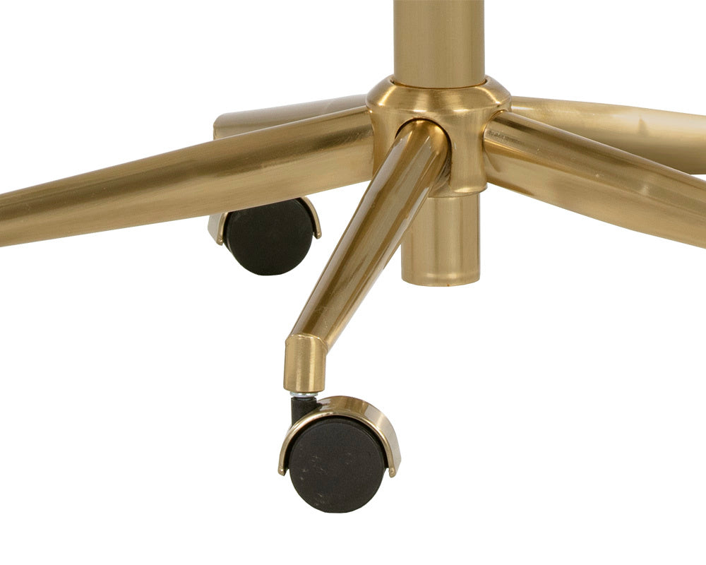 Create a stylish and functional workspace with this stunning modern office chair. Stocked in onyx faux leather and features generously padded seating for optimal comfort. Completed with castors for added mobility, and a gold stainless steel frame. Handle With Care: This design has been crafted with faux leather. Faux leather is manufactured to reflect the natural characteristics of leather; as such, colour variations, markings wrinkles, grooves, and light scratches are appreciated characteristics. No two pieces will be alike. Visit our Product Care page for more information on how to ensure the lasting beauty of this piece.