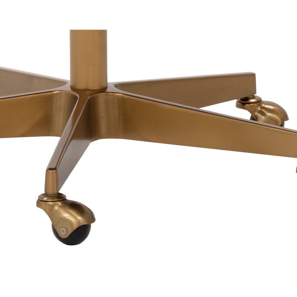 Boasting a mesmerizing curvy design, this modern office chair also features a stylish cutout on the seatback. Stocked in deep green sky fabric. Completed with a gold stainless steel base and castors for mobility.