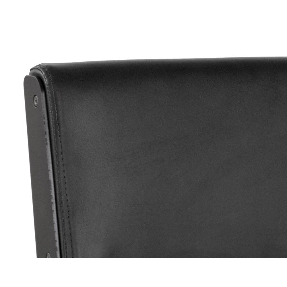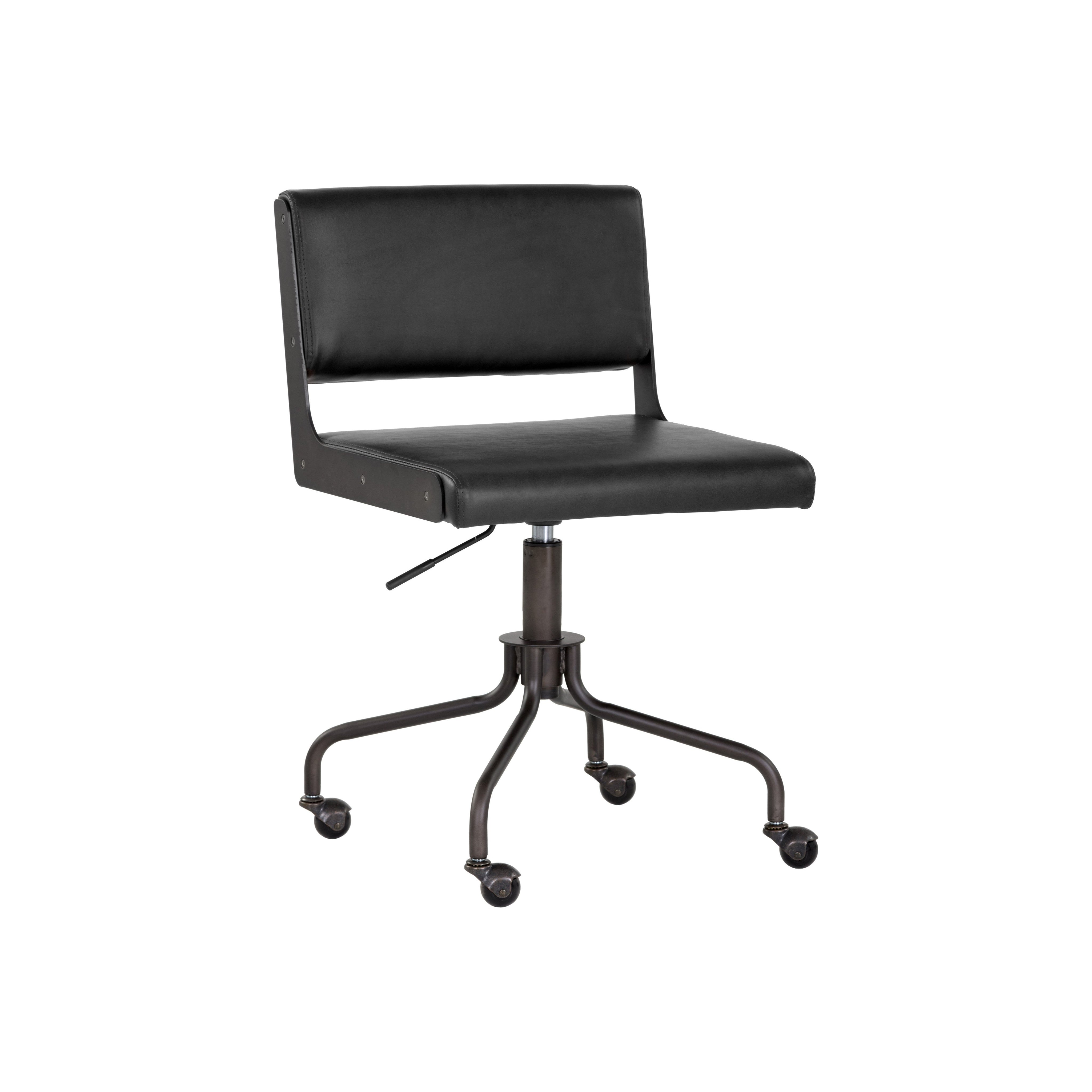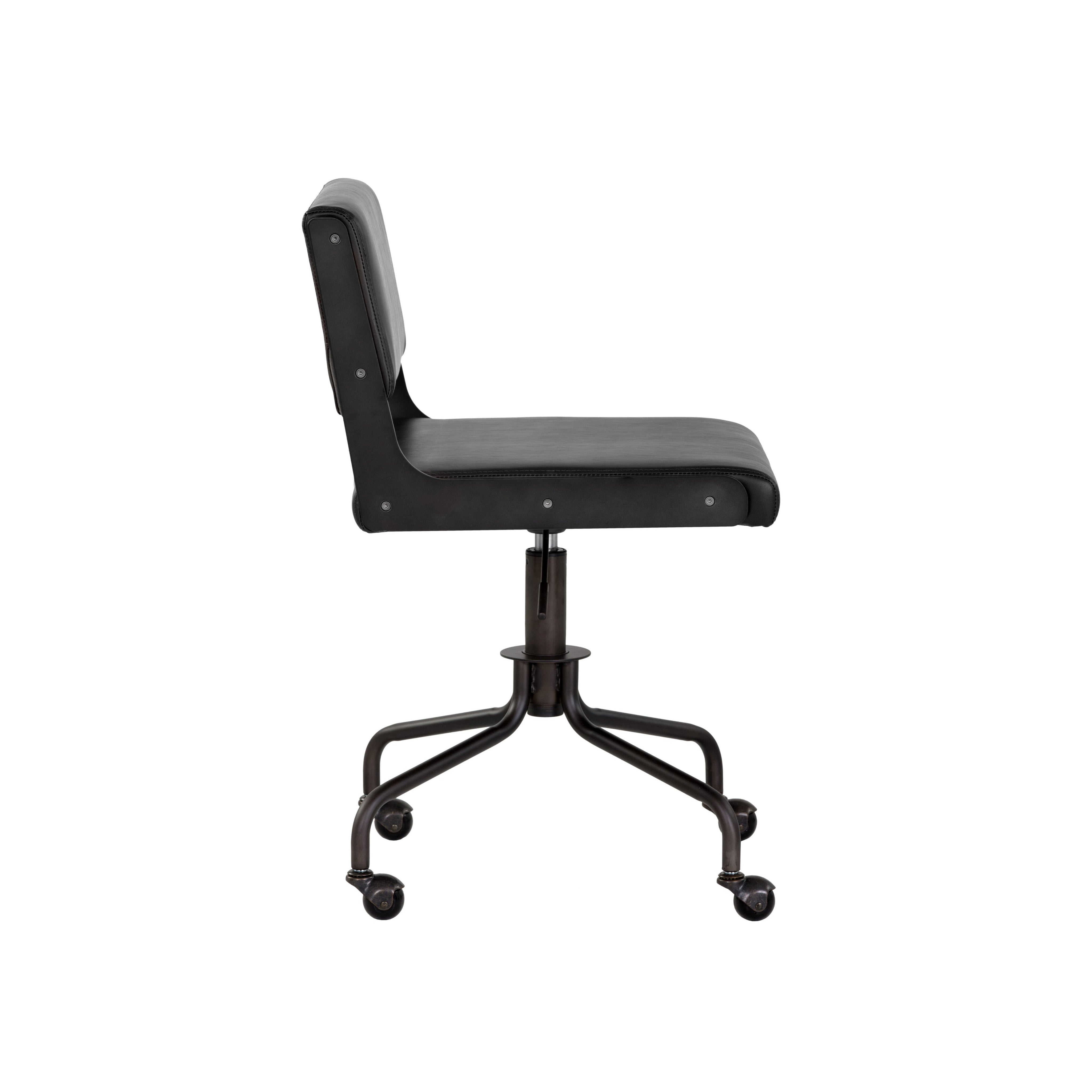 This armless office chair was inspired by Scandinavian style with an industrial flair. Stocked in onyx faux leather and finished with an exposed brushed steel frame. Castors allow for easy mobility. Handle With Care: This design has been crafted with faux leather. Faux leather is manufactured to reflect the natural characteristics of leather; as such, colour variations, markings, wrinkles, grooves, and light scratches are appreciated characteristics. No two pieces will be alike. Visit our Product Care page for more information on how to ensure the lasting beauty of this piece.
