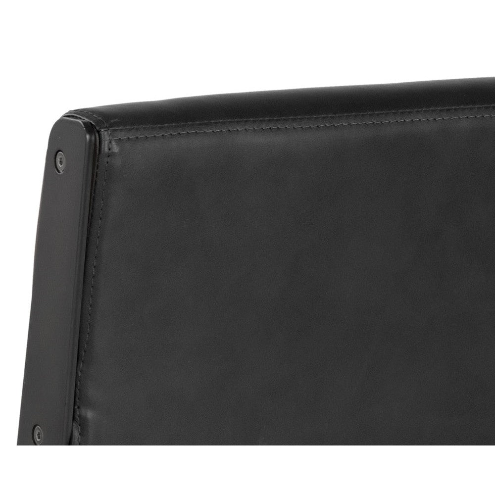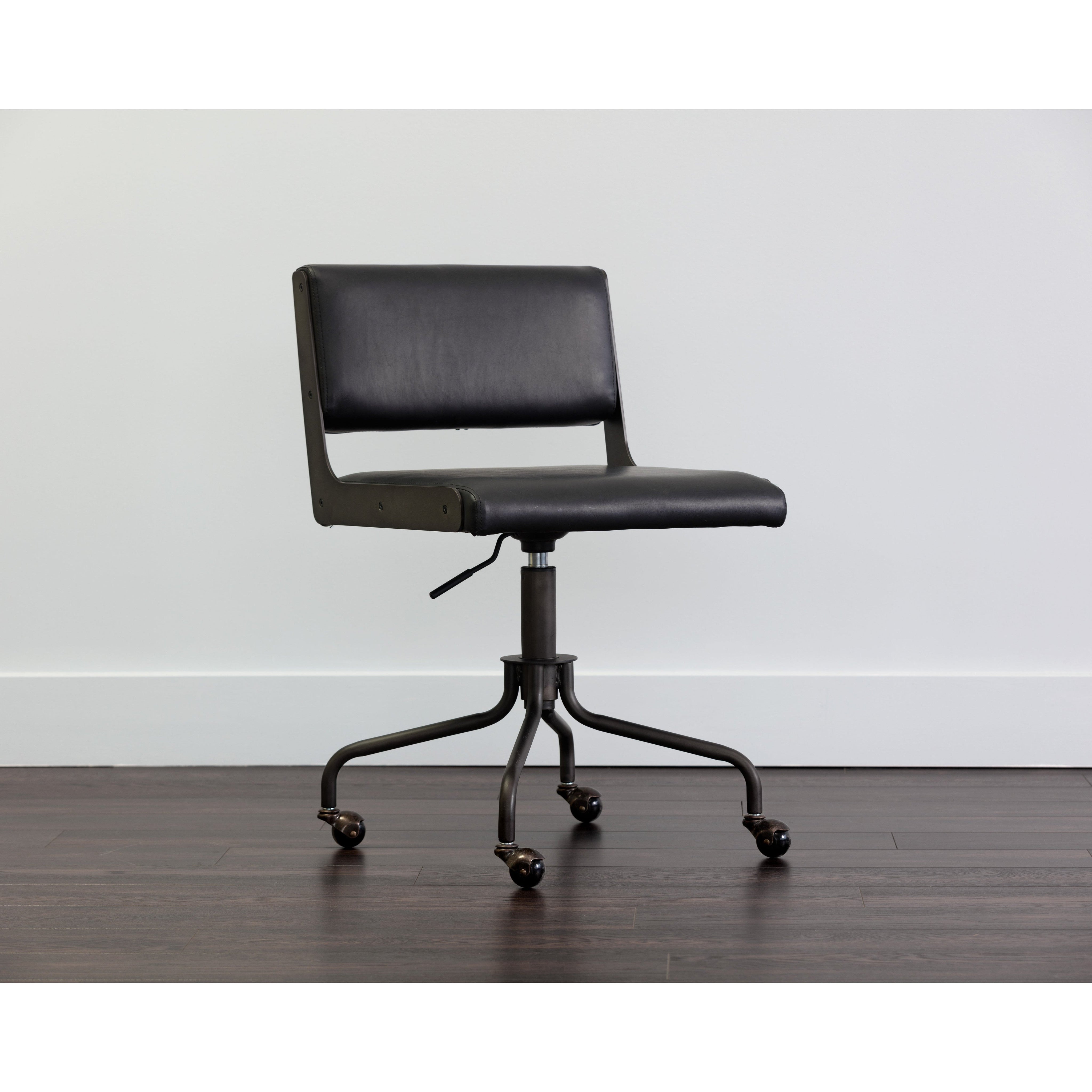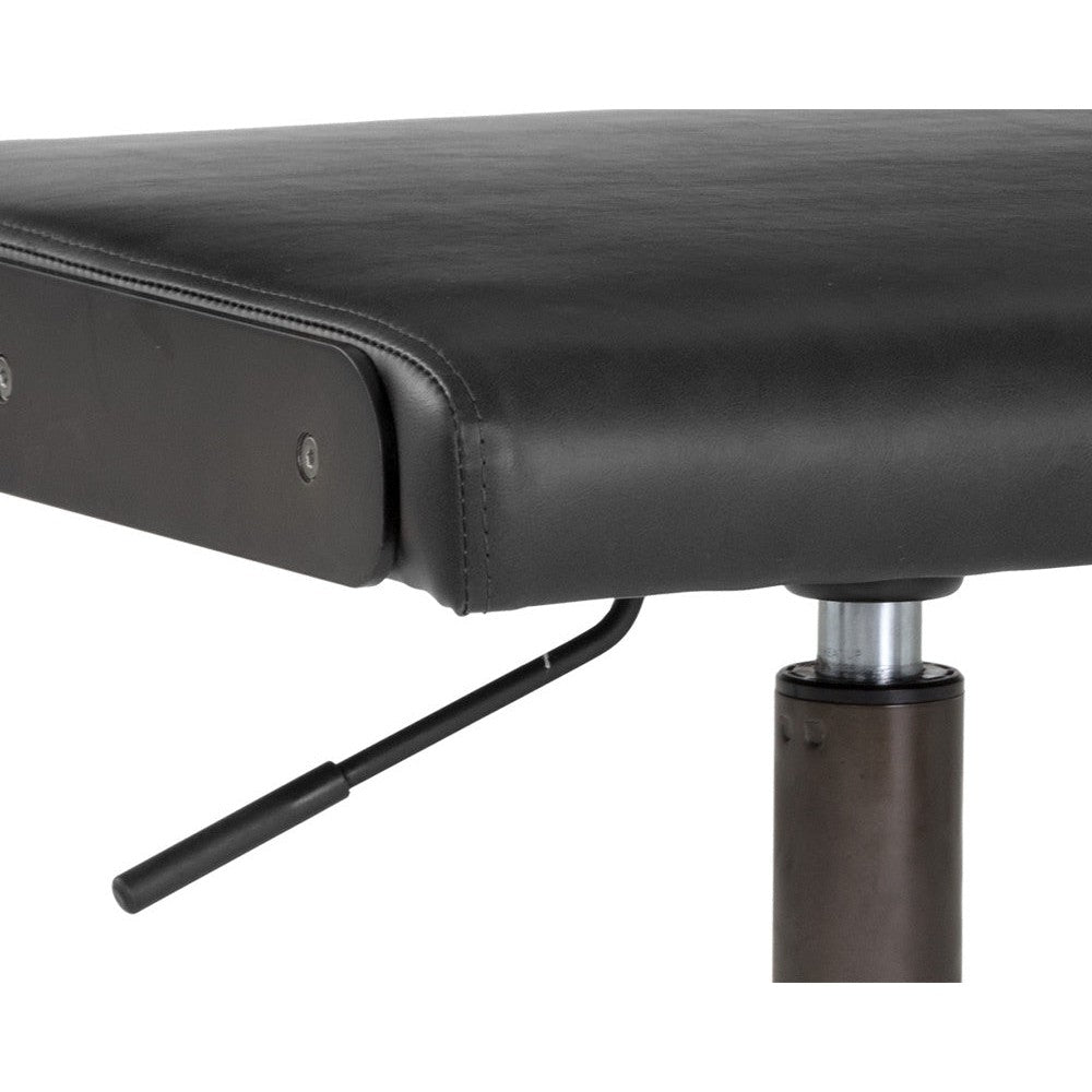 This armless office chair was inspired by Scandinavian style with an industrial flair. Stocked in onyx faux leather and finished with an exposed brushed steel frame. Castors allow for easy mobility. Handle With Care: This design has been crafted with faux leather. Faux leather is manufactured to reflect the natural characteristics of leather; as such, colour variations, markings, wrinkles, grooves, and light scratches are appreciated characteristics. No two pieces will be alike. Visit our Product Care page for more information on how to ensure the lasting beauty of this piece.