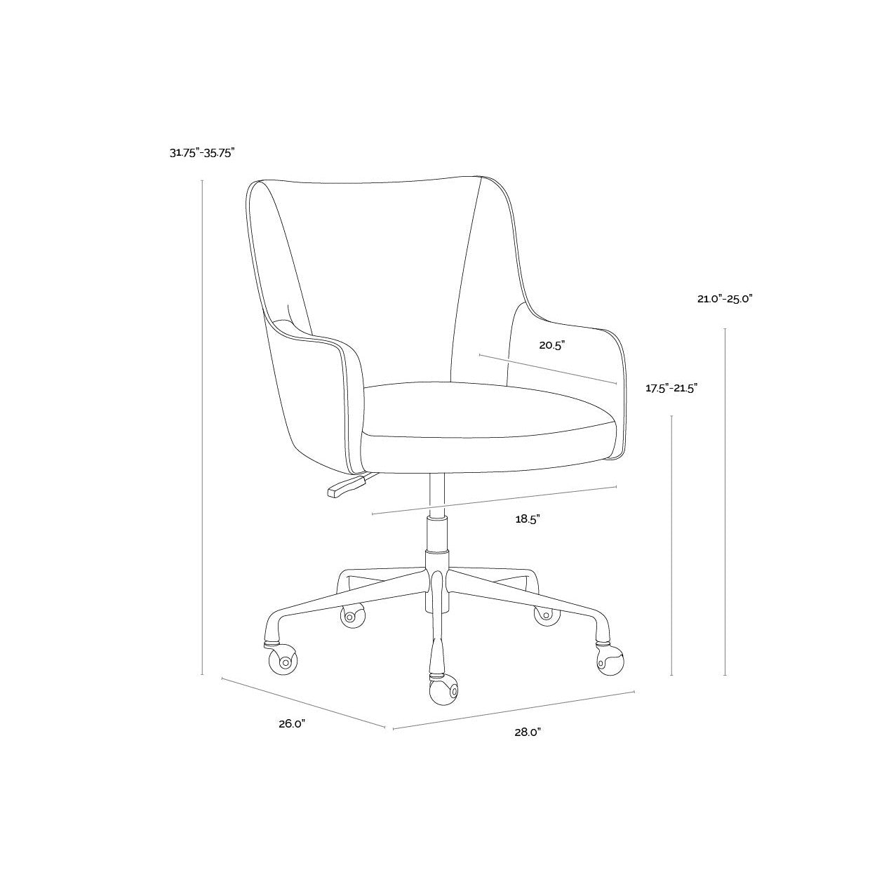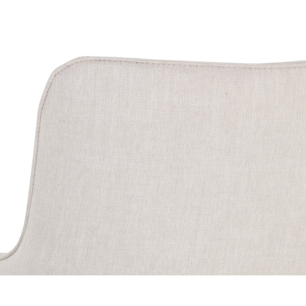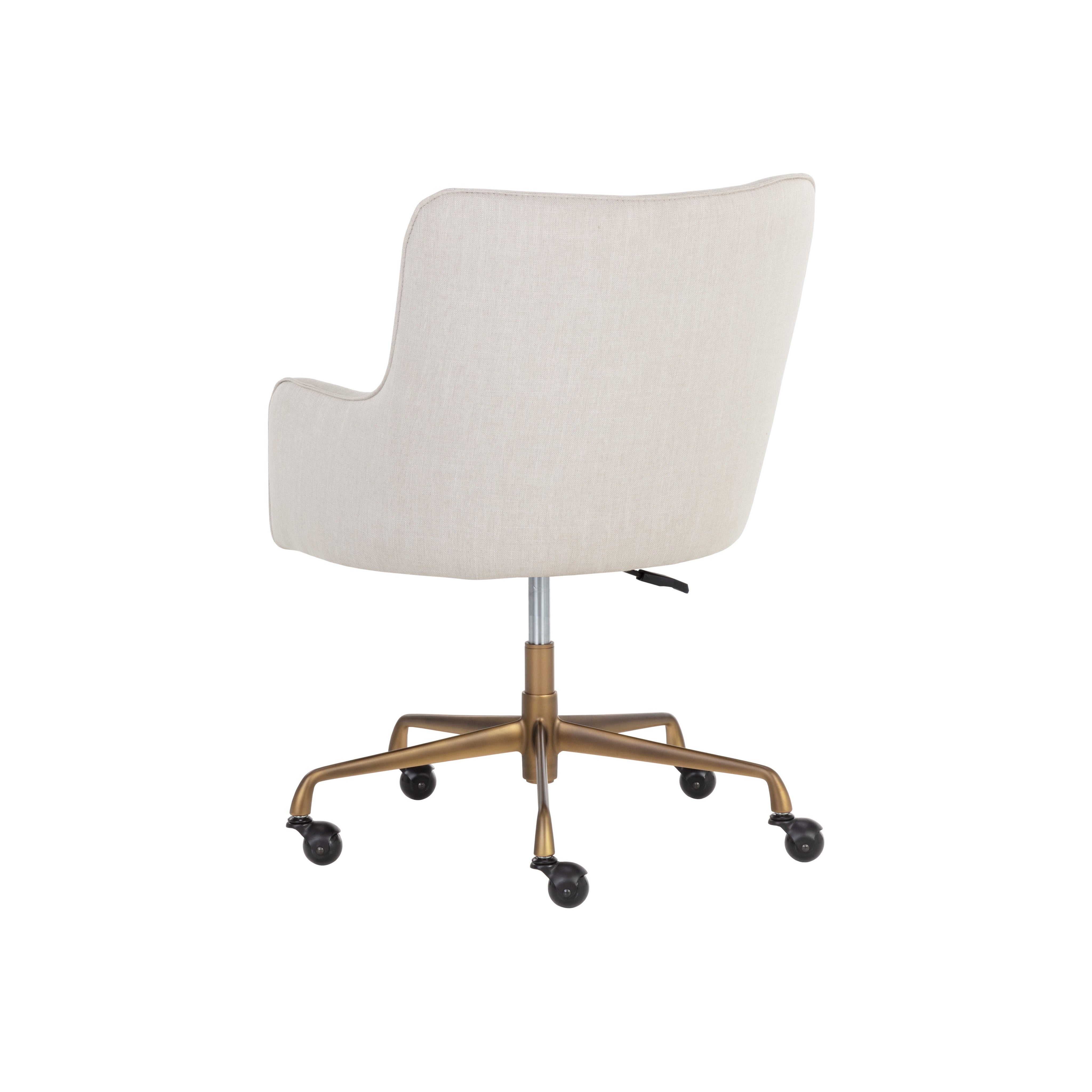 This compact barrel back office chair will add rustic and mid-century modern styling to any workspace. Stocked in our beige linen fabric with a rustic bronze aluminum base. Finished with added castors for mobility.