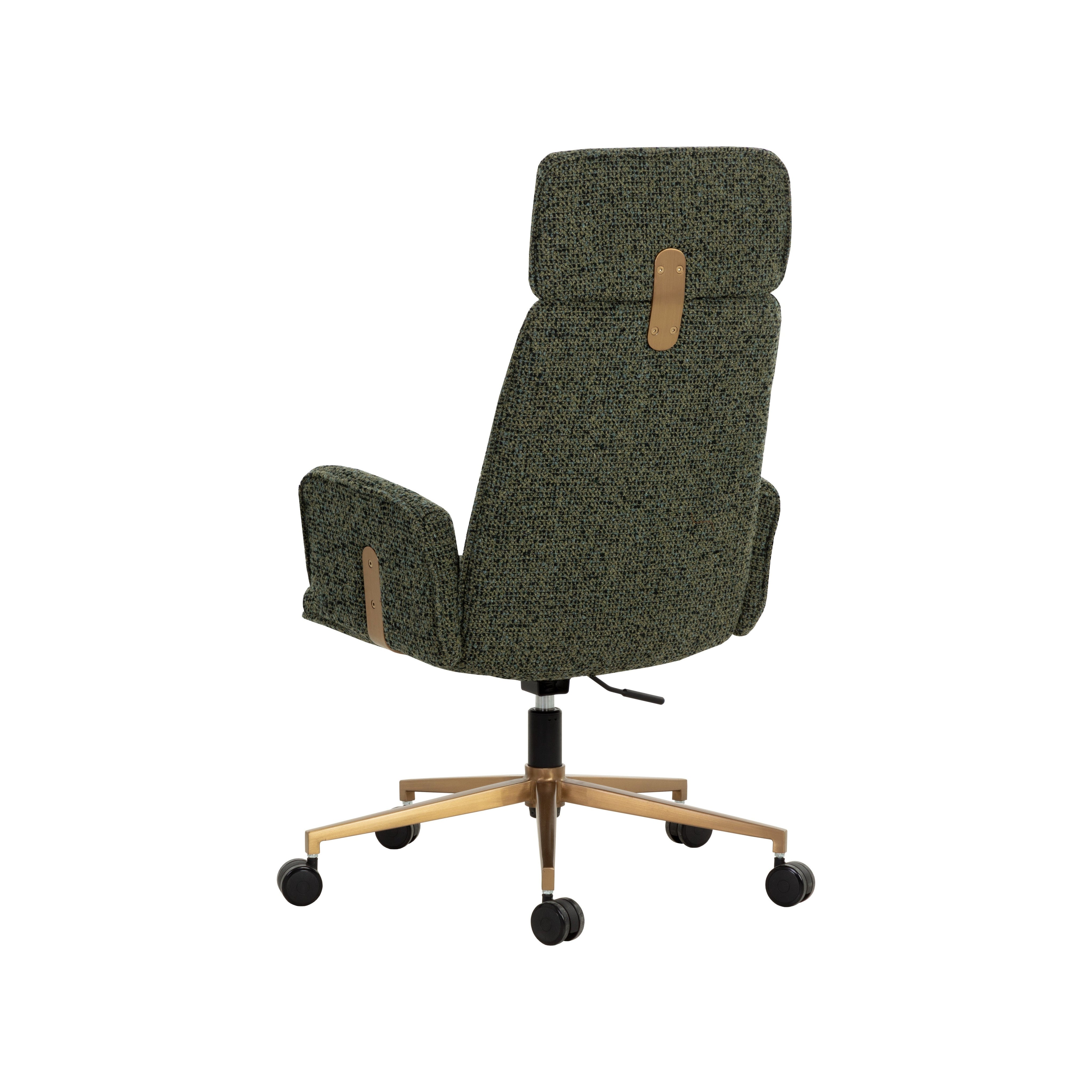 A classic silhouette and subtle curves make the Kalev Office Chair perfect for any workspace. Upholstered in textured noah meadow fabric with plush comfortable seating. Contrasting gold accents behind the arms and headrest match the sleek stainless steel base for added style.