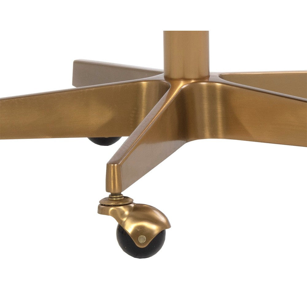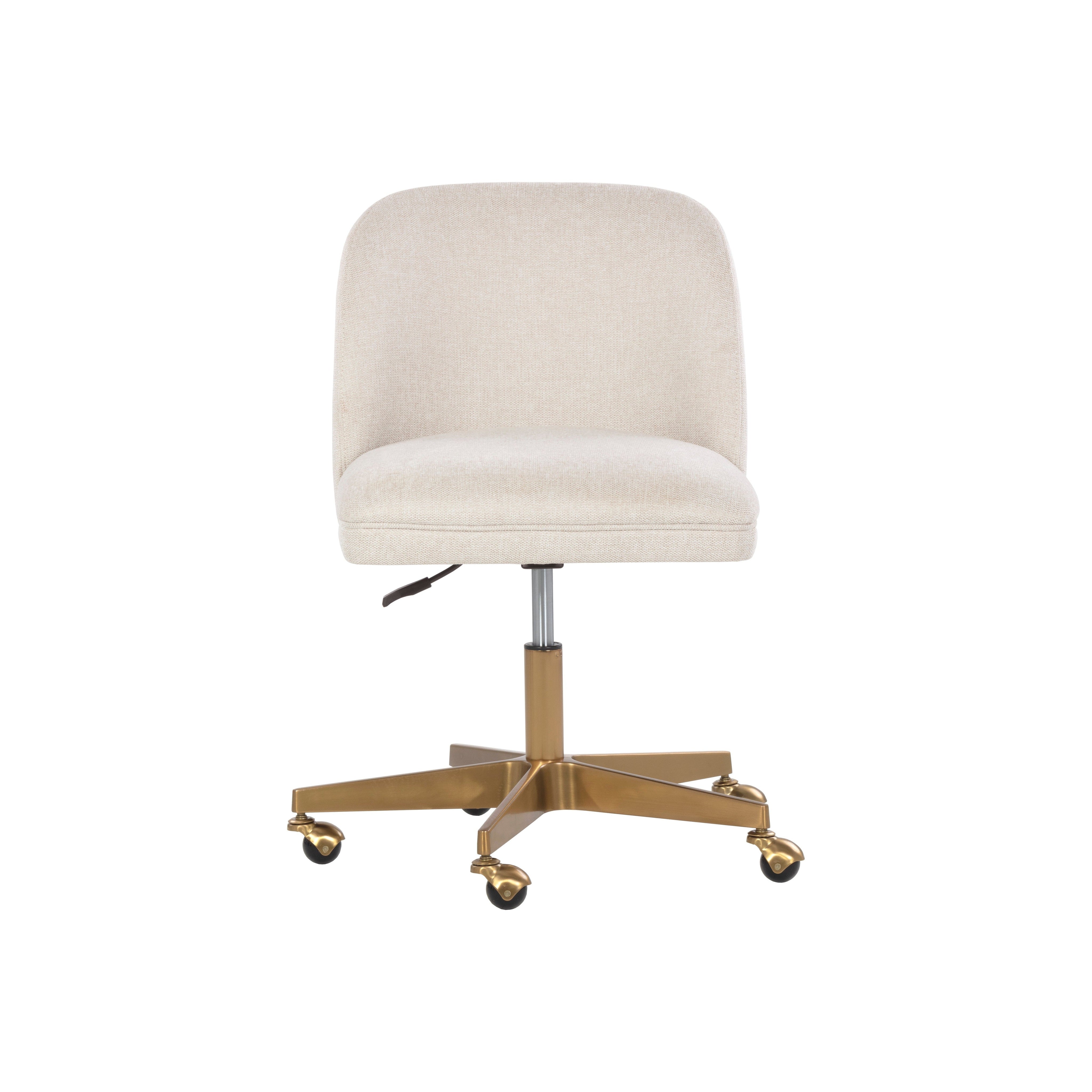 With a modern and minimalist design, this office chair is a marvelous addition to any workspace. Stocked in belfast oatmeal fabric with an adjustable seat. Completed with a gold steel base with added castors for mobility.