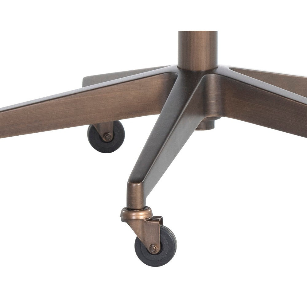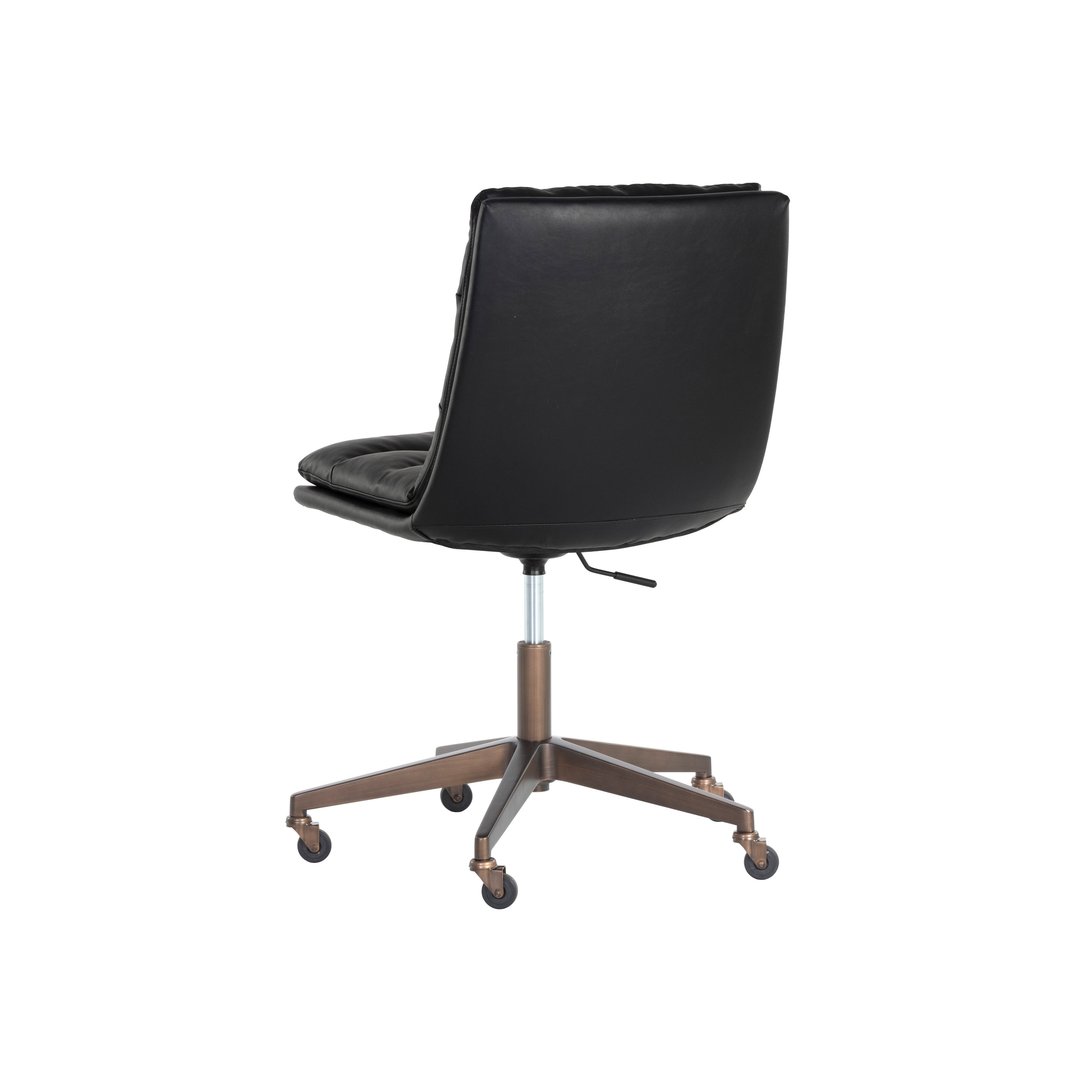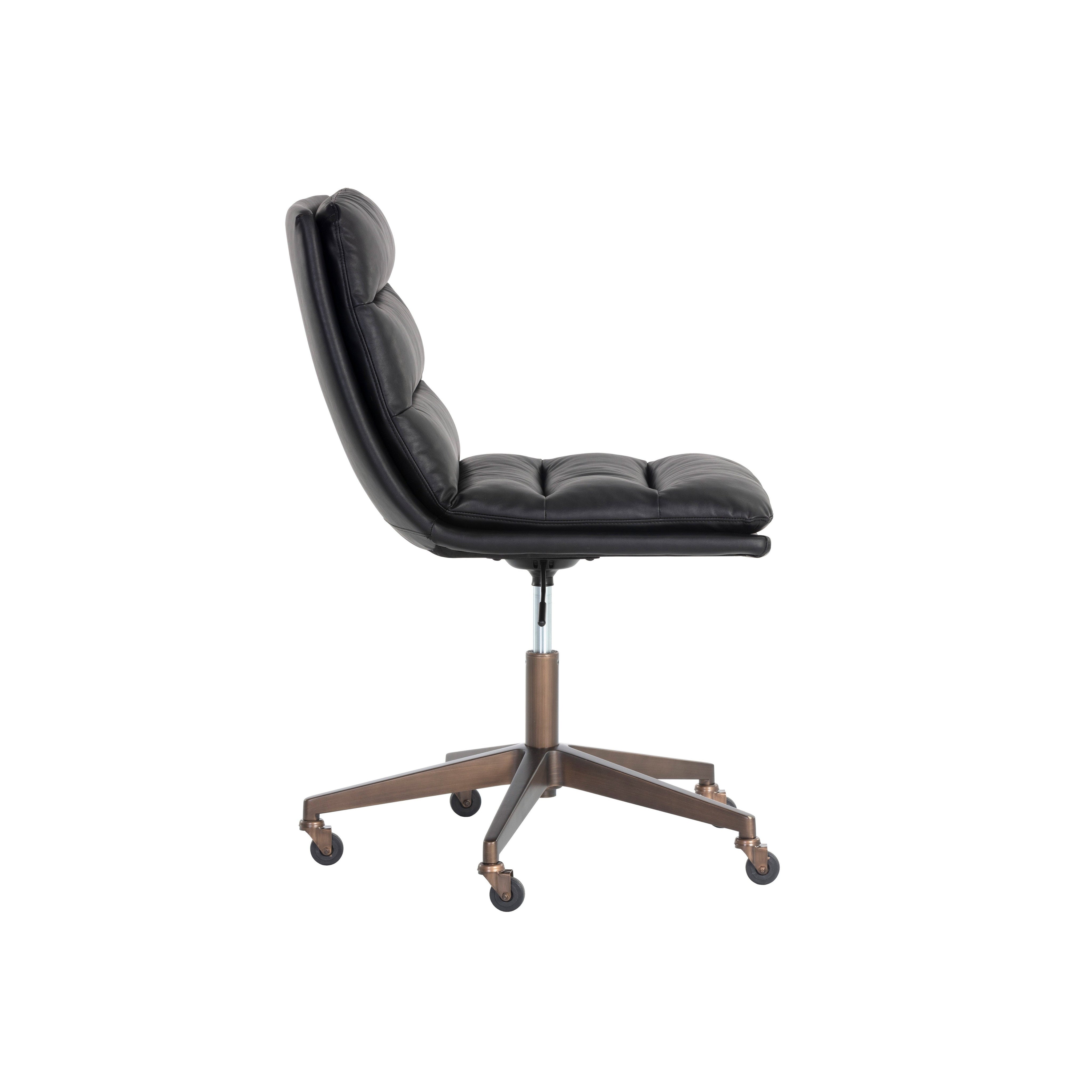 Work in maximum comfort with this mid-century modern office chair that features a generously-padded backrest. Stocked in bravo black faux leather. Completed with an antique brass steel base with added castors for mobility.