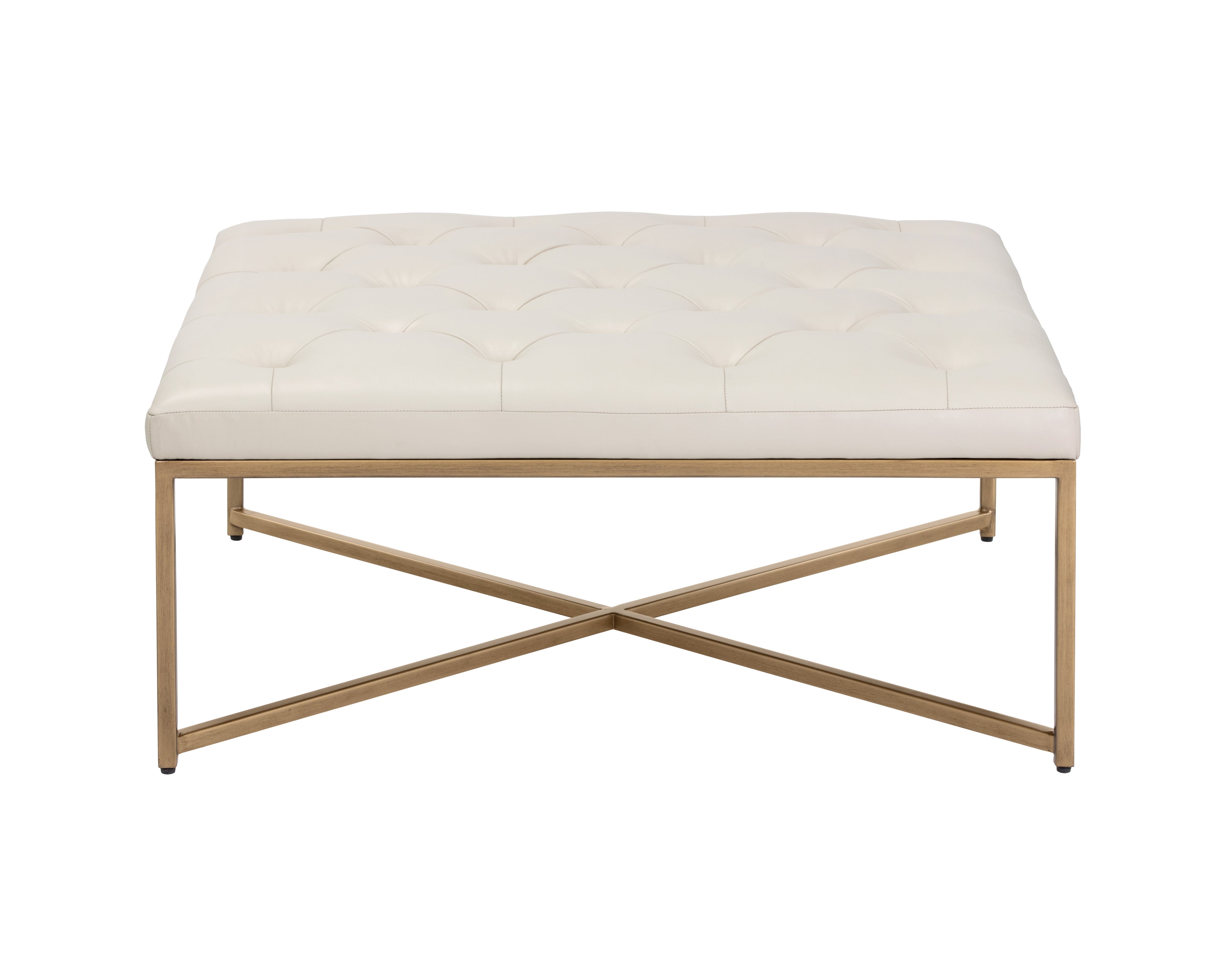 This large square ottoman exudes elegant and transitional flair. Features button tufting with an exposed x-base frame. Stocked in vintage black, camel, vanilla and peacock leather with an antique brass frame. Can be used as a coffee table or as extra seating in residential and commercial spaces. Handle with Care: This design has been crafted with top grain leather. Leather is a natural material; as such, colour variations, markings, wrinkles, grooves and light scratches are acceptable and appreciated characteristics. No two pieces are alike. Visit our Product Care page for more information on how to ensure the lasting beauty of this piece.