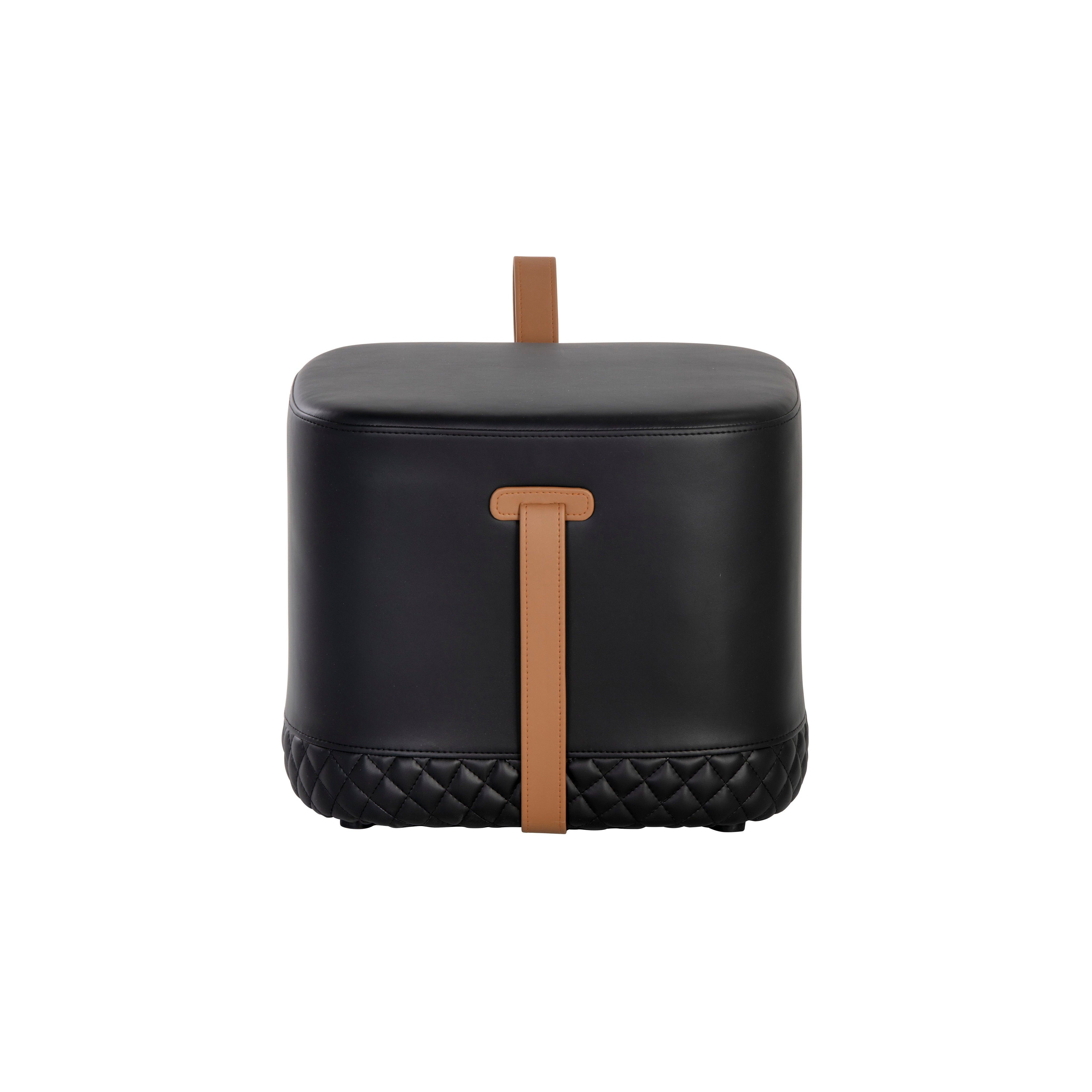 A masculine square ottoman stocked in a napa black faux leather with a contrasting napa cognac faux leather strap. Diamond tufting completes the design. Handle With Care: This design has been crafted with faux leather. Faux leather is manufactured to reflect the natural characteristics of leather; as such, colour variations, markings, wrinkles, grooves, and light scratches are appreciated characteristics. No two pieces will be alike. Visit our Product Care page for more information on how to ensure the lasting beauty of this piece.