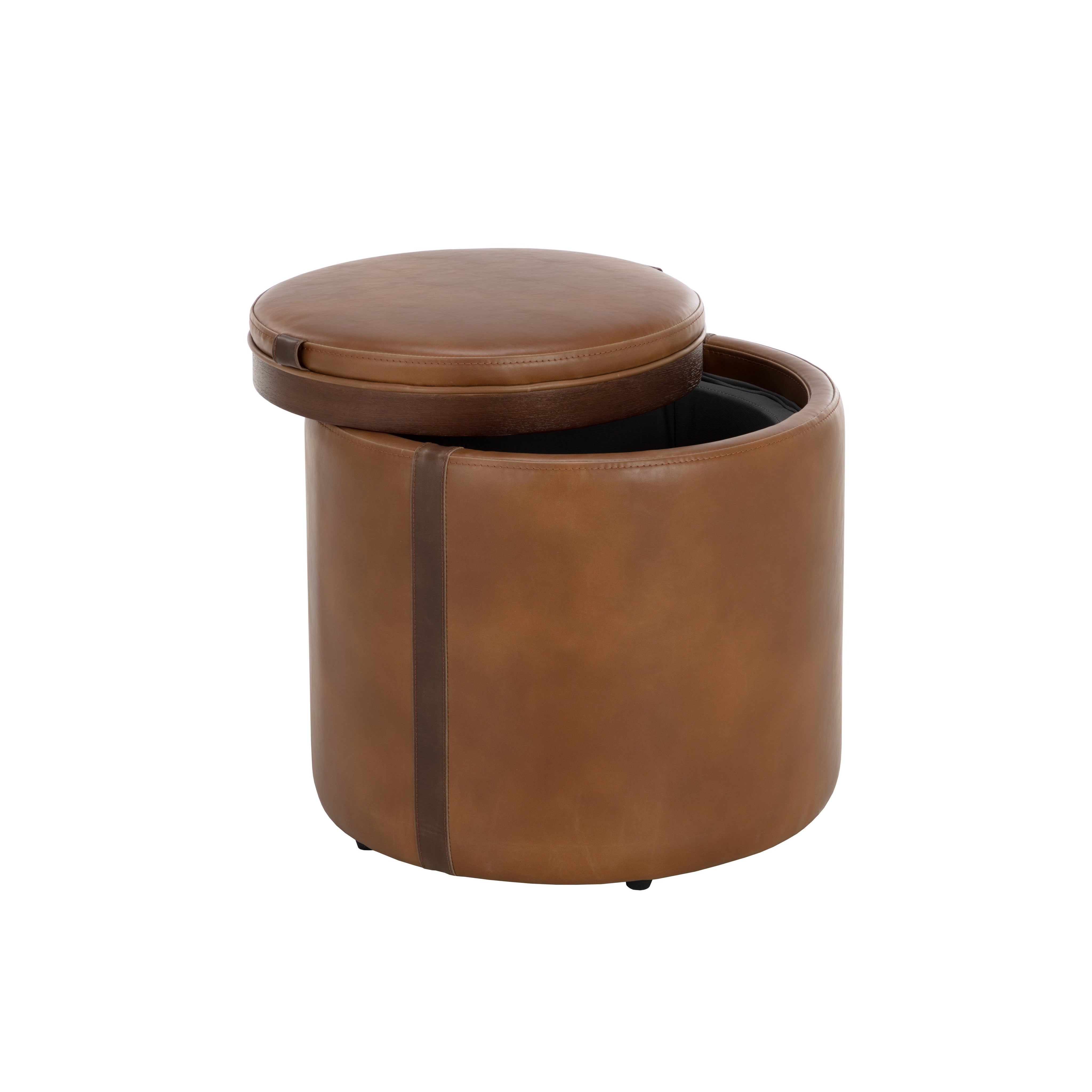 With a touch of retro influence, the Borelli Storage Ottoman will add form and function to any space. Features a handsome tobacco tan faux leather base with a contrasting autumn chestnut faux leather band. A reversible brown solid birch wood top completes this multi-purpose design. Handle With Care: This design has been crafted with faux leather. Faux leather is manufactured to reflect the natural characteristics of leather; as such, markings, wrinkles, grooves, and light scratches are appreciated characteristics. No two pieces will be alike. Visit our Product Care page for more information on how to ensure the lasting beauty of this piece.