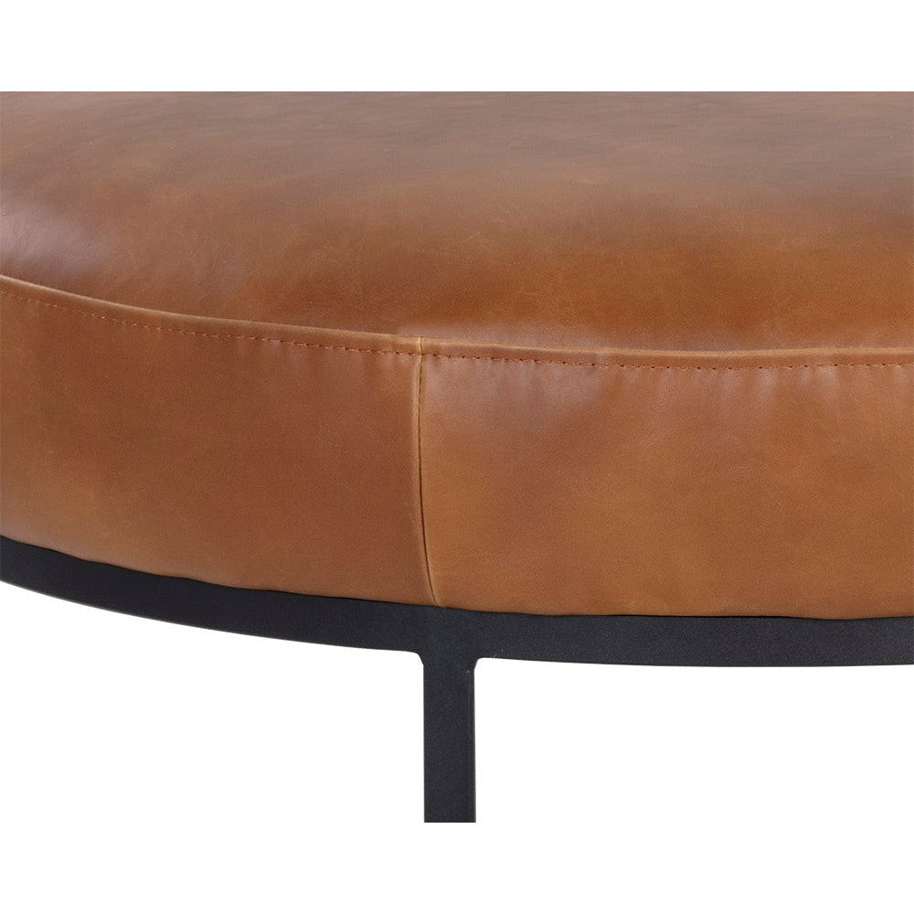 This round ottoman designed with modern elements will be the perfect additional seat or footrest in living and lounge spaces. Stocked in moto stucco fabric, and overcast grey or tobacco tan faux leather with a black iron frame. Handle With Care: This design has been crafted with faux leather. Faux leather is manufactured to reflect the natural characteristics of leather; as such, colour variations, markings wrinkles, grooves, and light scratches are appreciated characteristics. No two pieces will be alike. Visit our Product Care page for more information on how to ensure the lasting beauty of this piece.