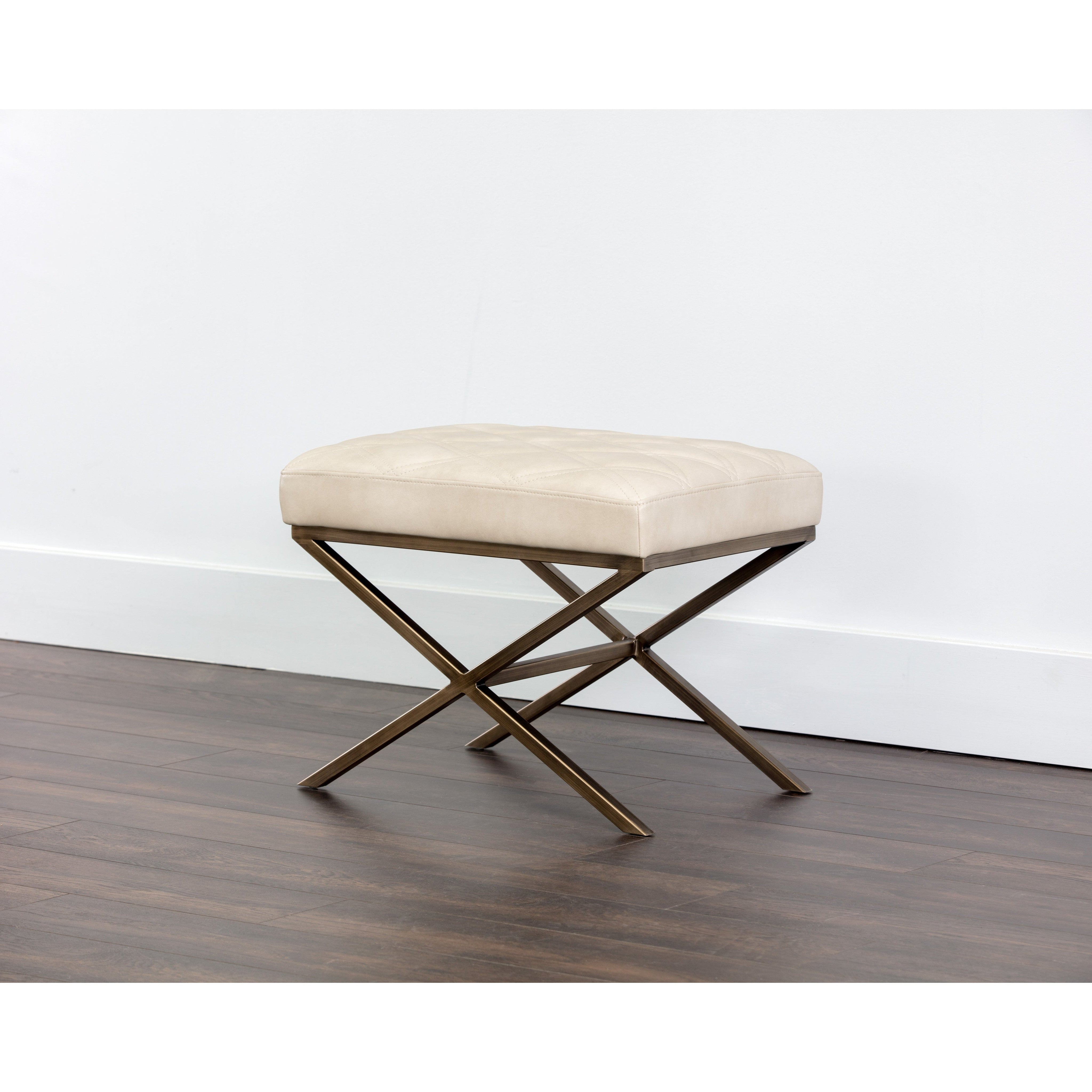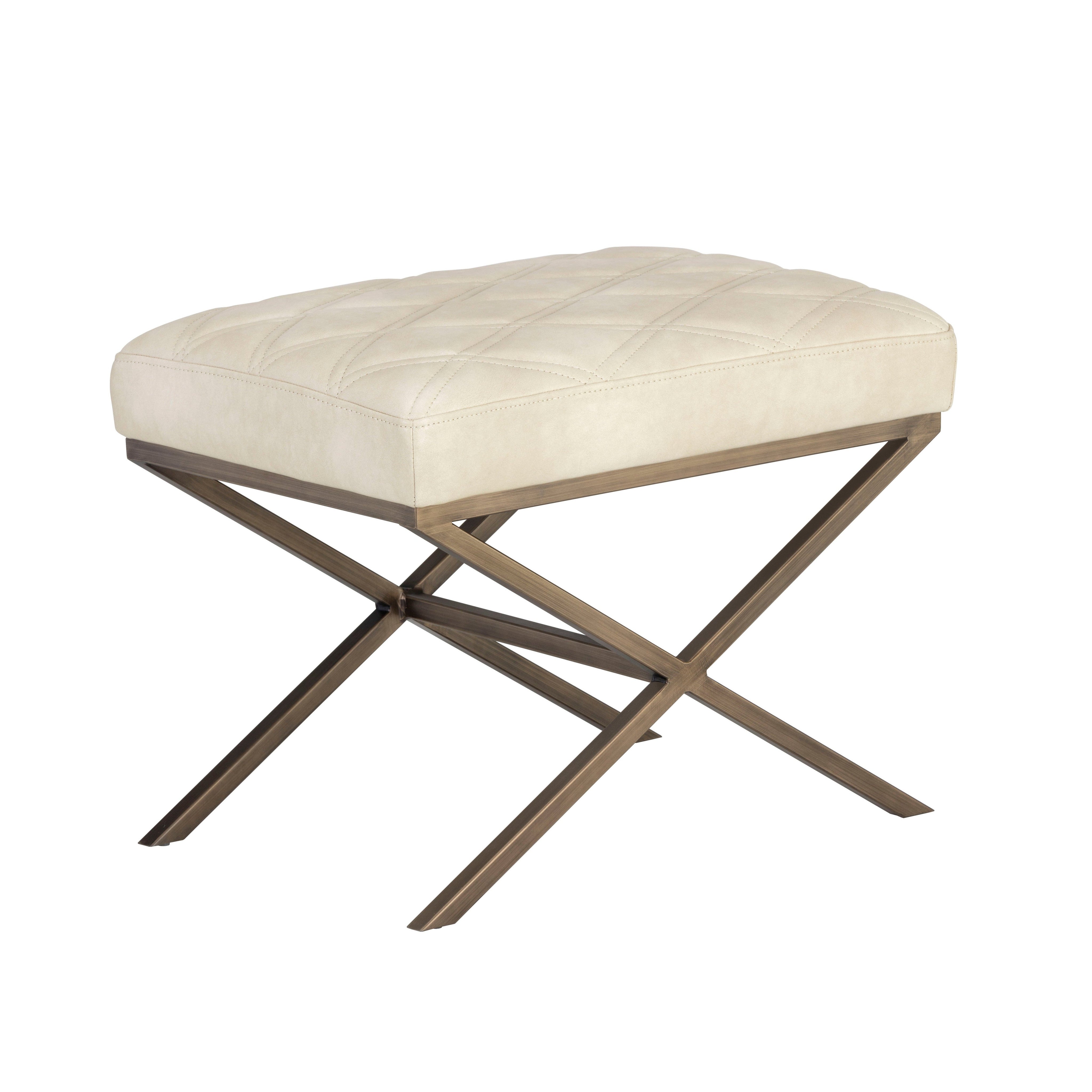 This handsome stool combines Old English flair with mid-century style. Features a double-stitched diamond pattern on the seat with an antique brass steel x-base. Stocked in our bravo cream, havana dark brown and tobacco tan faux leather. Handle With Care: This design has been crafted with faux leather. Faux leather is manufactured to reflect the natural characteristics of leather; as such, colour variations, markings, wrinkles, grooves, and light scratches are appreciated characteristics. No two pieces will be alike. Visit our Product Care page for more information on how to ensure the lasting beauty of this piece.
