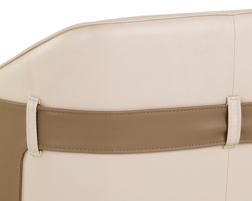 A unique barrel back barstool upholstered in supple napa beige faux leather and accented with a contrasting exterior in napa tan faux leather. Finished with black steel legs and copper foot caps. Suitable for residential and commercial spaces. Handle With Care: This design has been crafted with faux leather. Faux leather is manufactured to reflect the natural characteristics of leather; as such, colour variations, markings wrinkles, grooves, and light scratches are appreciated characteristics. No two pieces will be alike. Visit our Product Care page for more information on how to ensure the lasting beauty of this piece.