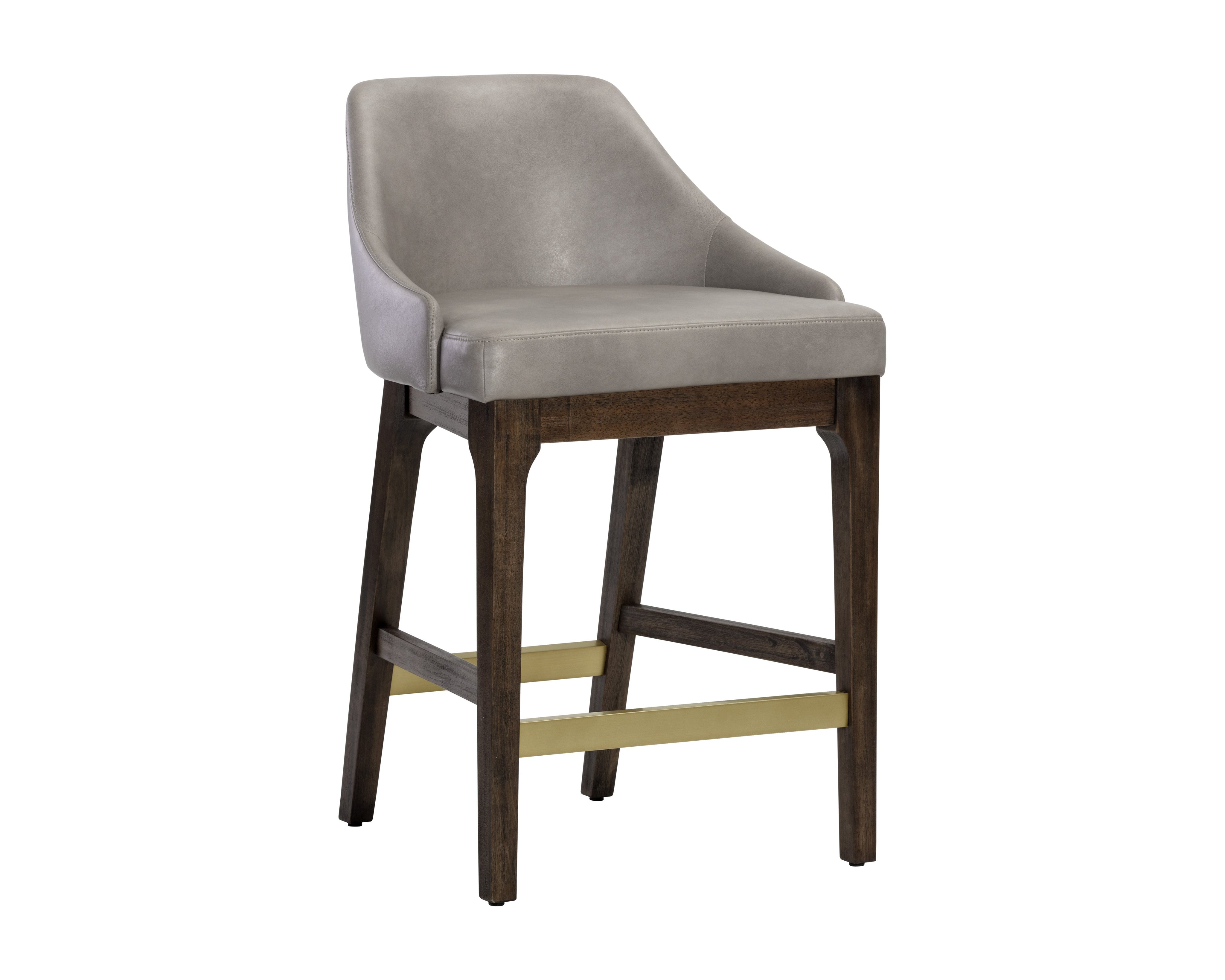 A mid-century style counter stool designed with organic elements. Crafted with solid rubberwood legs with a dark brown finish and brass finished stainless steel stretchers for added support. Available in bravo cream faux leather. Handle With Care: This design has been crafted with faux leather. Faux leather is manufactured to reflect the natural characteristics of leather; as such, colour variations, markings, wrinkles, grooves, and light scratches are appreciated characteristics. No two pieces will be alike. Visit our Product Care page for more information on how to ensure the lasting beauty of this piece.