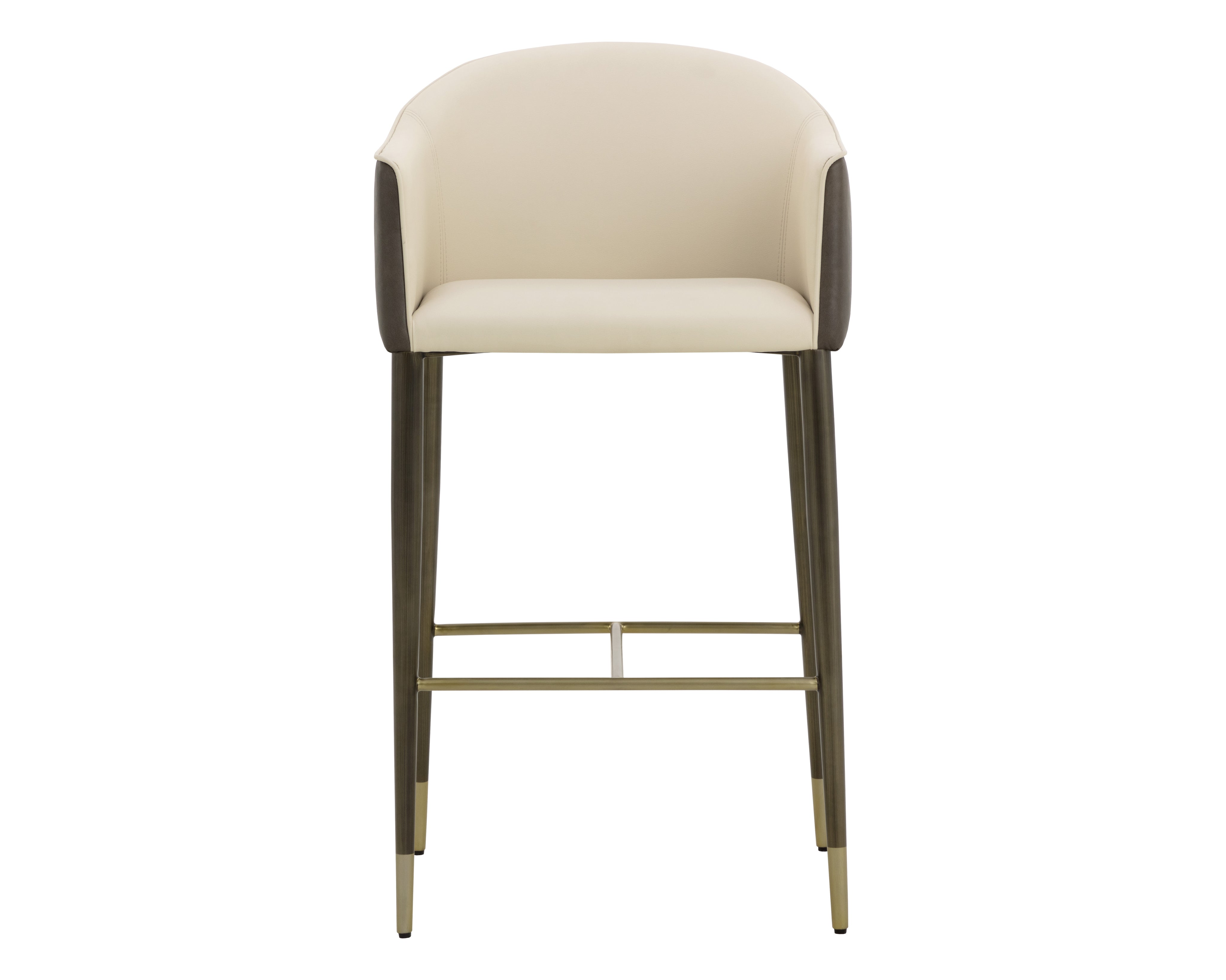 A modern barrel back barstool upholstered in dillon cream faux leather and contrasting bravo ash faux leather. Finished with dark brass brushed steel legs with stretchers and brushed champagne foot caps and stretchers.