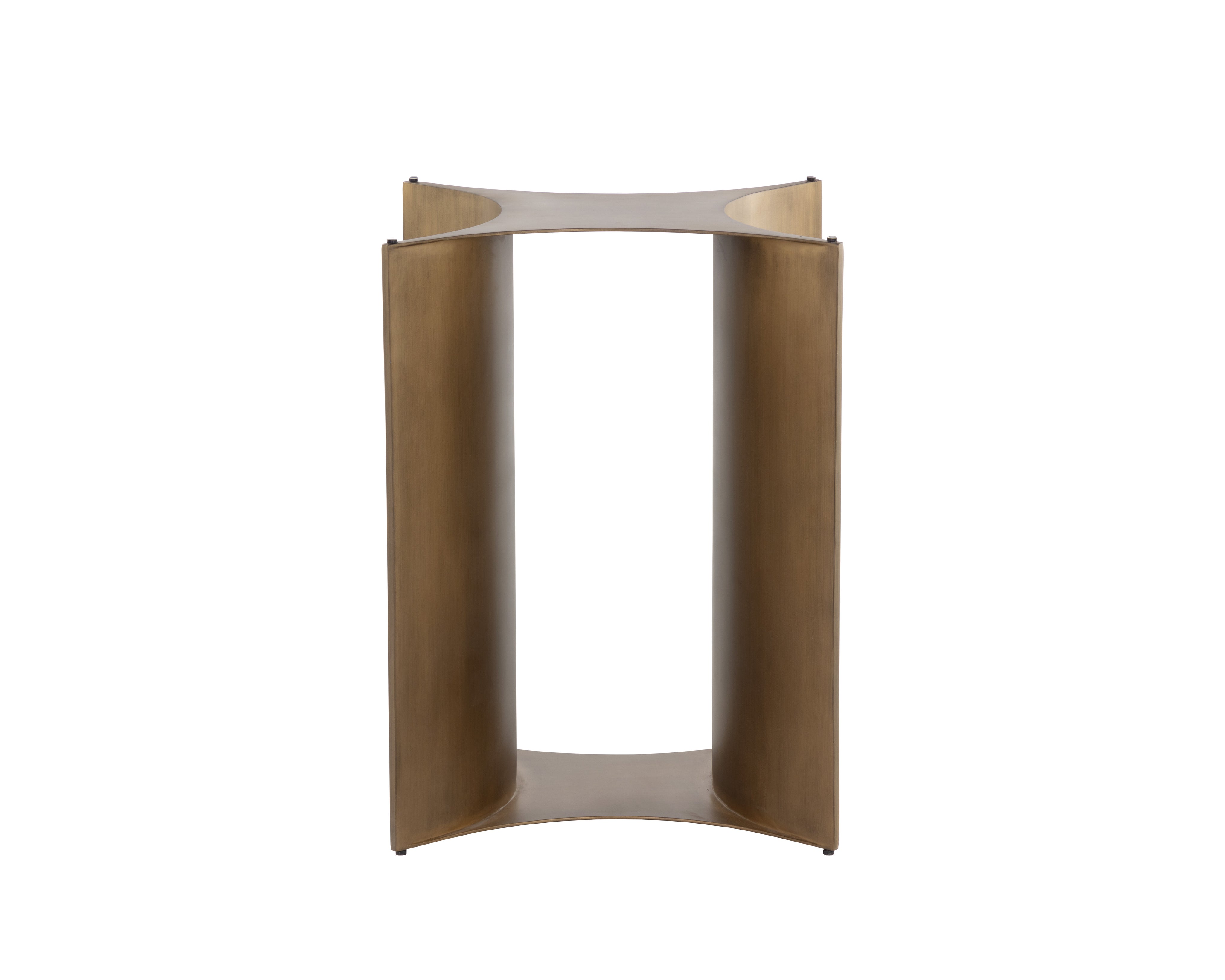 A fabulous dining table base featuring a metal composition with a brushed antique brass finish. Intended for use with a 59" round glass dining table top, or use two bases with an 86.5" glass top for a rectangular dining table combination. Table tops sold separately. Designed for use with glass table tops only. Made in India. With refined craftsmanship, this design was brought to life by skilled local artisans. Due to the nature of handcraftsmanship, unique imperfections such as fissures, markings and variations in colour and shape are welcomed and appreciated characteristics for a truly one-of-a-kind piece.