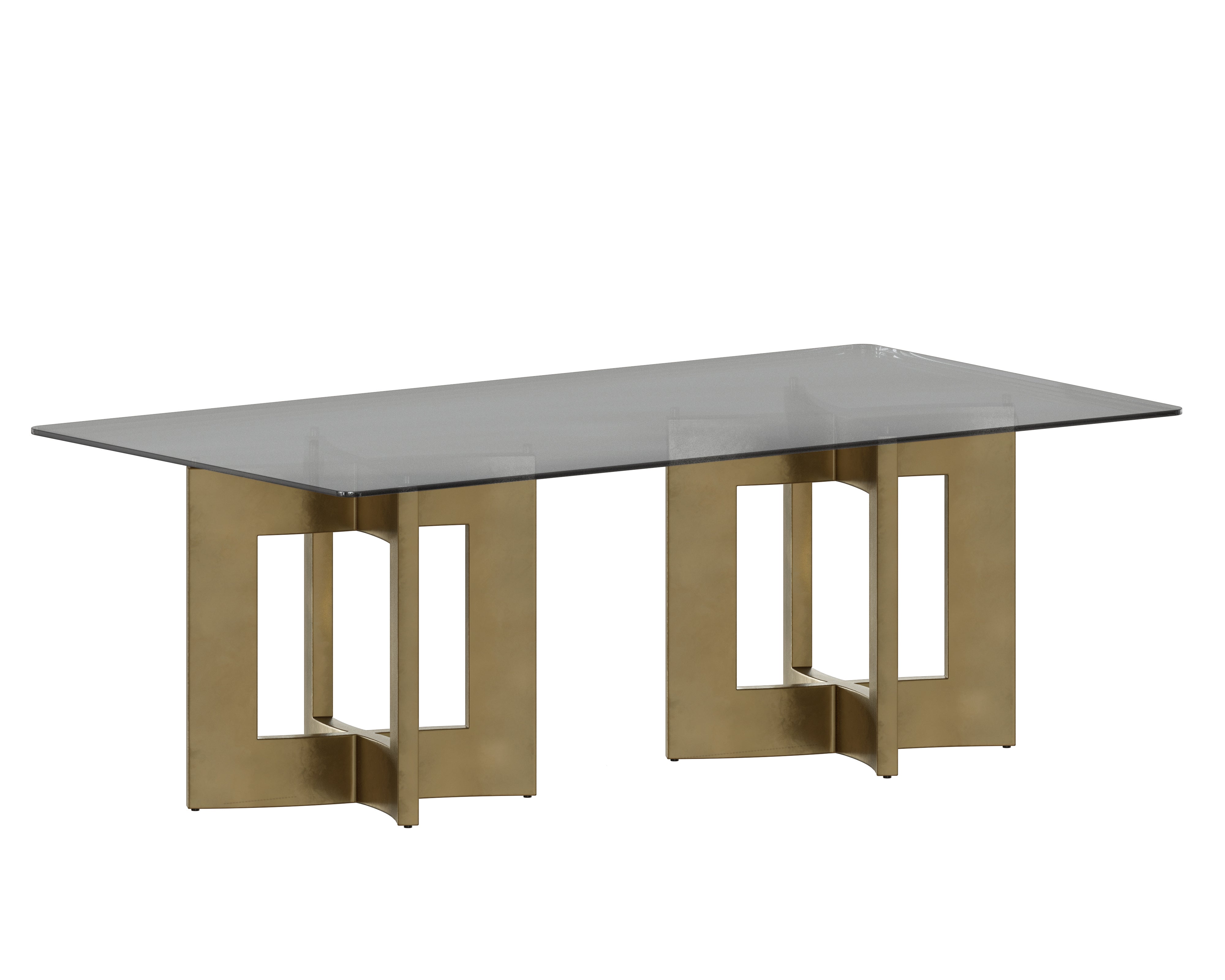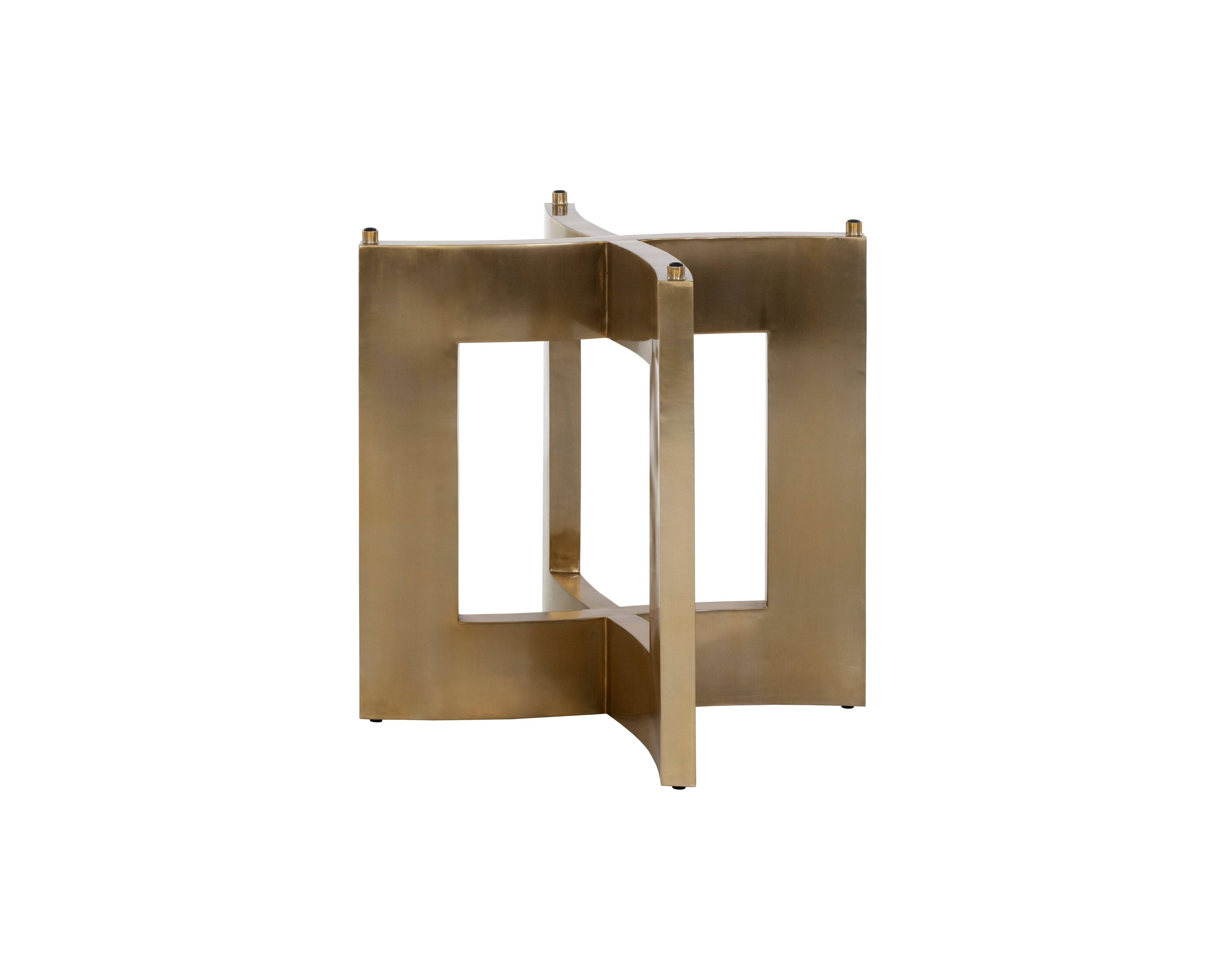 A stylish, geometric dining table base constructed from stainless steel with a gold lacquer finish. Intended for use with a 59" round glass dining table top, or use two bases with a 86.5" glass top for a rectangular dining table combination. Table tops sold separately. Designed for use with glass table tops only. Made in India. With refined craftsmanship, this design was brought to life by skilled local artisans. Due to the nature of handcraftsmanship, unique imperfections such as fissures, markings and variations in colour and shape are welcomed and appreciated characteristics for a truly one-of-a-kind piece.