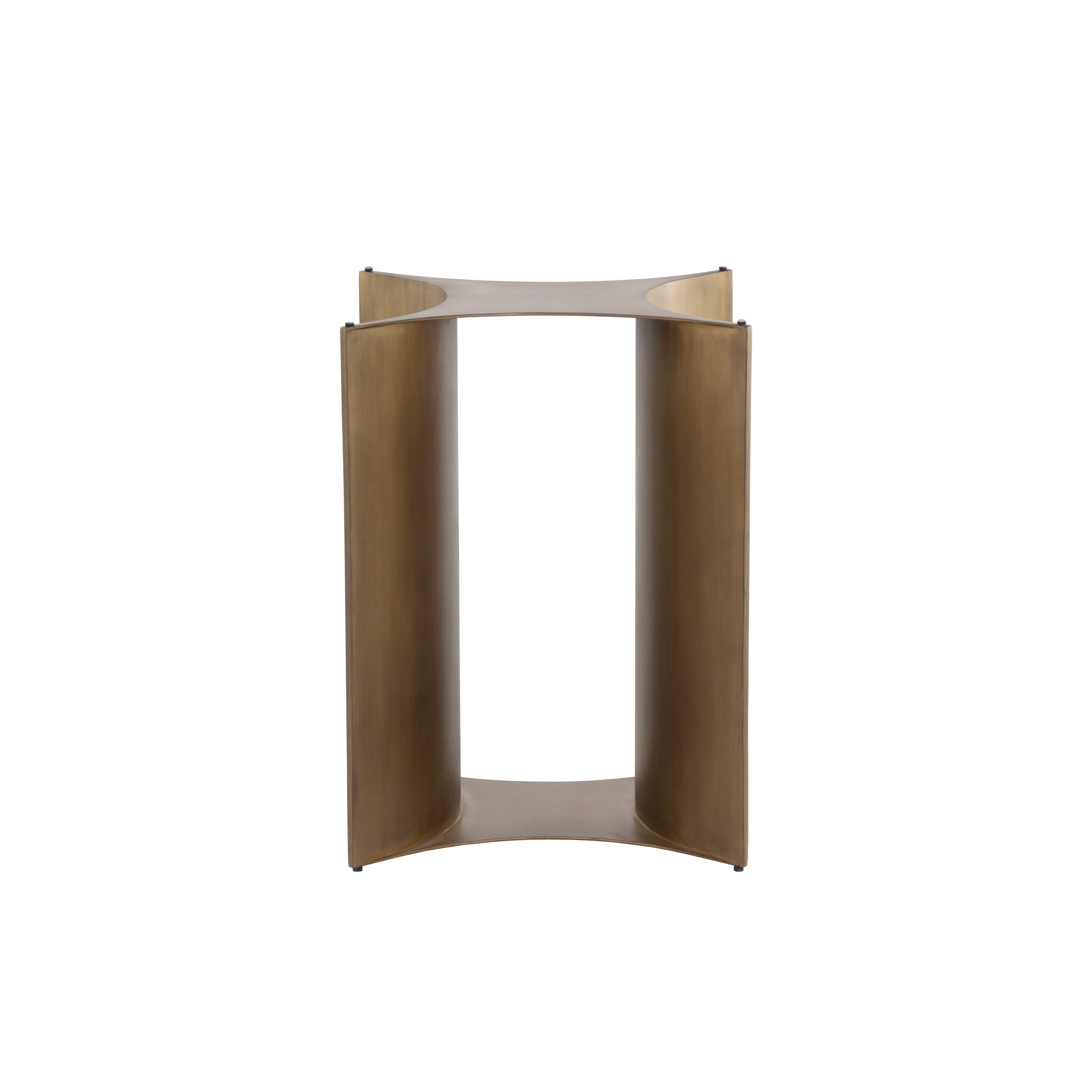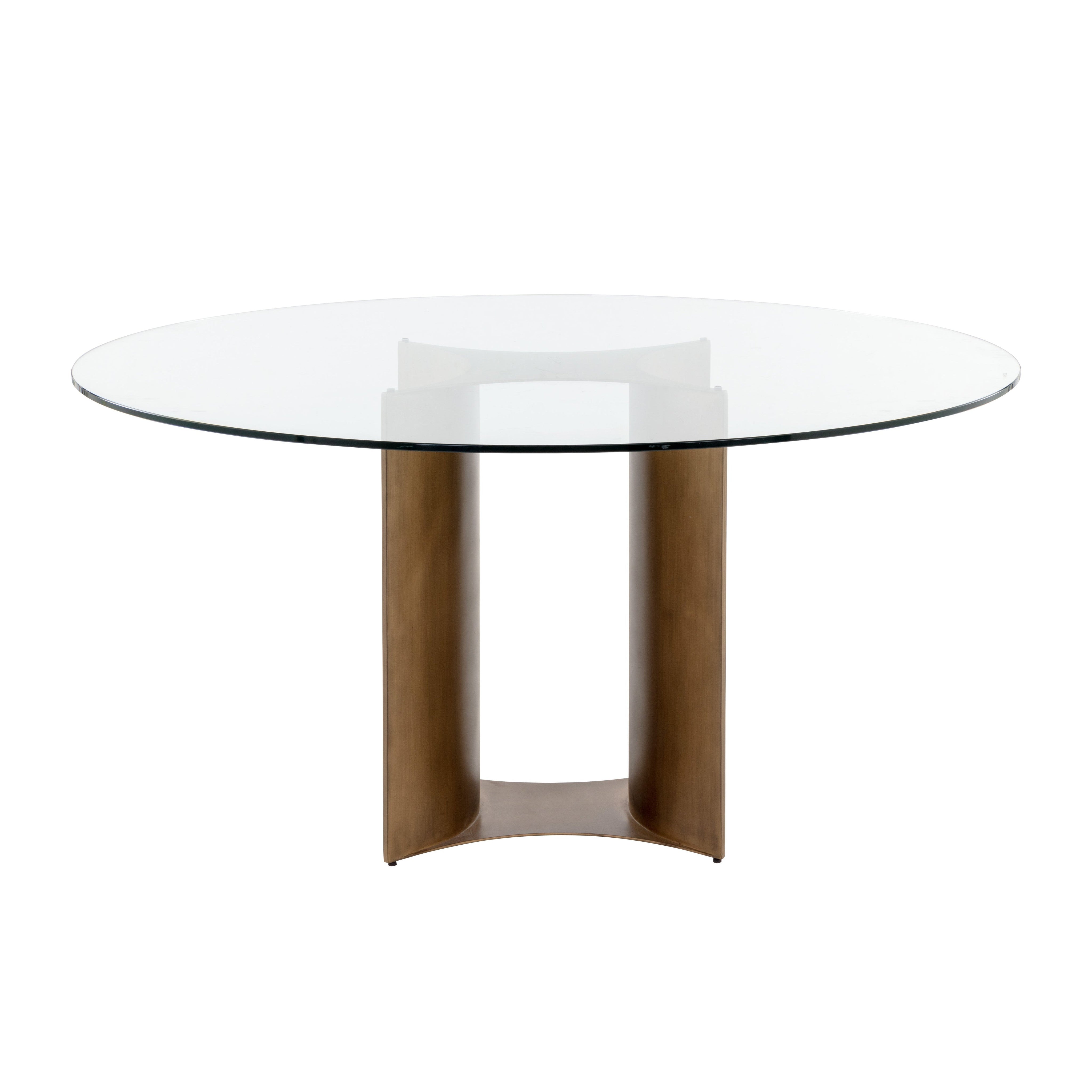 A fabulous dining table base featuring a metal composition with a brushed antique brass finish. Intended for use with a 59" round glass dining table top, or use two bases with an 86.5" glass top for a rectangular dining table combination. Table tops sold separately. Designed for use with glass table tops only. Made in India. With refined craftsmanship, this design was brought to life by skilled local artisans. Due to the nature of handcraftsmanship, unique imperfections such as fissures, markings and variations in colour and shape are welcomed and appreciated characteristics for a truly one-of-a-kind piece.