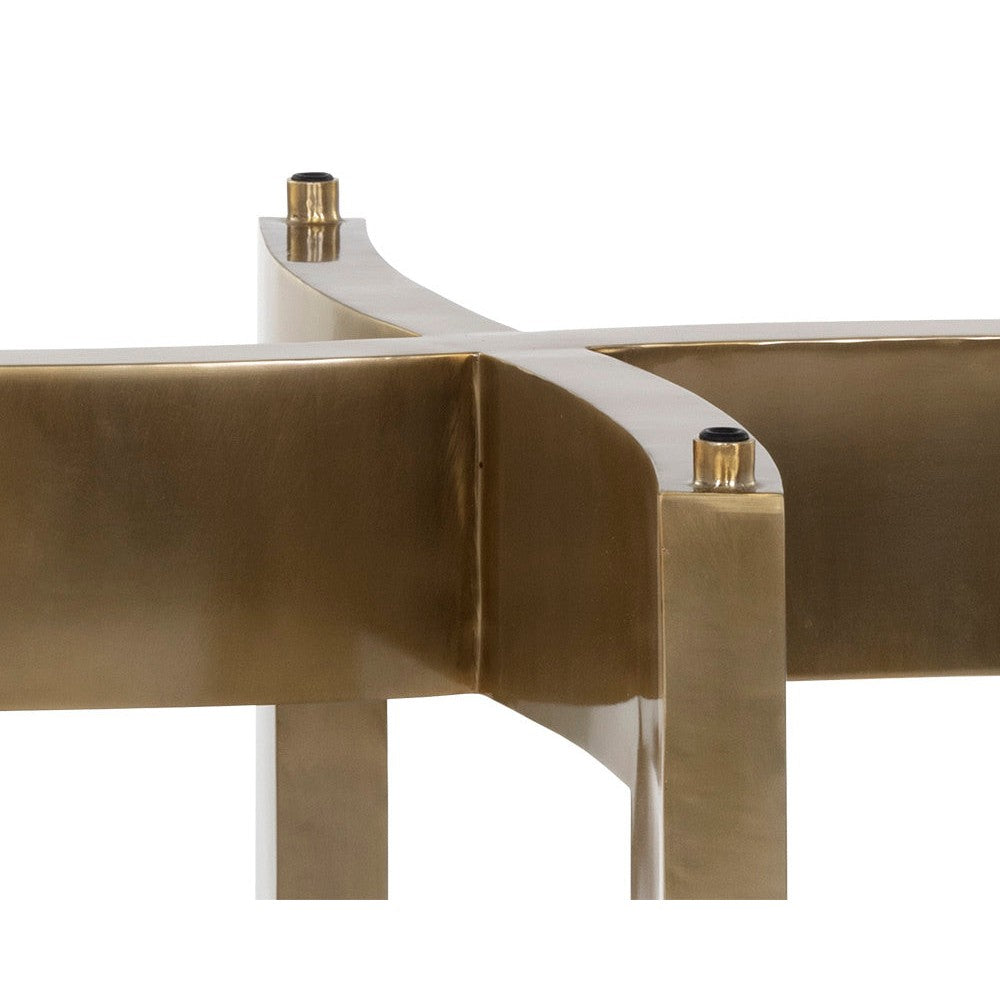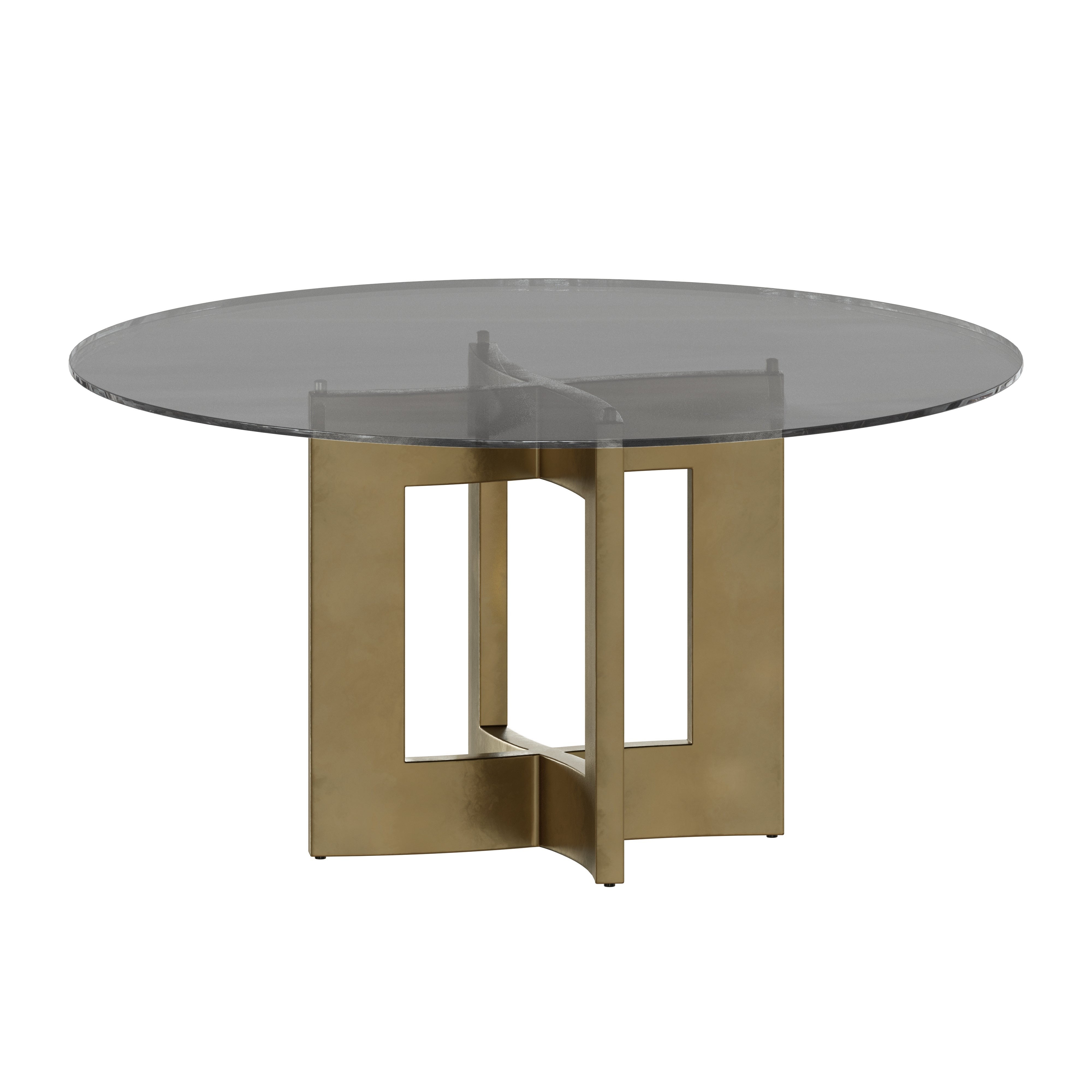A stylish, geometric dining table base constructed from stainless steel with a gold lacquer finish. Intended for use with a 59" round glass dining table top, or use two bases with a 86.5" glass top for a rectangular dining table combination. Table tops sold separately. Designed for use with glass table tops only. Made in India. With refined craftsmanship, this design was brought to life by skilled local artisans. Due to the nature of handcraftsmanship, unique imperfections such as fissures, markings and variations in colour and shape are welcomed and appreciated characteristics for a truly one-of-a-kind piece.