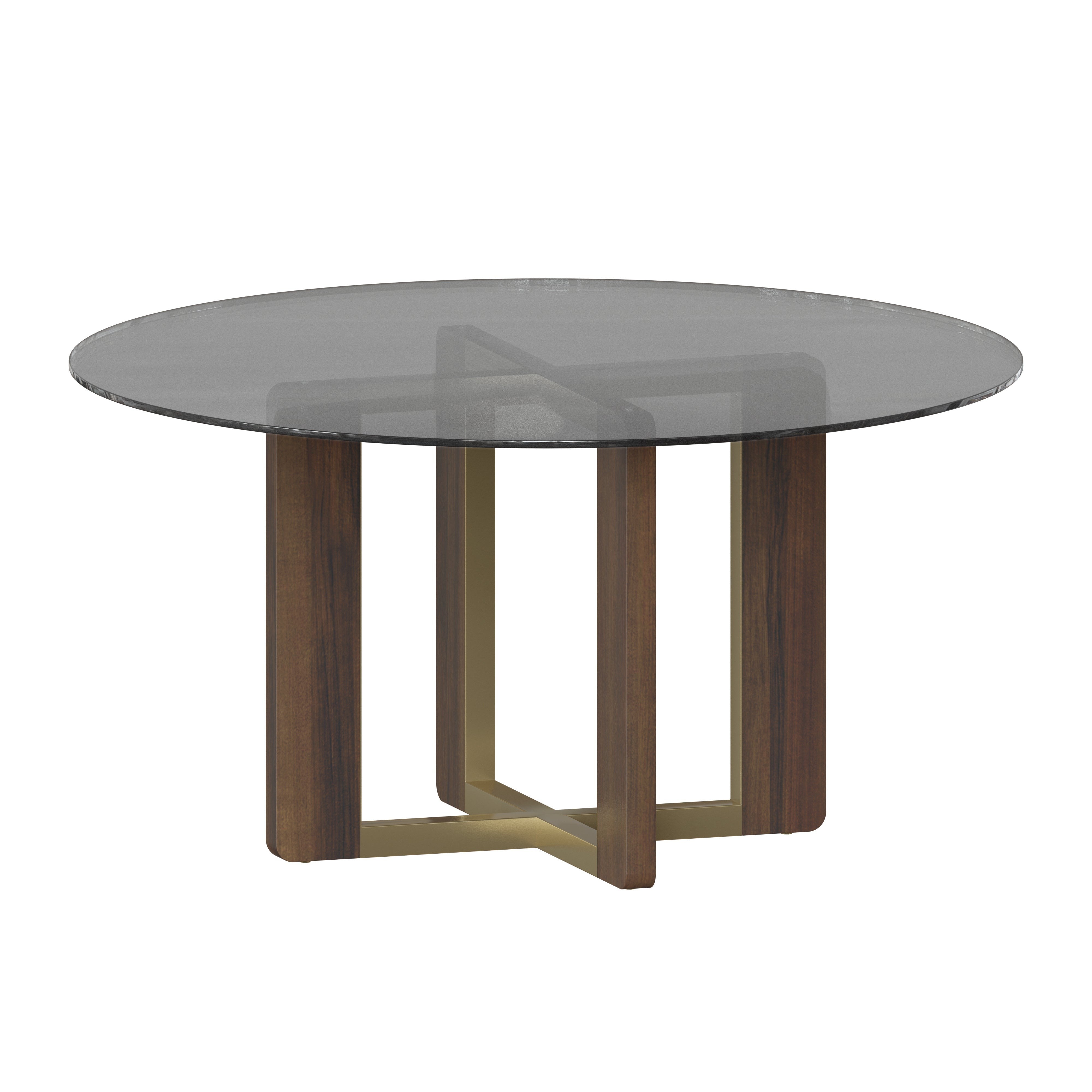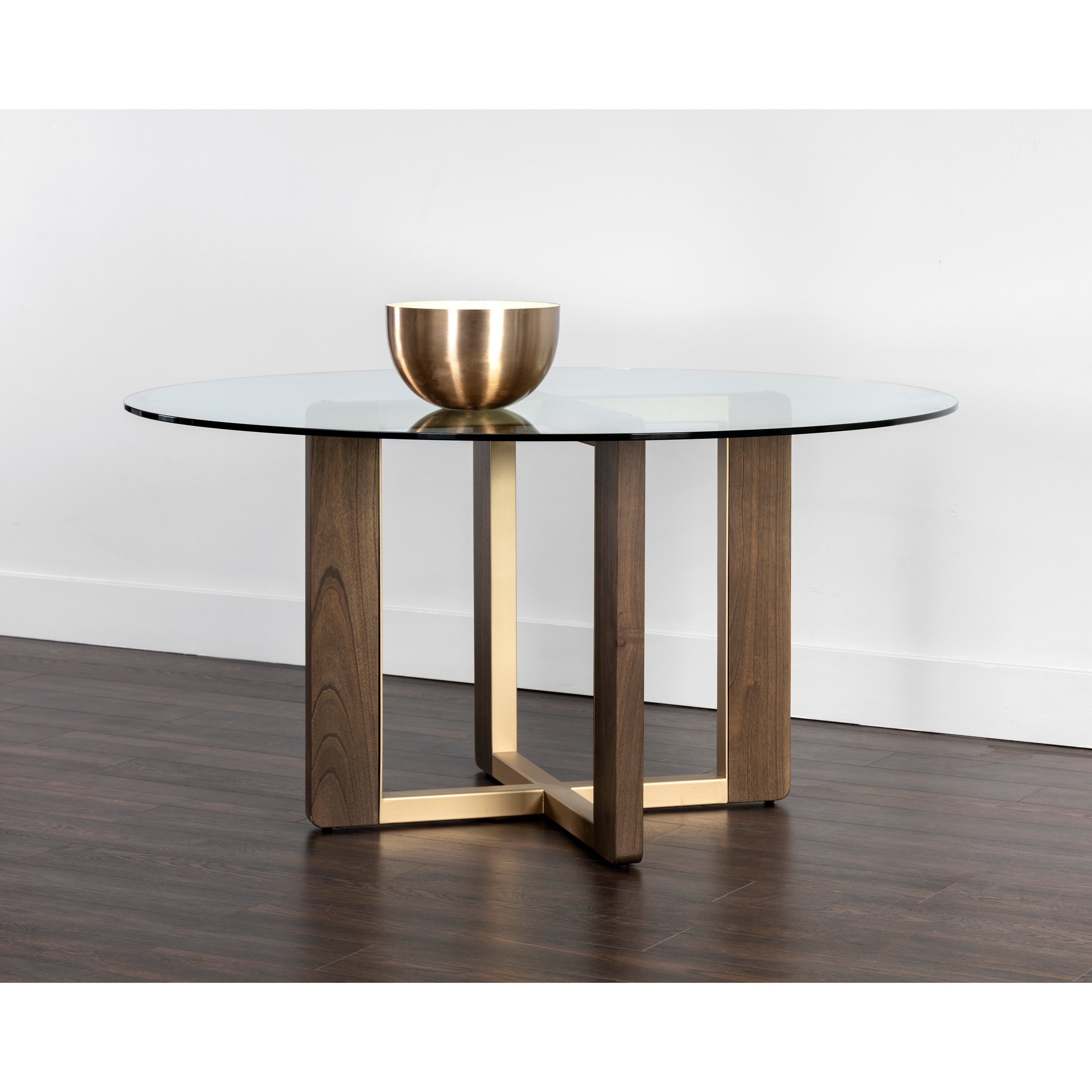A beautiful dining table base that features contrasting brown solid mindi wood paired with a gold iron finish. Intended for use with a 59" round glass dining table top, or use two bases with a 96" glass top for a rectangular table combination. Table tops sold separately. Designed for use with glass table tops only. As wood is an organic, porous material, these pieces will contain natural variation of texture and may also exhibit fine indentations and cracks. Wood pieces will also display a disparity of colour and grain, and visible knots and burls that add to the character of each piece.