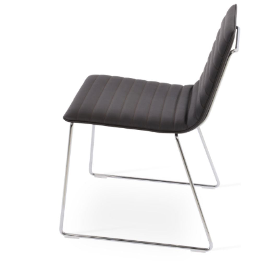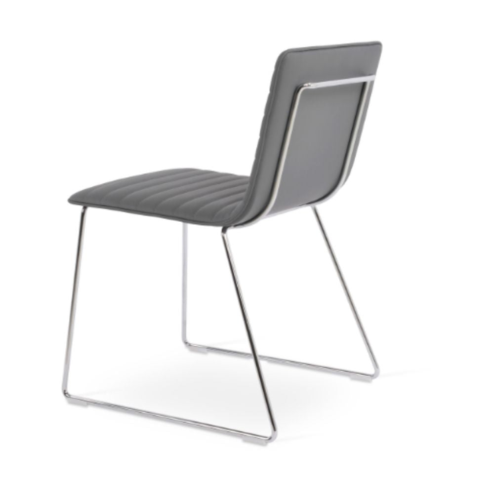 The CORONA WIRE CHAIR is a contemporary chair with a molded plywood upholstered seat. The legs are finished with a chrome base.