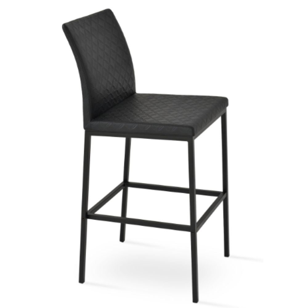 The ZEYNO METAL STOOL is a contemporary counter and bar stool with a comfortable upholstered seat and backrest on chromed steel legs which are plastic tipped. With its chromed steel legs and footrests, it becomes an enduring style for bars and counters. The seat has a steel structure with “S” shape springs for extra flexibility and strength. This steel frame is molded by an injecting polyurethane foam. Zeyno seat is upholstered with a removable velcro enclosed fabric, leatherette, PPM, leather or wool fabric slip cover. The stool is suitable for both residential and commercial use.