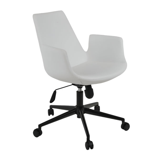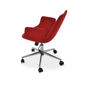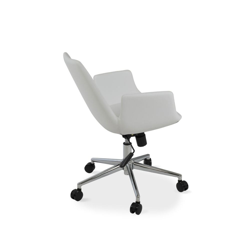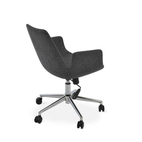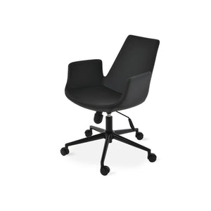 Eiffel Office Armchair is a contemporary office chair with a comfortable upholstered seat and backrest on a height-adjustable gas piston base which swivels and tilts. The chair has a chromed steel five star base with plastic casters. The seat has a steel structure with “S” shape springs for extra flexibility and strength. This steel frame molded by injecting polyurethane foam. Eiffel seat is upholstered with a removable velcro, enclosed leather, PPM, leatherette, wool as well as Camira organic wool slip cover. Eiffel Arm Office may be upholstered with variety of other colors as a special order with a minimum quantity required. The chair is suitable for both residential and commercial use.